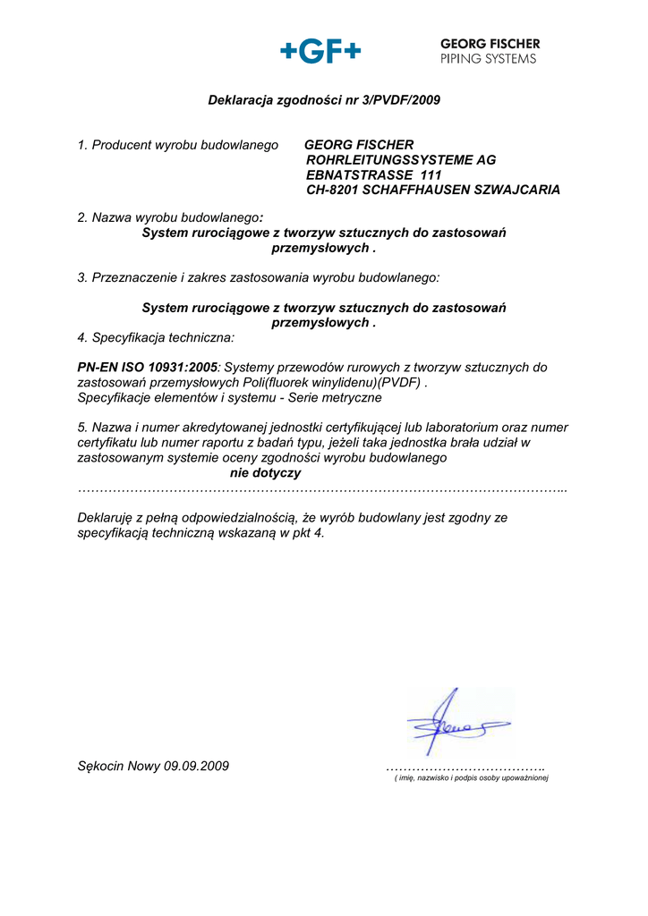 Deklaracja zgodności nr 3/PVDF/2009 1. Producent wyrobu budowlanego GEORG FISCHER ROHRLEITUNGSSYSTEME AG EBNATSTRASSE 111 CH-8201 SCHAFFHAUSEN SZWAJCARIA 2. Nazwa wyrobu budowlanego: System rurociągowe z tworzyw sztucznych do zastosowań przemysłowych . 3. Przeznaczenie i zakres zastosowania wyrobu budowlanego: System rurociągowe z tworzyw sztucznych do zastosowań przemysłowych . 4. Specyfikacja techniczna: PN-EN ISO 10931:2005: Systemy przewodów rurowych z tworzyw sztucznych do zastosowań przemysłowych Poli(fluorek winylidenu)(PVDF) . Specyfikacje elementów i systemu - Serie metryczne 5. Nazwa i numer akredytowanej jednostki certyfikującej lub laboratorium oraz numer certyfikatu lub numer raportu z badań typu, jeżeli taka jednostka brała udział w zastosowanym systemie oceny zgodności wyrobu budowlanego nie dotyczy 0000000000000000000000000000000000000.. Deklaruję z pełną odpowiedzialnością, że wyrób budowlany jest zgodny ze specyfikacją techniczną wskazaną w pkt 4. Sękocin Nowy 09.09.2009 000000000000. ( imię, nazwisko i podpis osoby upoważnionej