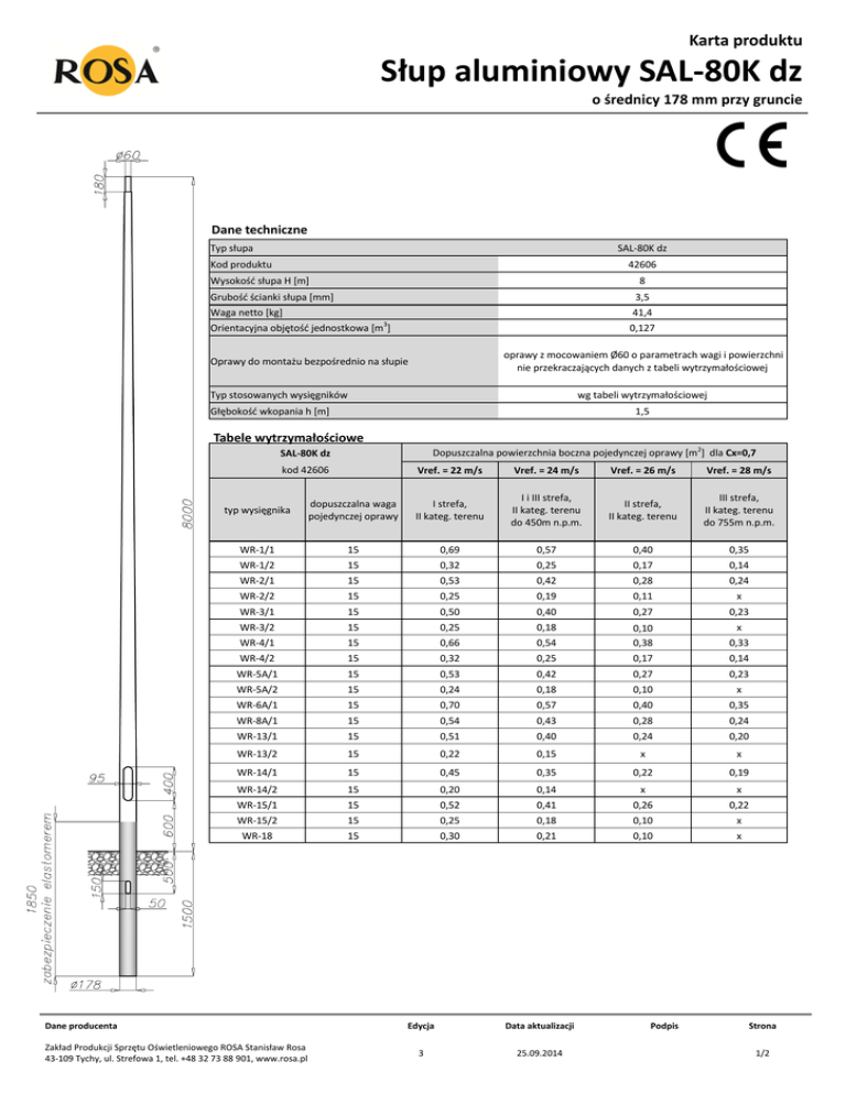 Karta produktu Słup aluminiowy SAL-80K dz o średnicy 178 mm przy gruncie Dane techniczne Typ słupa SAL-80K dz Kod produktu 42606 Wysokość słupa H [m] 8 Grubość ścianki słupa [mm] 3,5 Waga netto [kg] 41,4 3 Orientacyjna objętość jednostkowa [m ] 0,127 oprawy z mocowaniem Ø60 o parametrach wagi i powierzchni nie przekraczających danych z tabeli wytrzymałościowej Oprawy do montażu bezpośrednio na słupie Typ stosowanych wysięgników wg tabeli wytrzymałościowej Głębokość wkopania h [m] 1,5 Tabele wytrzymałościowe Dopuszczalna powierzchnia boczna pojedynczej oprawy [m2] dla Cx=0,7 SAL-80K dz kod 42606 Vref. = 22 m/s Vref. = 24 m/s Vref. = 26 m/s Vref. = 28 m/s typ wysięgnika dopuszczalna waga pojedynczej oprawy I strefa, II kateg. terenu I i III strefa, II kateg. terenu do 450m n.p.m. II strefa, II kateg. terenu III strefa, II kateg. terenu do 755m n.p.m. WR-1/1 15 0,69 0,57 0,40 0,35 WR-1/2 15 0,32 0,25 0,17 0,14 WR-2/1 15 0,53 0,42 0,28 0,24 WR-2/2 15 0,25 0,19 0,11 x WR-3/1 15 0,50 0,40 0,27 0,23 WR-3/2 15 0,25 0,18 x WR-4/1 15 0,66 0,54 0,10 0,38 0,33 WR-4/2 15 0,32 0,25 0,17 0,14 WR-5A/1 15 0,53 0,42 0,27 0,23 WR-5A/2 15 0,24 0,18 0,10 x WR-6A/1 15 0,70 0,57 0,40 0,35 WR-8A/1 15 0,54 0,43 0,28 0,24 WR-13/1 15 0,51 0,40 0,24 0,20 WR-13/2 15 0,22 0,15 x x WR-14/1 15 0,45 0,35 0,22 0,19 WR-14/2 15 0,20 0,14 x x WR-15/1 15 0,52 0,41 0,26 0,22 WR-15/2 WR-18 15 15 0,25 0,30 0,18 0,21 0,10 0,10 x x Dane producenta Zakład Produkcji Sprzętu Oświetleniowego ROSA Stanisław Rosa 43-109 Tychy, ul. Strefowa 1, tel. +48 32 73 88 901, www.rosa.pl Edycja Data aktualizacji 3 25.09.2014 Podpis Strona 1/2 Karta produktu Słup aluminiowy SAL-80K dz o średnicy 178 mm przy gruncie Tabele wytrzymałościowe Dopuszczalna powierzchnia boczna pojedynczej oprawy [m2] dla Cx=0,7 SAL-80K dz kod 42606 Vref. = 22 m/s Vref. = 24 m/s Vref. = 26 m/s Vref. = 28 m/s typ wysięgnika dopuszczalna waga pojedynczej oprawy I strefa, II kateg. terenu I i III strefa, II kateg. terenu do 450m n.p.m. II strefa, II kateg. terenu III strefa, II kateg. terenu do 755m n.p.m. WR-61 15 0,29 0,20 x x WRP1/1,0/0,7/5 15 0,49 0,39 0,25 0,21 WRP1/1,0/1,2/5 15 0,39 0,30 0,17 0,14 WRP1/1,5/0,7/5 15 0,40 0,30 0,18 0,14 WRP1/1,5/1,2/5 15 0,30 0,22 0,10 x WRP2/1,0/0,7/5 15 0,24 0,18 x x WRP2/1,0/1,2/5 15 0,17 0,12 x x WRP2/1,5/0,7/5 15 0,19 0,13 x x WRP2/1,5/1,2/5 15 0,12 x x x WN-1 15 0,59 (Cx=1) 0,49 (Cx=1) 0,36 (Cx=1) 0,32 (Cx=1) WN-2 15 0,27 (Cx=1) 0,22 (Cx=1) 0,16 (Cx=1) 0,14 (Cx=1) WN-21 15 0,25 (Cx=1) 0,2 (Cx=1) 0,14 (Cx=1) 0,12 (Cx=1) WN-3 10 0,2 (Cx=1) 0,16 (Cx=1) 0,11 (Cx=1) x Dopuszczalna powierzchnia boczna opraw i wysięgników [m2] dla Cx=1 SAL-80K dz kod 42606 Vref. = 22 m/s Vref. = 24 m/s Vref. = 26 m/s Vref. = 28 m/s Dopuszczalna masa opraw i wysięgników [kg] I strefa, II kateg. terenu I i III strefa, II kateg. terenu do 450m n.p.m. II strefa, II kateg. terenu III strefa, II kateg. terenu do 755m n.p.m. 30 0,61 (Cx=1) 0,51 (Cx=1) 0,38 (Cx=1) 0,34 (Cx=1) powierzchnia: aluminium szlifowane anodowanie w 10 kolorach, każdy z możliwością wybłyszczania opcja malowania proszkowego wg RAL (inne farby na życzenie klienta) zabezpieczenie elastomerem w kolorze słupa do wysokości 350 mm (inna wysokość na życzenie klienta) wnęka standard ROSA pakowanie: włóknina polipropylenowa certyfikat bezpieczeństwa biernego 100NE Dane producenta Zakład Produkcji Sprzętu Oświetleniowego ROSA Stanisław Rosa 43-109 Tychy, ul. Strefowa 1, tel. +48 32 73 88 901, www.rosa.pl Edycja Data aktualizacji 3 25.09.2014 Podpis Strona 2/2