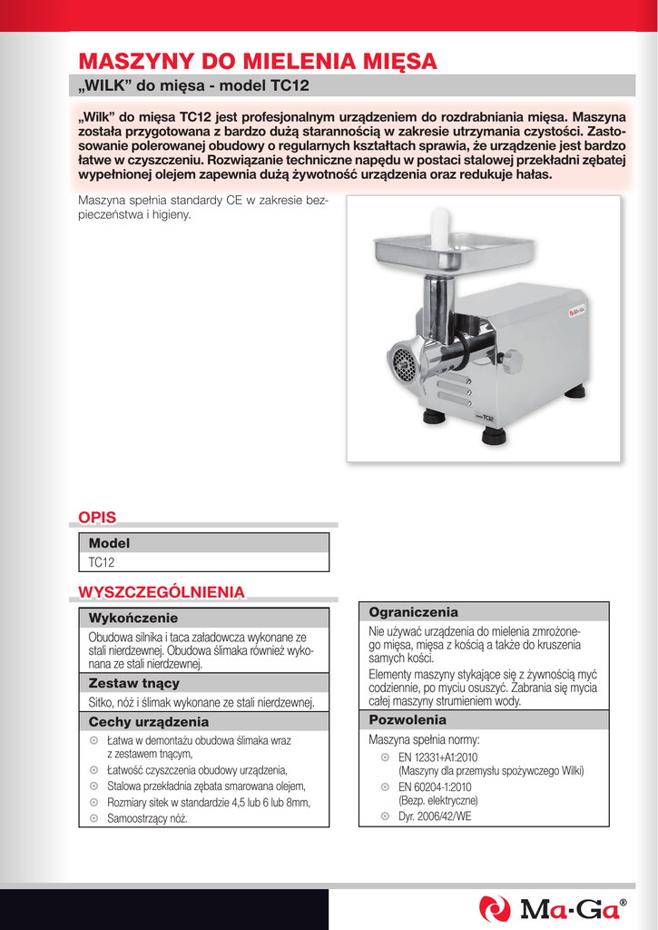 MASZYNY DO MIELENIA MIĘSA „WILK” do mięsa - model TC12 „Wilk” do mięsa TC12 jest profesjonalnym urządzeniem do rozdrabniania mięsa. Maszyna została przygotowana z bardzo dużą starannością w zakresie utrzymania czystości. Zastosowanie polerowanej obudowy o regularnych kształtach sprawia, że urządzenie jest bardzo łatwe w czyszczeniu. Rozwiązanie techniczne napędu w postaci stalowej przekładni zębatej wypełnionej olejem zapewnia dużą żywotność urządzenia oraz redukuje hałas. Maszyna spełnia standardy CE w zakresie bezpieczeństwa i higieny. OPIS Model TC12 WYSZCZEGÓLNIENIA Wykończenie Obudowa silnika i taca załadowcza wykonane ze stali nierdzewnej. Obudowa ślimaka również wykonana ze stali nierdzewnej. Zestaw tnący Sitko, nóż i ślimak wykonane ze stali nierdzewnej. Cechy urządzenia A Łatwa w demontażu obudowa ślimaka wraz z zestawem tnącym, A Łatwość czyszczenia obudowy urządzenia, A Stalowa przekładnia zębata smarowana olejem, A Rozmiary sitek w standardzie 4,5 lub 6 lub 8mm, A Samoostrzący nóż. Ograniczenia Nie używać urządzenia do mielenia zmrożonego mięsa, mięsa z kością a także do kruszenia samych kości. Elementy maszyny stykające się z żywnością myć codziennie, po myciu osuszyć. Zabrania się mycia całej maszyny strumieniem wody. Pozwolenia Maszyna spełnia normy: A EN 12331+A1:2010 (Maszyny dla przemysłu spożywczego Wilki) A EN 60204-1:2010 (Bezp. elektryczne) A Dyr. 2006/42/WE MASZYNY DO MIELENIA MIĘSA „WILK” do mięsa - model TC12 TABLICA WYMIAROWA WYMIARY „WILK” do mięsa TC12 A B C D 360mm 515mm 143mm 270mm E F G H 255mm 210mm 405mm 230mm DANE TECHNICZNE (specyfikacja) Wymiary gabarytowe Rozstaw nóżek Wydajność Obroty ślimaka Średnica sitka Poziom hałasu Zasilanie Moc Waga (ciężar netto) „WILK” do mięsa TC12 515 x 255 x 405(H)mm 360 x 210mm do 100kg/h 130obr/min 70mm ≤ 75dB 230V 50Hz 1 faza 750W 25kg SPECYFIKACJE WYSYŁKOWE Wymiary kartonu „WILK” do mięsa TC12 Długość 625mm Szerokość 330mm Wysokość 430mm Ciężar brutto 27kg