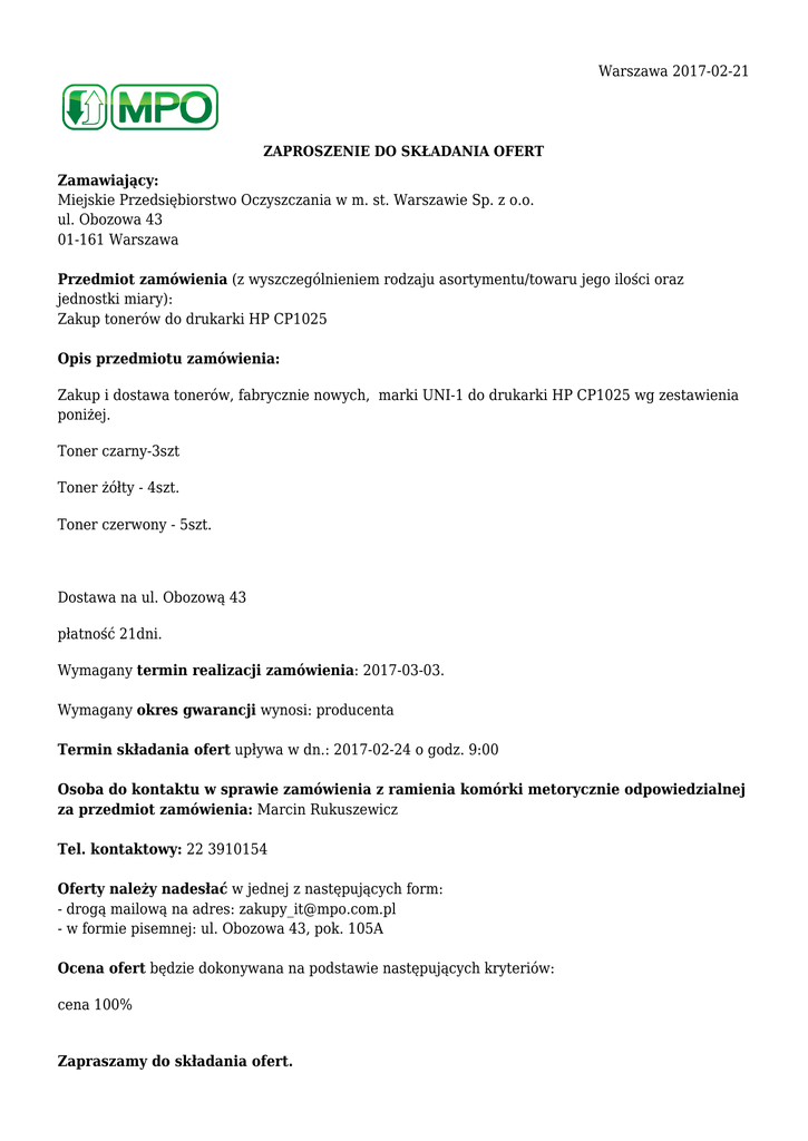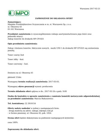 Warszawa 2017-02-21 ZAPROSZENIE DO SKŁADANIA OFERT Zamawiający: Miejskie Przedsiębiorstwo Oczyszczania w m. st. Warszawie Sp. z o.o. ul. Obozowa 43 01-161 Warszawa Przedmiot zamówienia (z wyszczególnieniem rodzaju asortymentu/towaru jego ilości oraz jednostki miary): Zakup tonerów do drukarki HP CP1025 Opis przedmiotu zamówienia: Zakup i dostawa tonerów, fabrycznie nowych, marki UNI-1 do drukarki HP CP1025 wg zestawienia poniżej. Toner czarny-3szt Toner żółty - 4szt. Toner czerwony - 5szt. Dostawa na ul. Obozową 43 płatność 21dni. Wymagany termin realizacji zamówienia: 2017-03-03. Wymagany okres gwarancji wynosi: producenta Termin składania ofert upływa w dn.: 2017-02-24 o godz. 9:00 Osoba do kontaktu w sprawie zamówienia z ramienia komórki metorycznie odpowiedzialnej za przedmiot zamówienia: Marcin Rukuszewicz Tel. kontaktowy: 22 3910154 Oferty należy nadesłać w jednej z następujących form: - drogą mailową na adres: [email protected] - w formie pisemnej: ul. Obozowa 43, pok. 105A Ocena ofert będzie dokonywana na podstawie następujących kryteriów: cena 100% Zapraszamy do składania ofert.