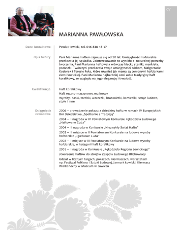 CV MARIANNA PAW£OWSKA Dane kontaktowe: Opis twórcy: Kwalifikacje: Osi¹gniêcia zawodowe: Powiat ³owicki, tel. 046 838 43 17 Pani Marianna haftem zajmuje siê od 50 lat. Umiejêtnoœci hafciarskie przekaza³a jej s¹siadka. Zainteresowanie to wynik³o z naturalnej potrzeby tworzenia, Pani Marianna haftowa³a wówczas kiecki, staniki, mankiety, poduszki. Twórczyni przekaza³a swoje umiejêtnoœci córkom, Ma³gorzacie Kosiorek i Teresie Foks, które równie¿ jak mama s¹ cenionymi hafciarkami ziemi ³owickiej. Pani Marianna najbardziej ceni sobie tradycyjny haft koralikowy, ze wzglêdu na jego elegancjê i trwa³oœæ. Haft koralikowy Haft rêczno-maszynowy, mulinowy Wyroby: paski, torebki, woreczki, bransoletki, kamizelki, stroje ludowe, stu³y i inne 2006 – prowadzenie pokazu z dziedziny haftu w ramach IV Europejskich Dni Dziedzictwa „Spotkanie z Tradycj¹” 2004 – II nagroda w IV Powiatowym Konkursie Rêkodzie³a Ludowego „Haftowane Cuda” 2004 – III nagroda w Konkursie „Niezwyk³y Œwiat Haftu” 2002 – III miejsce w II Powiatowym Konkursie na ludowe wyroby hafciarskie „Igie³kowe Cuda” 2002 – II miejsce w III Powiatowym Konkursie na ludowe wyroby hafciarskie, w kategorii haft koralikowy 2001 – II nagroda w Konkursie „Rêkodzie³o Regionu £owickiego” stworzenie haftów do strojów Zespo³u Ludowego Blichowiacy Udzia³ w licznych targach, pokazach, kiermaszach, warsztatach np. Festiwal Folkloru i Sztuki Ludowej, Jarmark £owicki, Kiermasz Wielkanocny w Muzeum w £owiczu