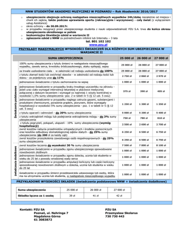 NNW STUDENTÓW AKADEMII MUZYCZNEJ W POZNANIU – Rok Akademicki 2016/2017 o o o o o ubezpieczenie obejmuje ochroną następstwa nieszczęśliwych wypadków 24h/dobę niezależnie od miejsca i chwili ich zajścia, także podczas uprawiania sportu (rekreacyjnie i wyczynowo) - cały świat (z wyłączeniem usług Assistance) okres ochrony – do 30.09.2017r. w przypadku rezygnacji przez ubezpieczonego studenta z nauki odpowiedzialność PZU S.A. trwa do końca okresu ubezpieczenia określonego w polisie bezkomisyjna likwidacja szkód w wariancie II zgłaszanie szkód z NNW za pośrednictwem infolinii lub Internetu – 3 lata tel. 801 102 102 www.pzu.pl PRZYKŁADY MAKSYMALNYCH WYSOKOŚCI ŚWIADCZEŃ DLA RÓŻNYCH SUM UBEZPIECZENIA W WARIANCIE II świadczenia dodatkowe Świadczenia podstawowe SUMA UBEZPIECZENIA 25 000 zł 26 000 zł 27 000 zł 100% sumy ubezpieczenia z tytułu śmierci w następstwie nieszczęśliwego wypadku, zawału serca, krwotoku śródczaszkowego, ataku epilepsji, sepsy 25 000 zł 26 000 zł 27 000 zł za trwałe uszkodzenie ciała - w zależności od rodzaju uszkodzenia do 100% 25 000 zł 26 000 zł 27 000 zł z tytułu złamań kości lub zwichnięć stawów - w zależności od rodzaju kości lub stawu - za pojedynczy uraz do 11% 2 750 zł 2 860 zł 2 970 zł jednorazowe świadczenie z tytułu zachorowania na sepsę 1 000 zł 1 000 zł 1 000 zł jednorazowe świadczenie w przypadku braku trwałego uszczerbku na zdrowiu jeżeli uraz ciała wymagał interwencji lekarskiej w placówce medycznej połączonej z dalszym leczeniem i wymagał co najmniej 1 wizyty kontrolnej w wysokości 1,5% sumy ubezpieczenia -poz. 2 w tabeli nr 5 (§ 12 ust. 5 owu) 375 zł 390 zł 405 zł jednorazowe świadczenie w przypadku nagłego zatrucia gazami, substancjami i produktami chemicznymi, porażenie prądem, piorunem, które wymagały hospitalizacji w wysokości 5% sumy ubezpieczenia - poz. 1 w tabeli nr 5 (§ 12 ust. 5 owu) 1 250 zł 1 300 zł 1 350 zł z tytułu oparzeń i odmrożeń - do 20% sumy ubezpieczenia 5 000 zł 5 200 zł 5 400 zł 750 zł 780 zł 810 zł 2 500 zł 2 600 zł 2 700 zł 6 250 zł 6 500 zł 6 750 zł 6 250 zł 6 500 zł 6 750 zł 7 500 zł 7 800 zł 8 100 zł 1 000 zł 1 000 zł 1 000 zł 1 000 zł 1 000 zł 1 000 zł 1 000 zł 1 000 zł 1 000 zł 1 000 zł 1 000 zł 1 000 zł z tytułu wstrząśnień mózgu lub podejrzenia wstrząśnienia mózgu - do 3% sumy ubezpieczenia z tytułu pogryzień, pokąsań, ukąszeń - 10% sumy ubezpieczenia (wymóg hospitalizacji) zwrot kosztów nabycia przedmiotów ortopedycznych i środków pomocniczych oraz kosztów odbudowy stomatologicznej zębów stałych - do 25% sumy ubezpieczenia (do 200 zł za każdy ząb) zwrot kosztów przeszkolenia zawodowego osób niepełnosprawnych - do 25% sumy ubezpieczenia zwrot kosztów leczenia do wysokości 30 % sumy ubezpieczenia jednorazowe świadczenie w przypadku zgonu ubezpieczonego spowodowane nowotworem złośliwym jednorazowe świadczenie w przypadku zgonu dziecka, ucznia lub studenta w wieku do 25 lat z powodu wrodzonej wady serca jednorazowe świadczenie w przypadku amputacji kończyny lub części kończyny spowodowanej nowotworem złośliwym u dziecka, ucznia lub studenta w wieku do 25 lat świadczenie w przypadku śmierci przedstawiciela ustawowego lub osoby, która ma na utrzymaniu ucznia lub studenta, w następstwie nieszczęśliwego wypadku PRZYKŁADOWE WYSOKOŚCI SKŁADEK (świadczenia podstawowe NNW + świadczenia dodatkowe) Suma ubezpieczenia 25 000 zł 26 000 zł 27 000 zł 39 zł 41 zł 42 zł Składka łączna za 1 osobę Kontakt: PZU SA Poznań, ul. Nehringa 7 Magdalena Górna 61 3083872 PZU SA Przemysław Skolarus 730 730 443 NNW STUDENTÓW AKADEMII MUZYCZNEJ W POZNANIU – Rok Akademicki 2016/2017 o o o o o ubezpieczenie obejmuje ochroną następstwa nieszczęśliwych wypadków 24h/dobę niezależnie od miejsca i chwili ich zajścia, także podczas uprawiania sportu (rekreacyjnie i wyczynowo) - cały świat (z wyłączeniem usług Assistance) okres ochrony – do 30.09.2017r. w przypadku rezygnacji przez ubezpieczonego studenta z nauki odpowiedzialność PZU S.A. trwa do końca okresu ubezpieczenia określonego w polisie bezkomisyjna likwidacja szkód w wariancie II zgłaszanie szkód z NNW za pośrednictwem infolinii lub Internetu – 3 lata tel. 801 102 102 www.pzu.pl PRZYKŁADY MAKSYMALNYCH WYSOKOŚCI ŚWIADCZEŃ DLA RÓŻNYCH SUM UBEZPIECZENIA W WARIANCIE II świadczenia dodatkowe Świadczenia podstawowe SUMA UBEZPIECZENIA 25 000 zł 26 000 zł 27 000 zł 100% sumy ubezpieczenia z tytułu śmierci w następstwie nieszczęśliwego wypadku, zawału serca, krwotoku śródczaszkowego, ataku epilepsji, sepsy 25 000 zł 26 000 zł 27 000 zł za trwałe uszkodzenie ciała - w zależności od rodzaju uszkodzenia do 100% 25 000 zł 26 000 zł 27 000 zł z tytułu złamań kości lub zwichnięć stawów - w zależności od rodzaju kości lub stawu - za pojedynczy uraz do 11% 2 750 zł 2 860 zł 2 970 zł jednorazowe świadczenie z tytułu zachorowania na sepsę 1 000 zł 1 000 zł 1 000 zł jednorazowe świadczenie w przypadku braku trwałego uszczerbku na zdrowiu jeżeli uraz ciała wymagał interwencji lekarskiej w placówce medycznej połączonej z dalszym leczeniem i wymagał co najmniej 1 wizyty kontrolnej w wysokości 1,5% sumy ubezpieczenia -poz. 2 w tabeli nr 5 (§ 12 ust. 5 owu) 375 zł 390 zł 405 zł jednorazowe świadczenie w przypadku nagłego zatrucia gazami, substancjami i produktami chemicznymi, porażenie prądem, piorunem, które wymagały hospitalizacji w wysokości 5% sumy ubezpieczenia - poz. 1 w tabeli nr 5 (§ 12 ust. 5 owu) 1 250 zł 1 300 zł 1 350 zł z tytułu oparzeń i odmrożeń - do 20% sumy ubezpieczenia 5 000 zł 5 200 zł 5 400 zł 750 zł 780 zł 810 zł 2 500 zł 2 600 zł 2 700 zł 6 250 zł 6 500 zł 6 750 zł 6 250 zł 6 500 zł 6 750 zł 7 500 zł 7 800 zł 8 100 zł 1 000 zł 1 000 zł 1 000 zł 1 000 zł 1 000 zł 1 000 zł 1 000 zł 1 0