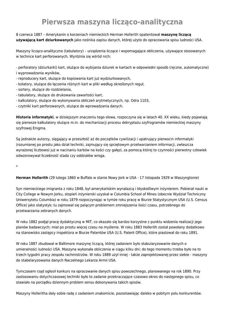Pierwsza maszyna licząco-analityczna 8 czerwca 1887 – Amerykanin o korzeniach niemieckich Herman Hollerith opatentował maszynę liczącą używającą kart dziurkowanych jako nośnika zapisu danych, której użyto do opracowania spisu ludności USA. Maszyny licząco-analityczne (tabulatory) – urządzenia liczące i wspomagające obliczenia, używające stosowanych w technice kart perforowanych. Wyróżnia się wśród nich: - perforatory (dziurkarki) kart, służące do wybijania dziurek w kartach w odpowiedni sposób (ręczne, automatyczne) i wyprowadzania wyników, - reproducery kart, służące do kopiowania kart już wydziurkowanych, - kolatory, służące do łączenia różnych kart w pliki według określonych reguł, - sortery, służące do rozdzielania, - tabulatory, służące do drukowania zawartości kart, - kalkulatory, służące do wykonywania obliczeń arytmetycznych, np. Odra 1103, - czytniki kart perforowanych, służące do wprowadzania danych. Historia informatyki, w dzisiejszym znaczeniu tego słowa, rozpoczyna się w latach 40. XX wieku, kiedy pojawiają się pierwsze kalkulatory służące m.in. do mechanizacji procesu dekryptażu szyfrogramów niemieckiej maszyny szyfrowej Enigma. Są jednakże autorzy, sięgający w przeszłość aż do początków cywilizacji i upatrujący pierwocin informatyki (rozumianej po prostu jako dział techniki, zajmujący się sprzętowym przetwarzaniem informacji, zwłaszcza wyrażonej liczbowo) już w nacinaniu karbów na kości czy gałęzi, za pomocą której to czynności pierwotny człowiek odwzorowywał liczebność stada czy oddziałów wroga. * Herman Hollerith (29 lutego 1860 w Buffalo w stanie Nowy Jork w USA - 17 listopada 1929 w Waszyngtonie) Syn niemieckiego imigranta z roku 1848, był amerykańskim wynalazcą i błyskotliwym inżynierem. Pobierał nauki w City College w Nowym Jorku, stopień inżynierski uzyskał w Columbia School of Mines (obecnie Wydział Techniczny Uniwersytetu Columbia) w roku 1879 rozpoczynając w tymże roku pracę w Biurze Statystycznym USA (U.S. Census Office) jako statystyk; tu zajmował się palącym problemem zmniejszenia ilości czasu, potrzebnego do przetwarzania zebranych danych. W roku 1882 podjął pracę dydaktyczną w MIT, co okazało się bardzo korzystne z punktu widzenia realizacji jego planów badawczych; miał po prostu więcej czasu na myślenie. W roku 1883 Hollerith został powołany dodatkowo na stanowisko zastępcy inspektora w Biurze Patentów USA (U.S. Patent Office), które piastował do roku 1891. W roku 1887 zbudował w Baltimore maszynę liczącą, której zadaniem było stabularyzowanie danych o umieralności ludności USA. Maszyna wykonała obliczenia w ciągu kilku dni; do tego momentu trzeba było na to trzech tygodni pracy zespołu rachmistrzów. W roku 1889 użył innej - także zaprojektowanej przez siebie - maszyny do stabelaryzowania danych Naczelnego Lekarza Armii USA. Tymczasem rząd ogłosił konkurs na opracowanie danych spisu powszechnego, planowanego na rok 1890. Przy zastosowaniu dotychczasowej techniki było to zadanie przekraczające czasowo okres do następnego spisu, co stawiało na porządku dziennym problem sensu dokonywania takich spisów. Maszyny Holleritha dały sobie radę z zadaniem znakomicie, pozostawiając daleko w pobitym polu konkurentów. Okazało się, że znacznie obszerniejsze dane spisowe od zebranych w roku 1880 przetworzyły one w czasie trzykrotnie krótszym. W roku 1896, 3 grudnia, Hollerith utworzył "Tabulating Machine Company" (TMC) z kapitałem poczatkowym 100 tys. USD. Firma wypuściła na rynek 1000 akcji o nominale 100 USD każda; Hollerith zachował dla siebie 502 akcje. W roku 1911 sprzedał firmę; do tego czasu wyprodukowała ona setki maszyn liczących. W roku 1894 Herman Hollerith opatentował system maszyn licząco-analitycznych, wykorzystujący karty dziurkowane, odczytywane raczej pneumatycznie niż z zastosowaniem elektryczności; w tej postaci system nigdy nie został uruchomiony. W opracowaniu tym widać wyraźny wpływ innych prac Holleritha nad konstrukcją układów hamulcowych dla kolei. Tabulating Company Machine rósł w siłę. W roku 1924 łącząc się z kilkoma innymi firmami dał początek korporacji IBM. Hollerith uzyskał łącznie w ciągu swego życia 38 patentów i osiągnął liczący się osobisty sukces finansowy. Nigdy jednak nie zainwestował w IBM ani jednego dolara.