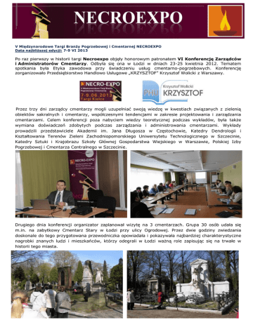 V Międzynarodowe Targi Branży Pogrzebowej i Cmentarnej NECROEXPO Data najbliższej edycji: 7-9 VI 2013 Po raz pierwszy w historii targi Necroexpo objęły honorowym patronatem VI Konferencję Zarządców i Administratorów Cmentarzy. Odbyła się ona w Łodzi w dniach 23-25 kwietnia 2012. Tematem spotkania była Etyka zawodowa przy świadczeniu usług cmentarno-pogrzebowych. Konferencję zorganizowało Przedsiębiorstwo Handlowo Usługowe „KRZYSZTOF” Krzysztof Wolicki z Warszawy. Przez trzy dni zarządcy cmentarzy mogli uzupełniać swoją wiedzę w kwestiach związanych z zielenią obiektów sakralnych i cmentarzy, współczesnymi tendencjami w zakresie projektowania i zarządzania cmentarzami. Celem konferencji poza nabyciem wiedzy teoretycznej podczas wykładów, była także wymiana doświadczeń zdobytych podczas zarządzania i administrowania cmentarzami. Wykłady prowadzili przedstawiciele Akademii im. Jana Długosza w Częstochowie, Katedry Dendrologii i Kształtowania Terenów Zieleni Zachodniopomorskiego Uniwersytetu Technologicznego w Szczecinie, Katedry Sztuki i Krajobrazu Szkoły Głównej Gospodarstwa Wiejskiego w Warszawie, Polskiej Izby Pogrzebowej i Cmentarza Centralnego w Szczecinie. Drugiego dnia konferencji organizator zaplanował wizytę na 3 cmentarzach. Grupa 30 osób udała się m.in. na zabytkowy Cmentarz Stary w Łodzi przy ulicy Ogrodowej. Przez dwie godziny zwiedzania doskonale do tego przygotowana przewodniczka opowiadała i pokazywała najbardziej charakterystyczne nagrobki znanych ludzi i mieszkańców, którzy odegrali w Łodzi ważną role zapisując się na trwałe w historii tego miasta. Następnie przewodniczka zabrała grupę na Cmentarz Żydowski, zlokalizowany przy ul. Brackiej. Jest to największa nekropolia tego wyznania w Europie. Ma 41 ha i znajduje się tam 160 tyś. nagrobków. Na obu nekropoliach zagubione wśród drzew i krzewów grobowce fabrykantów i przemysłowców, przenoszą wyobraźnię do odległych Czasów „Ziemi Obiecanej”. Ostatnim punktem wycieczki zorganizowanej przez firmę „Krzysztof” była wizyta na Cmentarzu Komunalnym. Tam uczestnicy zapoznali się z infrastrukturą cmentarza, obejrzeli siedzibę Zakładu Pogrzebowego firmy H. Skrzydlewska: Kaplicę, Zakład Pogrzebowy, Kwiaciarnię, Spopielarnię. Reasumując, szkolenie uważam za niezwykle udane. Dziękując organizatorowi za możliwość objęcia przez kieleckie targi Necroexpo patronatem tej Konferencji polecam następne takie wydarzenie rekomendując firmę „KRZYSZTOF” jako sprawdzonego i doświadczonego organizatora szkoleń i konferencji.