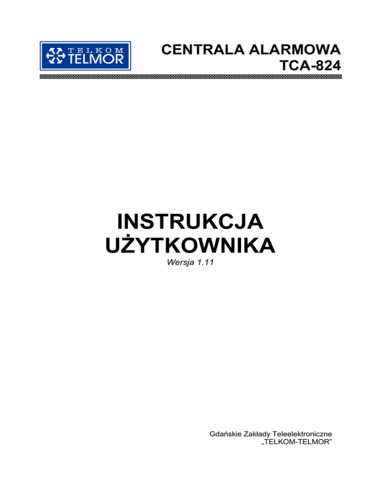 CENTRALA ALARMOWA TCA-824 INSTRUKCJA UŻYTKOWNIKA Wersja 1.11 Gdańskie Zakłady Teleelektroniczne „TELKOM-TELMOR” TCA-824 – Instrukcja użytkownika Szanowni Państwo Dziękujemy za wybranie naszego produktu. Mamy zaszczyt przekazać Państwu podstawowe informacje o systemie alarmowym, którego sercem jest profesjonalna centrala alarmowa TCA-824. Aby ułatwić sprawnie korzystanie z systemu alarmowego prosimy o zapoznanie się z niniejszą instrukcją obsługi. Wszelkie zastrzeżenia dotyczące pracy systemu alarmowego prosimy kierować do Instalatora, który podłączył centralę. Zalecamy wpisać jego dane na końcu instrukcji, jak również podpisać z nim umowę na serwis pogwarancyjny. Życzymy Państwu, aby zakupiona centrala alarmowa TCA 824 nigdy nie musiała informować o włamaniu. Z poważaniem Producent ! OSTRZEŻENIA Nie wolno samodzielnie przeprowadzać napraw ani ingerować w konstrukcję systemu alarmowego. Wszelkie czynności konserwacyjne i remontowe powinny być wykonywane przez uprawnione osoby. System alarmowy posiada akumulator. Po okresie eksploatacji nie wolno go wyrzucać. Akumulator należy zutylizować w sposób zgodny z obowiązującymi przepisami (dyrektywy Unii Europejskiej 91/157/EEC i 93/86/EEC). Taki symbol na produkcie lub na jego opakowaniu oznacza, że produkt nie może być traktowany jako odpad komunalny, lecz powinien być dostarczony do odpowiedniego punktu zbiórki sprzętu elektrycznego i elektronicznego, w celu przerobu i odzysku odpadów. W krajach Unii Europejskiej i pozostałych krajach europejskich są odrębne systemy segregacji odpadów przeznaczone do utylizacji sprzętu elektrycznego i elektronicznego. Przez takie pro ekologiczne zachowanie zapobiegają Państwo potencjalnym negatywnym wpływom na środowisko naturalne oraz na zdrowie ludzi, jakie mogłyby wystąpić w przypadku niewłaściwego procesu składowania tego produktu. Przez zagospodarowanie materiałów oszczędzamy również surowce naturalne. Aby uzyskać bardziej szczegółowe informacje na temat przerobu i odzysku materiałów elektronicznych z tego produktu, proszę skontaktować się z urzędem miasta lub gminy, lokalnym zakładem utylizacji sprzętu elektrycznego i elektronicznego lub ze sklepem, w którym produkt został zakupiony. 2713-2902-205 IO-6510-023/2 Gdańskie Zakłady Teleelektroniczne „TELKOM-TELMOR” Sp. z o.o. 80-425 Gdańsk, ul. Mickiewicza 5/7 http://www.telmor.com.pl e-mail: [email protected] -2- TCA-824 – Instrukcja użytkownika Spis treści: 1. WSTĘPNE INFORMACJE ....................................................................................... 4 1.1. Wybrane definicje .............................................................................................. 4 1.2. Opis elementów manipulatora ........................................................................... 6 1.3. Sygnalizacja stanów centrali w manipulatorze................................................... 7 2. PODSTAWOWA OBSŁUGA .................................................................................. 10 2.1. Poruszanie się po menu .................................................................................. 10 2.2. Szybkie poruszanie się po menu ..................................................................... 10 2.3. Wprowadzanie kodu użytkownika i ustawianie parametrów centrali................ 11 2.4. Włączenie i wyłączanie czuwania .................................................................... 13 2.5. Alarmy włączane klawiaturą manipulatora ....................................................... 14 2.6. Sygnalizacja alarmowa .................................................................................... 15 2.7. Wyłączenie alarmowania ................................................................................. 15 3. UPRAWNIENIA UŻYTKOWNIKÓW....................................................................... 16 4. MENU PODSTAWOWE......................................................................................... 17 4.1. Włączanie czuwania pełnego .......................................................................... 17 4.2. Włączanie czuwania częściowego................................................................... 18 4.3. Naruszenia ...................................................................................................... 18 4.4. Alarmy ............................................................................................................. 18 4.5. Awarie.............................................................................................................. 19 4.6. Wyłączanie dźwięków...................................................................................... 19 4.7. Sygnalizacja gongu.......................................................................................... 19 4.8. Wyświetlanie aktualnego czasu z sekundami .................................................. 20 5. MENU UŻYTKOWNIKA ......................................................................................... 20 5.1. Włączanie czuwania ........................................................................................ 20 5.1.1. Włączanie czuwania: pełnego .................................................................... 20 5.1.2. Włączanie czuwania: częściowego ............................................................ 21 5.1.3. Włączanie czuwania: cichego-pełnego....................................................... 21 5.1.4. Włączanie czuwania: cichego-częściowego ............................................... 21 5.2. Kasowanie alarmu ........................................................................................... 21 5.3. Blokada linii...................................................................................................... 22 5.4. Sterowanie wyjściami .......................................................................