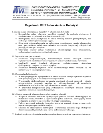 Regulamin BHP laboratorium Robotyki I. Ogólne zasady obowiązujące studentów w laboratorium Robotyki: • Bezwzględny zakaz włączania wszelkich urządzeń do zasilania sieciowego i manipulowania przyciskami w tablicach sterowniczych. • Bezwzględny zakaz przebywania w strefie roboczej robotów przemysłowych, bez osobistego nadzoru prowadzącego zajęcia. • Obowiązek podporządkowania się poleceniom prowadzących zajęcia laboratoryjne oraz pracownikom technicznym odnośnie zachowania bezpiecznej odległości od pracujących maszyn i urządzeń. • Obowiązek ochrony całego wyposażenia laboratoryjnego przed zniszczeniem, uszkodzeniami mechanicznymi i zabrudzeniami. II. Zagrożenia awaryjne urządzeń: • Możliwość niespodziewanych, niesterowalnych ruchów roboczych członów wykonawczych na skutek awarii wyłączników krańcowych lub układu sterowania. • Możliwość awarii instalacji elektrycznej zrobotyzowanego stanowiska dydaktycznego, co grozi porażeniem prądem. • Możliwość realizacji trajektorii ruchu automatycznego robota różniącej się od realizowanej w czasie programowania. III. Zagrożenia dla Studentów: • W każdym przypadku wystąpienia w/w awarii urządzeń istnieje zagrożenie wypadku osób przebywających w ich bezpośrednim sąsiedztwie. • W przypadku niedozwolonego naruszenia przestrzeni roboczej stanowisk - istnieje najpoważniejsze zagrożenie wypadku przy niekontrolowanych lub awaryjnych uruchomieniach w/w układów, bądź nieuwadze uczestnika zajęć. • W przypadku manipulowania przy podłączeniach sieciowych urządzeń istnieje zagrożenie porażenia prądem elektrycznym. IV. Obsługa stanowisk laboratoryjnych w laboratorium robotyki: • Wszystkie elementy stanowisk dydaktycznych podczas ćwiczeń laboratoryjnych ze studentami winny pochodzić z wyposażenia tychże stanowisk. Bezwzględny zakaz podłączania elementów nie pochodzących z tego wyposażenia. • Podczas prezentacji działania elementów stanowisk studenci zajmują w tym czasie wyznaczone przez pracowników miejsce. • Studenci po odpowiednich instrukcjach i demonstracji działania mogą obsługiwać stanowiska dydaktyczne tylko pod stałym nadzorem prowadzącego. V. Studenci na pierwszych zajęciach zobowiązani są do zapoznania się z powyższą instrukcją.