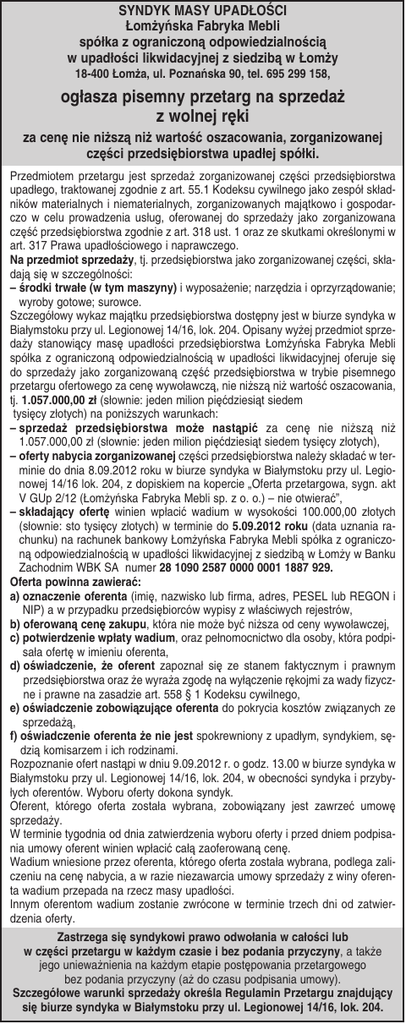 SYNDYK MASY UPADŁOŚCI Łomżyńska Fabryka Mebli spółka z ograniczoną odpowiedzialnością w upadłości likwidacyjnej z siedzibą w Łomży 18-400 Łomża, ul. Poznańska 90, tel. 695 299 158, ogłasza pisemny przetarg na sprzedaż z wolnej ręki za cenę nie niższą niż wartość oszacowania, zorganizowanej części przedsiębiorstwa upadłej spółki. Przedmiotem przetargu jest sprzedaż zorganizowanej części przedsiębiorstwa upadłego, traktowanej zgodnie z art. 55.1 Kodeksu cywilnego jako zespół składników materialnych i niematerialnych, zorganizowanych majątkowo i gospodarczo w celu prowadzenia usług, oferowanej do sprzedaży jako zorganizowana część przedsiębiorstwa zgodnie z art. 318 ust. 1 oraz ze skutkami określonymi w art. 317 Prawa upadłościowego i naprawczego. Na przedmiot sprzedaży, tj. przedsiębiorstwa jako zorganizowanej części, składają się w szczególności: – środki trwałe (w tym maszyny) i wyposażenie; narzędzia i oprzyrządowanie; wyroby gotowe; surowce. Szczegółowy wykaz majątku przedsiębiorstwa dostępny jest w biurze syndyka w Białymstoku przy ul. Legionowej 14/16, lok. 204. Opisany wyżej przedmiot sprzedaży stanowiący masę upadłości przedsiębiorstwa Łomżyńska Fabryka Mebli spółka z ograniczoną odpowiedzialnością w upadłości likwidacyjnej oferuje się do sprzedaży jako zorganizowaną część przedsiębiorstwa w trybie pisemnego przetargu ofertowego za cenę wywoławczą, nie niższą niż wartość oszacowania, tj. 1.057.000,00 zł (słownie: jeden milion pięćdziesiąt siedem tysięcy złotych) na poniższych warunkach: – sprzedaż przedsiębiorstwa może nastąpić za cenę nie niższą niż 1.057.000,00 zł (słownie: jeden milion pięćdziesiąt siedem tysięcy złotych), – oferty nabycia zorganizowanej części przedsiębiorstwa należy składać w terminie do dnia 8.09.2012 roku w biurze syndyka w Białymstoku przy ul. Legionowej 14/16 lok. 204, z dopiskiem na kopercie „Oferta przetargowa, sygn. akt V GUp 2/12 (Łomżyńska Fabryka Mebli sp. z o. o.) – nie otwierać”, – składający ofertę winien wpłacić wadium w wysokości 100.000,00 złotych (słownie: sto tysięcy złotych) w terminie do 5.09.2012 roku (data uznania rachunku) na rachunek bankowy Łomżyńska Fabryka Mebli spółka z ograniczoną odpowiedzialnością w upadłości likwidacyjnej z siedzibą w Łomży w Banku Zachodnim WBK SA numer 28 1090 2587 0000 0001 1887 929. Oferta powinna zawierać: a) oznaczenie oferenta (imię, nazwisko lub firma, adres, PESEL lub REGON i NIP) a w przypadku przedsiębiorców wypisy z właściwych rejestrów, b) oferowaną cenę zakupu, która nie może być niższa od ceny wywoławczej, c) potwierdzenie wpłaty wadium, oraz pełnomocnictwo dla osoby, która podpisała ofertę w imieniu oferenta, d) oświadczenie, że oferent zapoznał się ze stanem faktycznym i prawnym przedsiębiorstwa oraz że wyraża zgodę na wyłączenie rękojmi za wady fizyczne i prawne na zasadzie art. 558 § 1 Kodeksu cywilnego, e) oświadczenie zobowiązujące oferenta do pokrycia kosztów związanych ze sprzedażą, f) oświadczenie oferenta że nie jest spokrewniony z upadłym, syndykiem, sędzią komisarzem i ich rodzinami. Rozpoznanie ofert nastąpi w dniu 9.09.2012 r. o godz. 13.00 w biurze syndyka w Białymstoku przy ul. Legionowej 14/16, lok. 204, w obecności syndyka i przybyłych oferentów. Wyboru oferty dokona syndyk. Oferent, którego oferta została wybrana, zobowiązany jest zawrzeć umowę sprzedaży. W terminie tygodnia od dnia zatwierdzenia wyboru oferty i przed dniem podpisania umowy oferent winien wpłacić całą zaoferowaną cenę. Wadium wniesione przez oferenta, którego oferta została wybrana, podlega zaliczeniu na cenę nabycia, a w razie niezawarcia umowy sprzedaży z winy oferenta wadium przepada na rzecz masy upadłości. Innym oferentom wadium zostanie zwrócone w terminie trzech dni od zatwierdzenia oferty. Zastrzega się syndykowi prawo odwołania w całości lub w części przetargu w każdym czasie i bez podania przyczyny, a także jego unieważnienia na każdym etapie postępowania przetargowego bez podania przyczyny (aż do czasu podpisania umowy). Szczegółowe warunki sprzedaży określa Regulamin Przetargu znajdujący się biurze syndyka w Białymstoku przy ul. Legionowej 14/16, lok. 204.