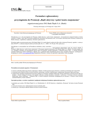 ING BANK ŚLĄSKI Spółka Akcyjna Formularz zgłoszeniowy przystąpienia do Promocji „Bądź aktywny i poleć konto znajomemu” organizowanej przez ING Bank Śląski S.A. (Bank) Promocja obowiązuje: od 10 lutego do 31 lipca 2014 Nazwisko i imię klienta przystępującego do Promocji Numer PESEL lub nr dokumentu tożsamości w przypadku nierezydenta Oświadczam, że w celu przystąpienia do Promocji „Bądź aktywny i poleć konto znajomemu”, otworzyłem/am rachunek bankowy (konto osobiste) w Banku i przy jego otwieraniu podałem/am otrzymany kod promocji oraz, że do końca obowiązywania Promocji, dostarczę do Banku niniejszy, wypełniony i podpisany, formularz zgłoszeniowy. Wyrażam zgodę na przetwarzanie przez ING Bank Śląski S.A moich danych osobowych dla celów niniejszej Promocji, zgodnie z ustawą z dnia 29.08.97 r. o ochronie danych osobowych (tekst jedn. Dz. U. z 2002 r. Nr 101 poz. 926 z późn.zm.). Oświadczam, że otrzymałem/-am od Posiadacza rachunku tj imię i nazwisko:……………………………………………………..…………., adres: ………………………………………………………………...................... kod promocji uprawniający mnie do wzięcia udziału w Promocji „Bądź aktywny i poleć konto znajomemu” (Promocja) organizowanej przez ING Banku Śląski S.A. (Bank). Wyrażam zgodę, aby ww. Posiadacz rachunku, po przystąpieniu przeze mnie do Promocji, uzyskał informacje o założeniu przeze mnie - w ramach Promocji, rachunku bankowego (konta osobistego) w Banku oraz o spełnieniu albo niespełnieniu przeze mnie warunków Promocji, wynikających z dostępnego na stronie www.ingbank.pl/100zl Regulaminu Promocji, z którym się uprzednio zapoznałem i który akceptuję. Data i czytelny podpis Klienta przystępującego do Promocji Warunkiem otrzymania nagrody w Promocji jest: otwarcie rachunku bankowego (konta osobistego) w Banku z kodem promocji przez Internet w terminie od 10 lutego do 9 maja 2014, otrzymanie przez Bank do końca trwania Promocji, niniejszego, czytelnie wypełnionego i podpisanego formularza zgłoszeniowego, zrealizowanie transakcji bezgotówkowych kartą wydaną do otwartego rachunku bankowego (konta osobistego) na łączną kwotę 200 zł w każdym z dwóch kolejnych miesięcy (do nagrody zaliczone zostaną transakcje wykonane i rozliczone w miesiącu otwarcia rachunku bankowego /konta osobistego/ i kolejnym albo w dwóch kolejnych miesiącach następujących po miesiącu, w którym został otwarty rachunek bankowy /konto osobiste/). Uprzejmie prosimy o czytelne wypełnienie i podpisanie niniejszego formularza zgłoszeniowego oraz: przesłanie go na adres: ING Bank Śląski S.A. ul. Roździeńska 41, 40-382 Katowice z dopiskiem „Promocja” do końca trwania Promocji albo zwrot przez kuriera wraz z dokumentami otwarcia rachunku albo złożenie go w dowolnym oddziale Banku do końca trwania Promocji. Numer KKI (wypełnia Bank) Data (wypełnia Bank)