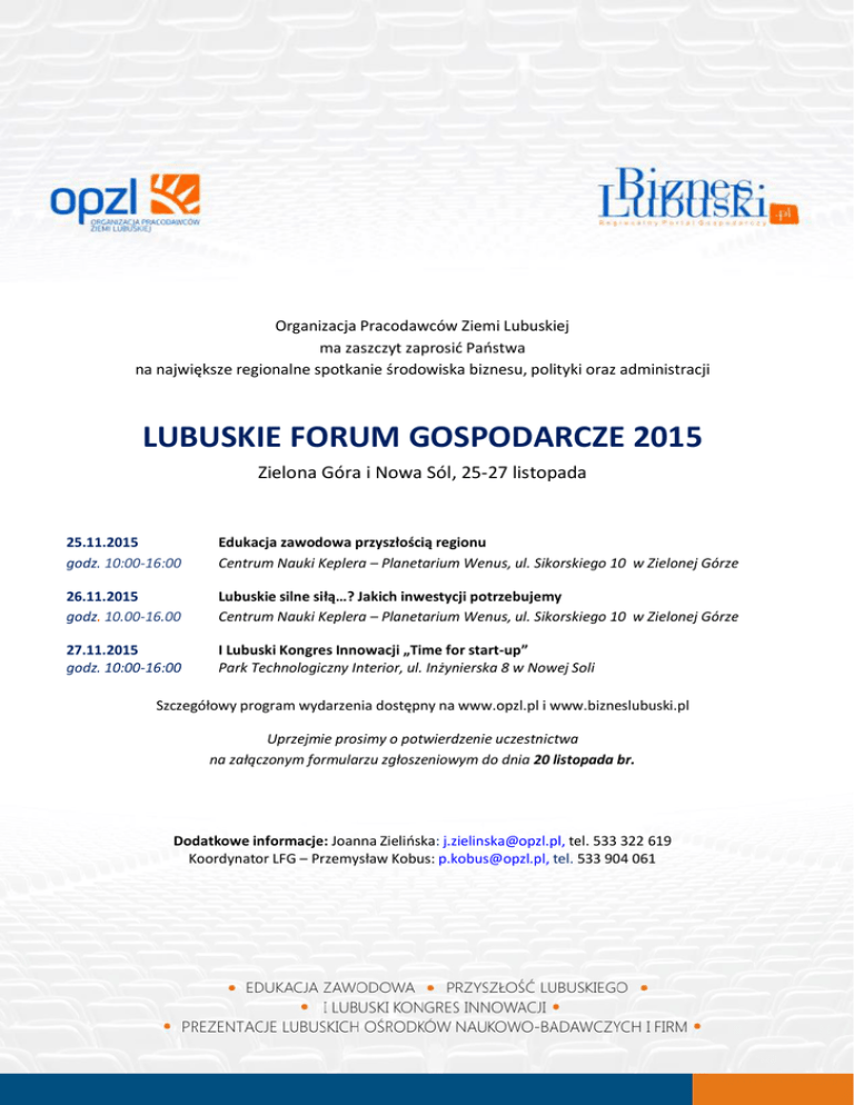 Organizacja Pracodawców Ziemi Lubuskiej ma zaszczyt zaprosić Państwa na największe regionalne spotkanie środowiska biznesu, polityki oraz administracji LUBUSKIE FORUM GOSPODARCZE 2015 Zielona Góra i Nowa Sól, 25-27 listopada 25.11.2015 godz. 10:00-16:00 Edukacja zawodowa przyszłością regionu Centrum Nauki Keplera – Planetarium Wenus, ul. Sikorskiego 10 w Zielonej Górze 26.11.2015 godz. 10.00-16.00 Lubuskie silne siłą…? Jakich inwestycji potrzebujemy Centrum Nauki Keplera – Planetarium Wenus, ul. Sikorskiego 10 w Zielonej Górze 27.11.2015 godz. 10:00-16:00 I Lubuski Kongres Innowacji „Time for start-up” Park Technologiczny Interior, ul. Inżynierska 8 w Nowej Soli Szczegółowy program wydarzenia dostępny na www.opzl.pl i www.bizneslubuski.pl Uprzejmie prosimy o potwierdzenie uczestnictwa na załączonym formularzu zgłoszeniowym do dnia 20 listopada br. Dodatkowe informacje: Joanna Zielińska: [email protected], tel. 533 322 619 Koordynator LFG – Przemysław Kobus: [email protected], tel. 533 904 061