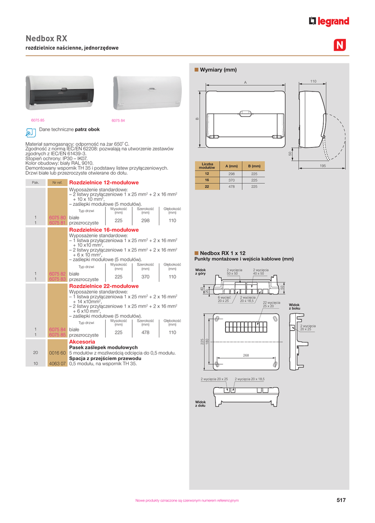 Nedbox RX rozdzielnice naścienne, jednorzędowe n Wymiary (mm) 110 6075 85 B A 6075 84 Materiał samogasnący: odporność na żar 650˚ C. Zgodność z normą IEC/EN 62208: pozwalają na utworzenie zestawów zgodnych z IEC/EN 61439-3. Stopień ochrony: IP30 – IK07. Kolor obudowy: biały RAL 9010. Demontowany wspornik TH 35 i podstawy listew przyłączeniowych. Drzwi białe lub przezroczyste otwierane do dołu. Pak. Nr ref. Rozdzielnice 12-modułowe Wyposażenie standardowe: – 2 listwy przyłączeniowe 1 x 25 mm2 + 2 x 16 mm2 + 10 x 10 mm2, – zaślepki modułowe (5 modułów). Typ drzwi 1 1 6075 80 białe 6075 81 przezroczyste Wysokość (mm) Szerokość (mm) Głębokość (mm) 225 298 110 50 Dane techniczne patrz obok Liczba modułów A (mm) 195 B (mm) 12 298225 16 370225 22 478225 Rozdzielnice 16-modułowe 6075 82 białe 6075 83 przezroczyste Szerokość (mm) Głębokość (mm) 225 370 110 Rozdzielnice 22-modułowe Wyposażenie standardowe: – 1 listwa przyłączeniowa 1 x 25 mm2 + 2 x 16 mm2 + 14 x10mm2, – 2 listwy przyłączeniowe 1 x 25 mm2 + 2 x 16 mm2 + 6 x10 mm2, – zaślepki modułowe (5 modułów). Typ drzwi 1 1 6075 84 białe 6075 85 przezroczyste Akcesoria 20 10 Wysokość (mm) Szerokość (mm) Głębokość (mm) 225 478 110 Pasek zaślepek modułowych 0016 60 5 modułów z mozliwością odcięcia do 0,5 modułu. Spacja z przejściem przewodu 4063 07 0,5 modułu, na wspornik TH 35. Punkty montażowe i wejścia kablowe (mm) Widok z góry 2 wycięcia 50 x 50 2 wycięcia 40 x 50 50 1 1 Wysokość (mm) 40 20 Typ drzwi n Nedbox RX 1 x 12 6 wycięć 20 x 25 2 wycięcia 20 x 18,5 22 wycięcia 25 x 20 Widok z boku 2 wycięcia 20 x 25 225 180 Wyposażenie standardowe: – 1 listwa przyłączeniowa 1 x 25 mm2 + 2 x 16 mm2 + 10 x10 mm2, – 2 listwy przyłączeniowe 1 x 25 mm2 + 2 x 16 mm2 + 6 x 10 mm2, – zaślepki modułowe (5 modułów). 268 2 wycięcia 20 x 25 2 wycięcia 20 x 18,5 Widok z dołu Nowe produkty oznaczone są czerwonym numerem referencyjnym 517
