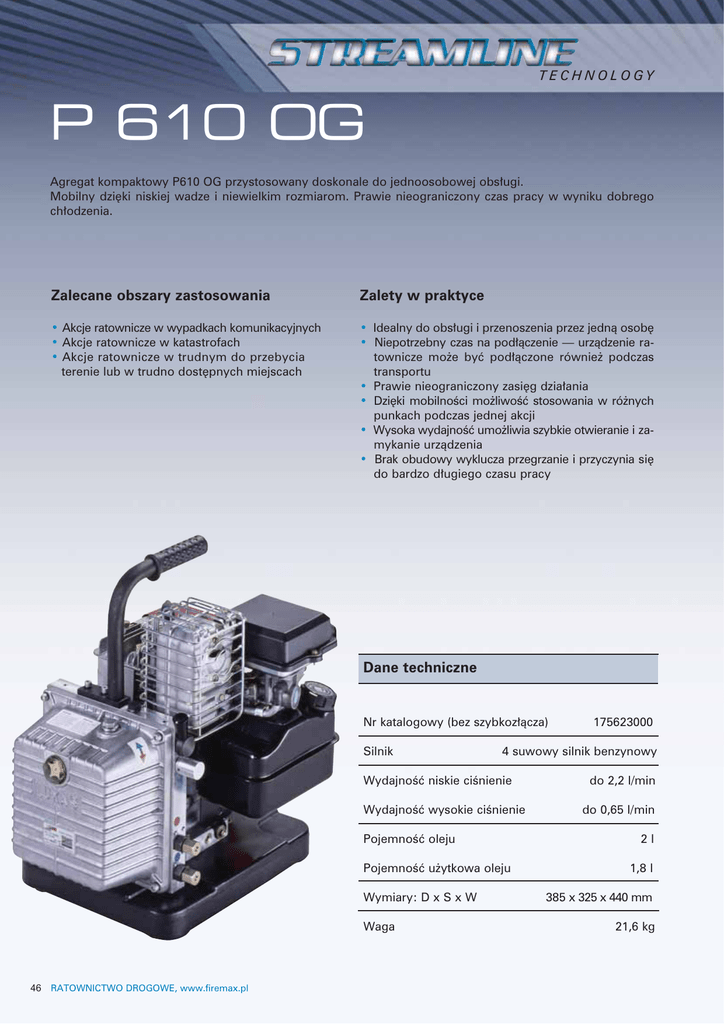 TECHNOLOGY P 610 OG Agregat kompaktowy P610 OG przystosowany doskonale do jednoosobowej obsługi. Mobilny dzięki niskiej wadze i niewielkim rozmiarom. Prawie nieograniczony czas pracy w wyniku dobrego chłodzenia. Zalecane obszary zastosowania Zalety w praktyce • Akcje ratownicze w wypadkach komunikacyjnych • Akcje ratownicze w katastrofach • Akcje ratownicze w trudnym do przebycia terenie lub w trudno dostępnych miejscach • Idealny do obsługi i przenoszenia przez jedną osobę • Niepotrzebny czas na podłączenie — urządzenie ratownicze może być podłączone również podczas transportu • Prawie nieograniczony zasięg działania • Dzięki mobilności możliwość stosowania w różnych punkach podczas jednej akcji • Wysoka wydajność umożliwia szybkie otwieranie i zamykanie urządzenia • Brak obudowy wyklucza przegrzanie i przyczynia się do bardzo długiego czasu pracy Dane techniczne Nr katalogowy (bez szybkozłącza) Silnik 4 suwowy silnik benzynowy Wydajność niskie ciśnienie Wydajność wysokie ciśnienie Pojemność oleju Pojemność użytkowa oleju Wymiary: D x S x W Waga 46 RATOWNICTWO DROGOWE, www.firemax.pl 175623000 do 2,2 l/min do 0,65 l/min 2l 1,8 l 385 x 325 x 440 mm 21,6 kg