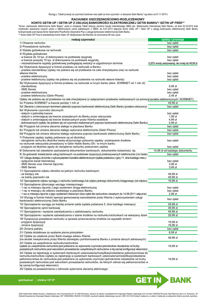 Wyciąg z „Tabeli prowizji za czynności bankowe oraz opłat za inne czynności w obszarze Getin Banku” wg stanu na 01.11.2015 r. RACHUNEK OSZCZĘDNOŚCIOWO-ROZLICZENIOWY KONTO GETIN UP / GETIN UP Z USŁUGĄ BANKOWOŚCI ELEKTRONICZNEJ GETIN BANKU*/ GETIN UP FREE** *forma: „bankowość elektroniczna Getin Banku” użyta w niniejszej Tabeli dotyczy zarówno kanału internetowego GB24 jak i Bankowości Internetowej Getin Banku; od dnia 23.10.2012 brak możliwości zawierania nowych umów o GB24/nowych umów pakietowych z GB24; do 8.01.2013 włącznie Konto Getin UP / Getin UP z usługą bankowości elektronicznej Getin Banku funkcjonowało pod nazwą Konto Optymalne Plus/Konto Optymalne Plus z usługą bankowości elektronicznej Getin Banku ** Konto Getin UP Free to standardowe konto Getin UP dedykowane dla Klientów do ukończenia 28 roku życia rodzaj czynności opłaty i prowizje 1/ Otwarcie rachunku bez opłat 2/ Prowadzenie rachunku bez opłat 3/ Wpłata gotówkowa na rachunek bez opłat 4/ Wypłata gotówkowa: - w kwocie do 10 tys. zł dokonywana na podstawie asygnaty bez opłat - w kwocie powyżej 10 tys. zł dokonywana na podstawie asygnaty bez opłat - niezrealizowanie wypłaty gotówkowej podlegającej awizacji w uzgodnionym terminie 0,20% kwoty awizowanej, nie mniej niż 49,99 zł 5a/ Wykonanie dyspozycji w formie przelewu na rachunek w Banku: - przelew standardowy (opłaty nie pobiera się od przelewów na cele charytatywne oraz na rachunki własne klienta bez opłat - przelew elektroniczny bez opłat - przelew telefoniczny (opłaty nie pobiera się od przelewów na rachunki własne klienta) bez opłat 5b/ Wykonanie dyspozycji w formie przelewu na rachunek w innym banku (elixir, SORBNET od 1 mln zł): - standardowy 5,99 zł - SMS Serwis bez opłat - przelew elektroniczny bez opłat - przelew telefoniczny (Getin Phone) 2,49 zł Opłaty nie pobiera się od przelewów na cele charytatywne (z wyłączeniem przelewów realizowanych za pomocą kanałów elektronicznych i SORBNET). 5c/ Przelew SORBNET w kwocie poniżej 1 mln zł 49,99 zł 5d/ Zlecenie z odroczonym terminem płatności poprzez bankowość elektroniczną Getin Banku (przelew odroczony) bez opłat 6a/ Wykonanie czynności zleconych: - stałych o jednolitej kwocie bez opłat - stałych o zmieniającej się kwocie przesyłanych do Banku przez wierzyciela 1,99 zł - stałych o zmieniającej się kwocie dostarczanych przez Klienta osobiście 4,99 zł - jednorazowych (opłaty nie pobiera się od czynności realizowanych poprzez bankowość elektroniczną Getin Banku) 5,99 zł 6b/ Przyjęcie lub zmiana zlecenia stałego w placówce Banku bez opłat 6c/ Przyjęcie lub zmiana zlecenia stałego wykonana telefonicznie (Getin Phone) bez opłat 6d/ Przyjęcie lub zmiana zlecenia stałego wykonana poprzez bankowość elektroniczną Getin Banku bez opłat 7/ Polecenie zapłaty (opłaty pobierane są od dłużnika): - obciążenie rachunku dłużnika kwotą otrzymanego polecenia zapłaty i przekazanie środków bez opłat na rachunek wierzyciela prowadzony w Getin Noble Banku SA / w innym banku - przyjęcie od dłużnika zgody do obciążenia rachunku poleceniem zapłaty bez opłat 8/ Dokonanie lub odwołanie zastrzeżenia dokumentów bankowych, dokumentów tożsamości, itp. 14,99 zł od każdego dokumentu 9/ Za gotowość świadczenia usług bankowych na podstawie dyspozycji przekazywanych telefonicznie (na hasło) bez opłat 10/ Usługa dostępu do konta z wykorzystaniem kanałów elektronicznych (opłata pobierana z góry 11. dnia każdego mies.): - wyłącznie kanał internetowy bez opłat - SMS Serwis oraz Internet (łącznie) 3,99 zł - SMS Serwis 3,99 zł 11/ Sporządzenie odpisu obrotów na jednym rachunku bankowym: - za bieżący rok 49,99 zł - za każdy poprzedni rok 49,99 zł 12/ Sporządzenie odpisu wyciągu z rachunku bankowego lub odpisu jednego dokumentu księgowego (od odpisu) 19,99 zł 13/ Sporządzenie zbiorczego wyciągu miesięcznego: - 1 raz w miesiącu łącznie z jego wysłaniem drogą elektroniczną bez opłat - 1 raz w miesiącu do odbioru osobistego w placówce Banku bez opłat - 1 raz w miesiącu łącznie z jego wysłaniem listownym (bez opłat dla rachunków otwartych do 14.06.2011 włącznie) 2,99 zł 14/ Wyciąg w formie historii operacji generowanej samodzielnie przez Klienta z wykorzystaniem usługi bez opłat bankowości elektronicznej Getin Banku 15/ Sporządzenie wyciągu po każdej zmianie salda (opłata pobierana 5. dnia każdego miesiąca) 29,99 zł 16/ Sporządzenie opinii bankowej 49,99 zł 17/ Sporządzenie i wysłanie zaświadczenia o zablokowaniu rachunku 49,99 zł 18/ Sporządzenie i wysłanie zaświadczenia o stanie środków na rachunku/rachunkach na wskazany dzień 29,99 zł 19/ Dyspozycja posiadacza rachunku w sprawie przeznaczenia środków na wypadek śmierci: - przyjęcie dyspozycji 19,99 zł - zmiana dyspozycji 19,99 zł 20/ Zmiana pakietu bez opłat 21/ Opłata dodatkowa za wysłanie pisma priorytetem 8,99 zł 22/ Opłata za ustalenie przez Bank nowego adresu Klienta 49,99 zł (na skutek niewykonania przez Klienta obowiązku poinformowania Banku o zmianie danych adresowych) 23/ Opłata za uwspólnienie rachunku/rachunków (opłata za uwspólnienie rachunków jest pobierana za wykonanie czynności jednokrotnie niezależnie od liczby 19,99 zł posiadanych rachunków pod warunkiem prowadzenia uwspólnianych rachunków w tej samej konfiguracji własności) 24/ Opłata za rejestrację w systemach bankowych ustanowienia/modyfikacji/odwołania pełnomocnictwa do rachunku/rachunków (opłata za rejestrację w systemach bankowych ustanowienia/modyfikacji/odwołania pełnomocnictwa do rachunków jest pobierana za wykonanie czynności jednokrotnie niezależnie od liczby 19,99 zł posiadanych rachunków pod warunkiem prowadzenia rachunków, do których odnosi się pełnomocnictwo w tej samej konfiguracji własności) 25/ Opłata za powiadomienie o odmowie wykonania zlecenia płatniczego
