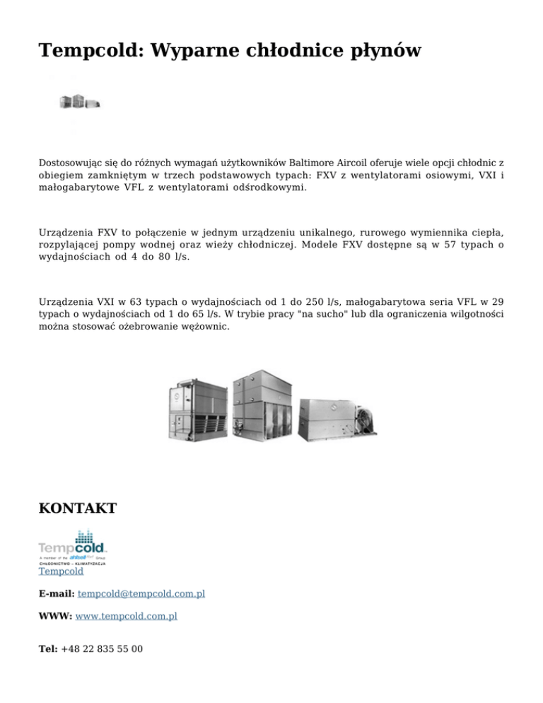 Tempcold: Wyparne chłodnice płynów Dostosowując się do różnych wymagań użytkowników Baltimore Aircoil oferuje wiele opcji chłodnic z obiegiem zamkniętym w trzech podstawowych typach: FXV z wentylatorami osiowymi, VXI i małogabarytowe VFL z wentylatorami odśrodkowymi. Urządzenia FXV to połączenie w jednym urządzeniu unikalnego, rurowego wymiennika ciepła, rozpylającej pompy wodnej oraz wieży chłodniczej. Modele FXV dostępne są w 57 typach o wydajnościach od 4 do 80 l/s. Urządzenia VXI w 63 typach o wydajnościach od 1 do 250 l/s, małogabarytowa seria VFL w 29 typach o wydajnościach od 1 do 65 l/s. W trybie pracy "na sucho" lub dla ograniczenia wilgotności można stosować ożebrowanie wężownic. KONTAKT Tempcold E-mail: [email protected] WWW: www.tempcold.com.pl Tel: +48 22 835 55 00 Fax: +48 22 835 55 02 Adres: Burleska 3 01-939 Warszawa