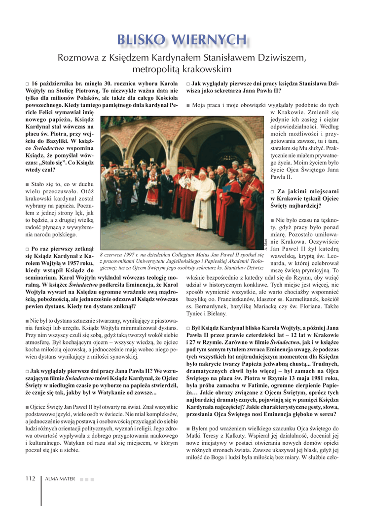 BLISKO WIERNYCH Rozmowa z Księdzem Kardynałem Stanisławem Dziwiszem, metropolitą krakowskim □ 16 października br. minęła 30. rocznica wyboru Karola Wojtyły na Stolicę Piotrową. To niezwykle ważna data nie tylko dla milionów Polaków, ale także dla całego Kościoła powszechnego. Kiedy tamtego pamiętnego dnia kardynał Pericle Felici wymawiał imię nowego papieża, Ksiądz Kardynał stał wówczas na placu św. Piotra, przy wejściu do Bazyliki. W książce Świadectwo wspomina Ksiądz, że pomyślał wówczas: „Stało się”. Co Ksiądz wtedy czuł? □ Jak wyglądały pierwsze dni pracy księdza Stanisława Dziwisza jako sekretarza Jana Pawła II? ■ Moja praca i moje obowiązki wyglądały podobnie do tych w Krakowie. Zmienił się jedynie ich zasięg i ciężar odpowiedzialności. Według moich możliwości i przygotowania zawsze, tu i tam, starałem się Mu służyć. Praktycznie nie miałem prywatnego życia. Moim życiem było życie Ojca Świętego Jana Pawła II. ■ Stało się to, co w duchu wielu przeczuwało. Otóż krakowski kardynał został wybrany na papieża. Poczułem z jednej strony lęk, jak to będzie, a z drugiej wielką radość płynącą z wywyższenia narodu polskiego. □ Za jakimi miejscami w Krakowie tęsknił Ojciec Święty najbardziej? A. Mari ■ Nie było czasu na tęsknoty, gdyż pracy było ponad miarę. Pozostało umiłowanie Krakowa. Oczywiście □ Po raz pierwszy zetknął Jan Paweł II żył katedrą się Ksiądz Kardynał z Ka- 8 czerwca 1997 r. na dziedzińcu Collegium Maius Jan Paweł II spotkał się wawelską, kryptą św. Leorolem Wojtyłą w 1957 roku, z pracownikami Uniwersytetu Jagiellońskiego i Papieskiej Akademii Teolo- narda, w której celebrował gicznej; tuż za Ojcem Świętym jego osobisty sekretarz ks. Stanisław Dziwisz kiedy wstąpił Ksiądz do mszę świętą prymicyjną. To seminarium. Karol Wojtyła wykładał wówczas teologię mo- właśnie bezpośrednio z katedry udał się do Rzymu, aby wziąć ralną. W książce Świadectwo podkreśla Eminencja, że Karol udział w historycznym konklawe. Tych miejsc jest więcej, nie Wojtyła wywarł na Księdzu ogromne wrażenie swą mądro- sposób wymienić wszystkie, ale warto chociażby wspomnieć ścią, pobożnością, ale jednocześnie odczuwał Ksiądz wówczas bazylikę oo. Franciszkanów, klasztor ss. Karmelitanek, kościół pewien dystans. Kiedy ten dystans zniknął? ss. Bernardynek, bazylikę Mariacką czy św. Floriana. Także Tyniec i Bielany. ■ Nie był to dystans sztucznie stwarzany, wynikający z piastowania funkcji lub urzędu. Ksiądz Wojtyła minimalizował dystans. □ Był Ksiądz Kardynał blisko Karola Wojtyły, a później Jana Przy nim wszyscy czuli się sobą, gdyż taką tworzył wokół siebie Pawła II przez prawie czterdzieści lat – 12 lat w Krakowie atmosferę. Był kochającym ojcem – wszyscy wiedzą, że ojciec i 27 w Rzymie. Zarówno w filmie Świadectwo, jak i w książce kocha miłością ojcowską, a jednocześnie mają wobec niego pe- pod tym samym tytułem zwraca Eminencja uwagę, że podczas wien dystans wynikający z miłości synowskiej. tych wszystkich lat najtrudniejszym momentem dla Księdza było nakrycie twarzy Papieża jedwabną chustą... Trudnych, □ Jak wyglądały pierwsze dni pracy Jana Pawła II? We wzru- dramatycznych chwil było więcej – był zamach na Ojca szającym filmie Świadectwo mówi Ksiądz Kardynał, że Ojciec Świętego na placu św. Piotra w Rzymie 13 maja 1981 roku, Święty w niedługim czasie po wyborze na papieża stwierdził, była próba zamachu w Fatimie, ogromne cierpienie Papieże czuje się tak, jakby był w Watykanie od zawsze... ża… Jakie obrazy związane z Ojcem Świętym, oprócz tych najbardziej dramatycznych, pojawiają się w pamięci Księdza ■ Ojciec Święty Jan Paweł II był otwarty na świat. Znał wszystkie Kardynała najczęściej? Jakie charakterystyczne gesty, słowa, podstawowe języki, wiele osób w świecie. Nie miał kompleksów, przesłania Ojca Świętego nosi Eminencja głęboko w sercu? a jednocześnie swoją postawą i osobowością przyciągał do siebie ludzi różnych orientacji politycznych, wyznań i religii. Jego zdro- ■ Byłem pod wrażeniem wielkiego szacunku Ojca świętego do wa otwartość wypływała z dobrego przygotowania naukowego Matki Teresy z Kalkuty. Wspierał jej działalność, doceniał jej i kulturalnego. Watykan od razu stał się miejscem, w którym nowe inicjatywy w postaci otwierania nowych domów opieki poczuł się jak u siebie. w różnych stronach świata. Zawsze ukazywał jej blask, gdyż jej miłość do Boga i ludzi była miłością bez miary. W służbie czło112 ALMA MATER wiekowi rozumieli się bez słów, gdyż ich działalność wypływała z głębokiej modlitewnej więzi z Bogiem. Oczywiście, na innej płaszczyźnie niezwykle symboliczne było przejście Jana Pawła II z kanclerzem Helmutem Kohlem przez Bramę Brandenburską. Oto przedstawiciele dwóch zwaśnionych kiedyś narodów przechodzą przez Bramę, która kiedyś była oznaką zniewolenia i podeptania ludzkiej godności, a dziś staje się miejscem ostatecznego obalenia wrogiej ideologii komunistycznej i nazistowskiej. □ „Otwórzcie drzwi!” i „Nie lękajcie się!” – to pamiętne słowa wygłoszone przez Jana Pawła II 22 października 1978 roku. To one – o czym mówi Eminencja w książce – stały się mottem Jego życia i myślą przewodnią pontyfikatu. O tym przypominać ma Centrum Jana Pawła II „Nie lękajcie się!”, którego budowę uroczyście rozpoczęto 11 października 2008 roku. Metropolita krakowski ks. kardynał Stanisław Dziwisz □ Jakie miejsca w Krakowie, obiekty sakralne dziś są najbliższe sercu Eminencji? ■ Budowa Centrum Jana Pawła II „Nie lękajcie się!” jest naszym obowiązkiem i przywilejem. Jest hołdem i wdzięcznością zarazem. Zapraszam wszystkich, którym leży na sercu żywe u