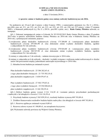 UCHWAŁA NR XIX/131/24/2016 RADY GMINY PŁOŚNICA z dnia 13 kwietnia 2016 r. w sprawie: zmian w budżecie gminy oraz zmiany uchwały budżetowej na rok 2016. Na podstawie art. 18 ust.2 pkt 4 ustawy z dnia 8 marca 1990 r. o samorządzie gminnym (t.j. Dz. U. z 2016r., poz.446) oraz art. 211, art. 212, art. 214, art. 215, art. 222, art. 235, art. 236 i art. 237 ustawy z dnia 27 sierpnia 2009 r. o finansach publicznych (t.j. Dz. U. z 2013r., poz.885 z późn. zm.), Rada Gminy Płośnica uchwala, co następuje: § 1. 1. Dokonać następujących zmian w Uchwale Nr XV/93/82/2015 Rady Gminy Płośnica z dnia 22 grudnia 2015 roku w sprawie uchwalenia budżetu Gminy Płośnica na 2016 rok oraz w budżecie Gminy Płośnica na 2016 rok, z późniejszymi zmianami, poprzez: 1) zwiększenie planu dochodów budżetowych o kwotę 175 280,00 zł. i zmniejszenie planu dochodów budżetowych o kwotę 293 803,98 zł. oraz dokonanie zmian w planie dochodów budżetu, zgodnie z załącznikiem Nr 1do uchwały; 2) zwiększenie planu wydatków budżetowych o kwotę 270 024,00 zł. i zmniejszenie planu wydatków budżetowych o kwotę 388 547,98 zł. oraz dokonanie zmian w planie wydatków budżetu, zgodnie z załącznikiem Nr 2 do uchwały; 3) zmiany w załączniku nr 3 do uchwały - zadania inwestycyjne w 2016 roku. 4) zmiany w załączniku nr 6 do uchwały - dochody i wydatki związane z realizacją zadań realizowanych w drodze umów lub porozumień między jednostkami samorządu terytorialnego w 2016 roku. 2. Aktualna kwota budżetu po zmianach wynosi: Plan dochodów budżetowych - 25 386 262,65 zł. z tego: plan dochodów bieżących - 21 755 583,18 zł. plan dochodów majątkowych - 3 630 679,47 zł. Plan wydatków budżetowych - 27 502 379,03 zł. z tego: plan wydatków bieżących - 19 356 048,64 zł. plan wydatków majątkowych - 8 146 330,39 zł. § 2. 1. Deficyt budżetu gminy wynosi 2 116 116,38 zł. i zostanie pokryty przychodami pochodzącymi z nadwyżki z lat ubiegłych w kwocie 2 116 116,38 zł. 2. Przychody budżetu wynoszą 2 565 859,38 zł., rozchody budżetu wynoszą 449 743,00 zł. 3. Źródłem finansowania rozchodów budżetu będzie nadwyżka z lat ubiegłych w kwocie 449 743,00 zł. § 3. 1. Rezerwa ogólna po zmianach wynosi 0,00 zł. 2. Rezerwa celowa wynosi 41 100,00 zł., na zarządzanie kryzysowe. § 4. Wykonanie uchwały powierza się Wójtowi Gminy Płośnica. Id: DVMNS-FRXST-LLYLB-EQPCW-AOHHT. Podpisany Strona 1 § 5. Uchwała wchodzi w życie z dniem podjęcia, obowiązuje w roku budżetowym 2016 i podlega publikacji w Dzienniku Urzędowym Województwa Warmińsko-Mazurskiego. Przewodniczący Rady Gminy Jan Makowski Id: DVMNS-FRXST-LLYLB-EQPCW-AOHHT. Podpisany Strona 2 Załacznik nr 1 do Uchwały Nr XIX/131/24/2016 Rady Gminy Płośnica z dnia 13.04.2016 DOCHODY Dział Rozdział § 1 2 3 600 60016 Nazwa 4 Plan przed zmianą 5 Zmniejszenie Zwiększenie 6 7 Plan po zmianach (5+6+7) 8 Transport i łączność 2 384 057,45 -232 070,98 0,00 2 151 986,47 Drogi publiczne gminne 2 384 057,45 -232 070,98 0,00 2 151 986,47 92 398,98 -22 398,98 0,00 70 000,00 6260 Dotacje otrzymane z państwowych funduszy celowych na finansowanie lub dofinansowanie kosztów realizacji inwestycji i zakupów inwestycyjnych jednostek sektora finansów publicznych 6300 Dotacja celowa otrzymana z tytułu pomocy finansowej udzielanej między jednostkami samorządu terytorialnego na dofinansowanie własnych zadań inwestycyjnych i zakupów inwestycyjnych 269 644,00 -70 816,00 0,00 198 828,00 6330 Dotacje celowe otrzymane z budżetu państwa na realizację inwestycji i zakupów inwestycyjnych własnych gmin (związków gmin, związków powiatowo-gminnych) 528 714,00 -138 856,00 0,00 389 858,00 Dochody od osób prawnych, od osób fizycznych i od innych jednostek nieposiadających osobowości prawnej oraz wydatki związane z ich poborem 5 601 952,06 0,00 7 580,00 5 609 532,06 Udziały gmin w podatkach stanowiących dochód budżetu państwa 1 923 484,00 0,00 7 580,00 1 931 064,00 Wpływy z podatku dochodowego od osób fizycznych 1 920 484,00 0,00 7 580,00 1 928 064,00 Różne rozliczenia 8 170 756,00 -27 830,00 0,00 8 142 926,00 Część oświatowa subwencji ogólnej dla jednostek samorządu terytorialnego 4 518 349,00 -27 830,00 0,00 4 490 519,00 Subwencje ogólne z budżetu państwa 4 518 349,00 -27 830,00 0,00 4 490 519,00 756 75621 0010 758 75801 2920 801 Oświata i wychowanie 80103 2030 80106 2030 80110 9 360,00 0,00 167 700,00 177 060,00 Oddziały przedszkolne w szkołach podstawowych 0,00 0,00 79 460,00 79 460,00 Dotacje celowe otrzymane z budżetu państwa na realizację własnych zadań bieżących gmin (związków gmin, związków powiatowo-gminnych) 0,00 0,00 79 460,00 79 460,00 Inne formy wychowania przedszkolnego 0,00 0,00 87 680,00 87 680,00 Dotacje celowe otrzymane z budżetu państwa na realizację własnych zadań bieżących gmin (związków gmin, związków powiatowo-gminnych) 0,00 0,00 87 680,00 87 680,00 120,00 0,00 560,00 680,00 0,00 0,00 560,00 560,00 Kultura fizyczna 250 703,00 -33 903,00 0,00 216 800,00 Obiekty sportowe 250 703,00 -33 903,00 0,00 216 800,00 Dotacje otrzymane z państwowych funduszy celowych na finansowanie lub dofinansowanie kosztów realizacji inwestycji i zakupów inwestycyjnych jednostek sektora finansów publicznych 183 903,00 -33 903,00 0,00 150 000,00 Gimnazja 0970 926 92601 6260 Wpływy z różnych dochodów Id: DVMNS-FRXST-LLYLB-EQPCW-AOHHT. Podpisany Strona 1 Załacznik nr 1 do Uchwały Nr XIX/131/24/2016 Rady Gminy Płośnica z dnia 13.04.2016 Ogółem: Id: DVMNS-FRXST-LLYLB-EQPCW-AOHHT. Podpisany 25 504 786,63 -293 803,98 175 280,00 25 386 262,65 Strona 2 Załacznik nr 1 do Uchwały Nr XIX/131/24/2016 Rady Gminy Płośnica z dnia 13.04.2016 Plan po zmianach (5+6+7) 8 2 151 986,47 2 151 986,47 70 000,00 198 828,00 389 858,00 5 609 532,06 1 931 064,00 1 928 064,00 8 142 926,00 4 490 519,00 4 490 519,00 177 060,00 79 460,00 79 460,00 87 680,00 87 680,00 680,00 560,00 21