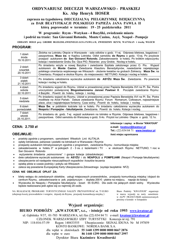 ORDYNARIUSZ DIECEZJI WARSZAWSKO - PRASKIEJ Ks. Abp Henryk HOSER zaprasza na tygodniową DIECEZJALNĄ PIELGRZYMKĘ DZIĘKCZYNNĄ za DAR BEATYFIKACJI POLSKIEGO PAPIEŻA JANA PAWŁA II którą poprowadzi w terminie: 19 - 25 października 2011 W programie: Rzym - Watykan - 4 Bazyliki, zwiedzanie miasta i podróż na trasie: San Giovanni Rotondo, Monte Casino, Asyż, Neapol - Pompeje ODDAMY HOŁD przy GROBIE BŁOGOSŁAWIONEGO JANA PAWŁA II, ZWIEDZIMY RZYM, WATYKAN i trochę WŁOCH PROGRAM: 1 dzień środa 19.10.2011 2 dzień czwartek 20.10.2011 3 dzień piątek 21.10.2011 4 dzień sobota 22.10.2011 5 dzień niedziela 6 dzień poniedziałek 7 dzień wtorek 25.10.2011. Zbiórka na Lotnisku Okęcie w Warszawie - sala odlotów o godz. 11-ej. Odprawa biletowa, bagażowa i paszportowa. Msza św. w Kaplicy Lotniska. Odlot samolotu do Rzymu o godz. 13-ej. Po przylocie przejazd autokarem do San Giovanni Rotondo. Zakwaterowanie w hotelu. Po krótkim odpoczynku kolacja i nawiedzenie Grobu Św. Ojca PIO. Różaniec przy Grobie. Nocleg w hotelu. Po śniadaniu wizyta w nowej Bazylice i zwiedzanie Szpitala założonego przez O. Pio. Wyjazd autokarem do Monte Casino. Zwiedzanie Klasztoru Benedyktynów, nawiedzenie największego polskiego cmentarza wojskowego we Włoszech - złożenie kwiatów na grobach Żołnierzy. Msza Św. na Cmentarzu. Przejazd w okolice Rzymu do miejscowości NETTUNO. Kolacja i nocleg w hotelu Po śniadaniu całodzienna wycieczka autokarem do ASYŻU. Msza Św. Zwiedzanie. Po powrocie kolacja i nocleg w hotelu. Po śniadaniu wyjazd do Rzymu. Udział w prowadzonej przez Papieża Benedykta XVI na Pl. Św. Piotra uroczystości poświęconej Błogosławionemu Janowi Pawłowi II. Początek zwiedzania Rzymu: 4 Bazyliki. Powrót do hotelu, kolacja i nocleg. Po śniadaniu wyjazd do Rzymu. Udział w prowadzonej przez Papieża Benedykta XVI na Pl. Św. Piotra modlitwie na Anioł Pański. Dalsze zwiedzanie Rzymu: Forum Romanum, Colloseum, najważniejsze place, ulice i najpiękniejsze fontanny. Czas wolny. Powrót do hotelu, kolacja i nocleg Msza Św. w pobliskim kościele lub w hotelu. Po śniadaniu całodzienna wycieczka autokarem do Neapolu i Pompejów - fakultatywnie. Zwiedzania. Powrót do hotelu. Kolacja i nocleg. Po śniadaniu ok. godz. 7-ej wyjazd autokarem na lotnisko w Rzymie. Odprawa biletowa, bagażowa i paszportowa. Odlot samolotu do Warszawy o godz. 9.4o. Przylot na Lotnisko Okęcie o godz. 12.1o. Informacje i zapisy: w Biurze "KWATOUR" CENA: 2.750 zł e-mail: [email protected] Tel.: (22) 834 84 71 www.kwatour.pl OBEJMUJE: ilość miejsc ograniczona przeloty zgodnie z programem, samolotami Włoskich Linii ALITALIA opłaty lotniskowe, paliwowe i podatki na lotniskach w Warszawie i Rzymie przejazdy autokarem klimatyzowanym zgodnie z programem, zwiedzania Rzymu - komunikacja miejska zakwaterowanie w hotelu 3* w pokojach 2 - 3 os. z łazienkami i TV - w okolicach Rzymu: NETTUNO; 1 noc w San Giovanni Rotondo wyżywienie: śniadania „wzmocnione” i gorące kolacje (obiadokolacje) dwie całodzienne wycieczki autokarowe: do ASYŻU i do NEAPOLU z POMPEJAMI (Neapol i Pompeje fakultatywnie) ubezpieczenie od następstw nieszczęśliwych wypadków i kosztów leczenia opiekę pilota w czasie podróży i pobytu we Włoszech zaleca się posiadanie Europejskiej Karty Ubezpieczenia Zdrowotnego (wydaje bezpłatnie NFZ) CENA NIE OBEJMUJE OPŁAT ZA: bilety wstępu do zwiedzanych obiektów, usługi miejscowych przewodników, przejazdy komunikacją miejską i dojazd do centrum Rzymu, zakwaterowanie w pok. pojedynczym - dopłata 200 € - płatne na miejscu, napoje do kolacji Wycieczka do Neapolu i Pompejów fakultatywna - koszt: 55 EURO. Dla osób nie jadących dzień wolny. Wycieczka będzie realizowana jeśli zgłosi się co najmniej 20 osób. NA REALIZACJĘ PROGRAMU TURYSTYCZNEGO NALEŻY PRZYGOTOWAĆ ok. 75 EURO (obejmuje koszty przewodników i wstępów, dojazdy do Rzymu, przejazdy komunikacją miejską ) Biuro Podróży “KWATOUR” organizuje w marcu wyjazdy na narty samolotem w ALPY FRANCUSKIE zainteresowanych prosimy o kontakt w listopadzie Wyjazd organizuje: BIURO PODRÓŻY „KWATOUR”, s.c., - istnieje od roku 1993 www.kwatour.pl ul. Gąbińska 9/37, 01-703 WARSZAWA, tel./fax (22) 834 84 71 e-mail: [email protected] CZŁONEK WARSZAWSKIEJ IZBY TURYSTYKI Koncesja nr rej. 791 NIP: 118-016-57-59 Regon: 140433555 Ubezpieczenie: SIGNAL IDUNA Nr M 197859 KONTO BANKOWE: NORDEA BANK S.A. dla wpłat w złotówkach 55 1440 1299 0000 0000 0667 2876 dla wpłat w euro 86 1440 1299 0000 0000 0667 2997 Dyrektor Biura Kazimierz Kwasiborski Diecezja Warszawsko-Praska P I E L G R Z Y M K A do W Ł O C H Rzym - Watykan, San Giovanni Rotondo, Monte Casino, Asyż, Neapol - Pompeje w terminie: 19 - 25. 10. 2011. (7 dni) ZGŁOSZENIE UDZIAŁU NAZWISKO . . . . . . . . . . . . . . . . . . . . . . . . . . . . . . . . . . . . . . . . . . . . . . . . . . . . . . . . . . . . . . . . . IMIĘ . . . . . . . . . . . . . . . . . . . . . . . . . . . . . . . . . .. . . . DATA UR . . . . . . . . . . . . . . . . . . . . . . . ADRES . . . . . . . . . . . . . . . . . . . . . . . . . . . . . . . . . . . . . . . . . . . . . . . . . . . . . . . . . . . . . . . . . . . . . . ulica nr domu kod miasto TEL kom . . . . . . . . . . . . . . . . . . . . . . . . Stacjonarny . . . . . . . . . . . . . . . . . . . . . . . . e-mail: . . . . . . . . . . . . . . . . . . . . . . . . . . . . . . . . . . . . . . . . . . . . . . . . . . . . N PASZPORTU lub DOWODU OS. . . . . . . . . . . . . . . . . . . . . . . . . . . . . . . . . . . . . . . . . . . . ZAWÓD, TYTUŁ . . . . . . . . . . . . . . . . . . . . . . . . . . . . . . . . . . . . . . . . . . . . . . . . . . . . . . . . . . . . DATA ZGŁOSZENIA i WPŁATY ZALICZKI 1.300zł . . . . . . . . . . . . . . . . . . . . . . . . . . . . . . WPŁATA CAŁOŚCI do dn. 17.09.2011. Warunki rezygnacji: Do dnia 14. 09. 2011. - potrącenie 250 zł Po dniu 14. 09. 2011. - potrącenie 1.000 zł Znany jest mi program i