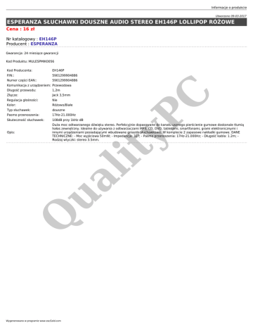 Informacje o produkcie Utworzono 09-03-2017 ESPERANZA SŁUCHAWKI DOUSZNE AUDIO STEREO EH146P LOLLIPOP RÓŻOWE Cena : 16 zł Nr katalogowy : EH146P Producent : ESPERANZA Gwarancja: 24 miesiące gwarancji Kod Produktu: MULESPMIK0056 Kod Producenta: EH146P P/N:: 5901299904886 Numer części EAN:: 5901299904886 Komunikacja z urządzeniem: Przewodowa 1,2m Złącze: Jack 3,5mm Regulacja głośności: Nie Kolor: Różowo/Białe Typ słuchawek: douszne Pasmo przenoszenia: 17Hz-21.000Hz Skuteczność słuchawek: 108dB przy 1kHz dB Opis: Duża moc odtwarzanego dźwięku stereo. Perfekcyjnie dopasowane do kanału usznego pierścienie gumowe doskonale tłumią hałas zewnętrzny. Idealne do używania z odtwarzaczami MP3, CD, DVD, tabletami, smartfonami, grami elektronicznymi i innymi urządzeniami posiadającymi wbudowane gniazdo słuchawkowe. W komplecie 2 zapasowe nakładki gumowe. DANE TECHNICZNE: - Moc wyjściowa 50mW; - Impedancja: 32?; - Pasmo przenoszenia: 17Hz-21.000Hz; - Długość kabla: 1.2m; Rodzaj wtyczki: stereo 3.5mm. Q ua lit yP C Długość przewodu: Wygenerowano w programie www.oscGold.com