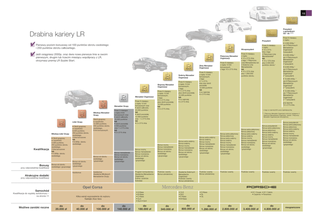 15 Prezydent z gwiazdkami Od * do ***** Drabina kariery LR Prezydent Pierwszy poziom bonusowy od 100 punktów obrotu osobistego i 250 punktów obrotu całkowitego. Wiceprezydent Jeśli osiągniesz 2000p. oraz dwie nowe pierwsze linie w swoim pierwszym, drugim lub trzecim miesiącu współpracy z LR, otrzymasz premię LR Szybki Start. Platynowy Menadżer Organizacji Złoty Menadżer Organizacji Srebrny Menadżer Organizacji Brązowy Menadżer Organizacji Menadżer Organizacji Menadżer Grupy Młodszy Menadżer Grupy Lider Grupy Młodszy Lider Grupy Kwalifikacja Bonusy przy odpowiedniej kwalifikacji t0CSØUHSVQPXZ w wysokości 4.000 punktów, 250 punktów obrotu osobistego, 3 linie bonusowe lub tQPCSPUV osobistego Bonus od obrotu osobistego i grupowego t0CSØUHSVQPXZ w wysokości 8.000 punktów, 250 punktów obrotu osobistego, 4 linie bonusowe lub tQPCSPUV osobistego Bonus od obrotu osobistego i grupowego Obrót grupowy w wysokości 12.000 punktów, 250 punktów obrotu osobistego, 6 linii bonusowych. Bonus od obrotu osobistego i grupowego Przez 3 miesiące z rzędu 8 linii bonusowych oraz tPCSØUDBLPXJUZ 16.000 punktów lub tPCSØUQP[PTUBZ 4.000 punktów oraz 1 x 21%-linia lub tYMJOJB Bonus menadżerski Bonus rozwojowy Bonus od obrotu osobistego i grupowego przy odpowiedniej kwalifikacji Bonus roczny Bonus menadżerski Bonus rozwojowy Bonus od obrotu osobistego i grupowego Program komputerowy Akademia Menadżerów Organizacji Eventy i podróże Sukcesja Autobonus Akademia Młodszych Menadżerów Grupy Autobonus Atrakcyjne dodatki Przez 6 miesięcy z rzędu 12 linii bonusowych oraz tPCSØUDBLPXJUZ 24.000 punktów lub tPCSØUQP[PTUBZ 12.000 punktów oraz 1 x 21%-linia lub tYMJOJB Przez 6 miesięcy z rzędu 12 linii bonusowych, z tego tYMJOJB plus obrót pozostały 12.000 punktów lub tYMJOJB Bonus roczny Bonus menadżerski Bonus rozwojowy Bonus od obrotu osobistego i grupowego Podróże i eventy Bonus szkoleniowy Przez 6 miesięcy z rzędu 12 linii bonusowych, z tego tYMJOJB plus obrót pozostały 12.000 punktów lub tDPOBKNOJFK 5 x 21%-linia. Bonus extra srebrny Bonus srebrny Bonus roczny Bonus menadżerski Bonus rozwojowy Bonus od obrotu osobistego i grupowego Przez 6 miesięcy z rzędu 12 linii bonusowych z tego 10 x 21%-linia. Przez 6 miesięcy z rzędu 12 linii bonusowych, z tego tY linia oraz obrót pozostały 12.000 punktów lub tDPOBKNOJFK 8 x 21%-linia. Przez 6 miesięcy z rzędu tYMJOJB z tego 1 Platynowa Linia Menadżerska lub 3 Srebrne Linie Menadżerskie lub tYMJOJB plus 1.000.000 punktów obrotu. Przez 6 miesięcy z rzędu tY linia z tego 2 Platynowe Linie Menadżerskie2 lub tYMJOJB plus 2.000.000 punktów obrotu1 Przez 6 miesięcy z rzędu: tQ1 lub 3 Platynowych Menadżerów Organizacji2 (*prezydent) tQ1 lub 4 Platynowych Menadżerów Organizacji2 (**prezydent) tQ1 lub 5 Platynowych Menadżerów Organizacji2 (***prezydent) tQ 1 lub 6 Platynowych Menadżerów Organizacji2 (****prezydent) tQ 1 lub 7 Platynowych Menadżerów Organizacji2 (*****prezydent) przy łącznie 12 x 21%-linia. Bonus extra srebrny Bonus srebrny Bonus roczny Bonus menadżerski Bonus rozwojowy Bonus od obrotu osobistego i grupowego Akademia Srebrnych Menadżerów Organizacji Podróże i eventy Bonus szkoleniowy Podróże i eventy Bonus szkoleniowy t$-4 t4-, t&,MBTB t.,MBTB t4,MBTB t4- t(- Bonus extra platynowy Bonus platynowy Bonus extra srebrny Bonus srebrny Bonus roczny Bonus menadżerski Bonus rozwojowy Bonus od obrotu osobistego i grupowego Podróże i eventy Bonus extra platynowy Bonus platynowy Bonus extra srebrny Bonus srebrny Bonus roczny Bonus menadżerski Bonus rozwojowy Bonus od obrotu osobistego i grupowego Podróże i eventy 1 z tego co najmniej 60% poza najsilniejszą linią 2 1 Platynowy Menadżer Organizacji może być zastąpiony 3 Srebrnymi Menadżerami Organizacji , jednak 1 Platynowy Menadżer Organizacji jest obowiązkowy. Bonus prezydencki Bonus extra platynowy Bonus platynowy Bonus extra srebrny Bonus srebrny Bonus roczny Bonus menadżerski Bonus rozwojowy Bonus od obrotu osobistego i grupowego Podróże i eventy Bonus prezydencki Bonus extra platynowy Bonus platynowy Bonus extra srebrny Bonus srebrny Bonus roczny Bonus menadżerski Bonus rozwojowy Bonus od obrotu osobistego i grupowego Podróże i eventy Opel Corsa Samochód Kwalifikacje do wypłaty autobonusu – na stronie 11 Możliwe zarobki roczne t",MBTB t#,MBTB t$,MBTB t$-" t(-"t(-, Kilka wersji wyposażenia do wyboru Naklejki Aloe Vera do 20.000 zł do 40.000 zł do 100.000 zł do 140.000 zł do 180.000 zł do 340.000 zł do 800.000 zł do 1.280.000 zł t$PVQFt$BCSJP t$BZFOOFt1BOBNFSB do 2.800.000 zł do 3.400.000 zł do 4.800.000 zł nieograniczone