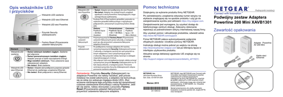Opis wskaźników LED i przycisków Element Opis Wskaźnik LED sieci Powerline • Świeci. Adapter jest podłączony do sieci Powerline. • Nie świeci. Adapter nie znalazł innych urządzeń zgodnych z siecią Powerline i korzystających z tego samego klucza szyfrowania. Funkcja Pick A Plug (wybierz gniazdko), pozwala na wybranie gniazdka elektrycznego z najszybszym połączeniem, oznaczonym za pomocą koloru diody LED. Zielona: Pomarańczowa: Czerwona: Prędkość łącza Prędkość łącza Prędkość > 80 Mb/s > 50 i < 80 Mb/s łącza < 50 (Szybkie) (Średnie) Mb/s (Wolne) Przytrzymaj przycisk Factory Reset (Przywracania ustawień fabrycznych) przez sekundę, a następnie puść go, aby przywrócić ustawienia fabryczne adaptera Powerline. Po podłączeniu nowego adaptera AV naciśnij i przytrzymaj przycisk Security (Zabezpieczeń) przez 2 sekundy, a następnie naciśnij ten sam przycisk na innym adapterze z sieci i przytrzymaj go przez 2 sekundy. Oba przyciski należy nacisnąć w odstępie nieprzekraczającym 2 minut. Aby włączyć tryb oszczędzania energii, należy wcisnąć i przytrzymać przycisk Security (Zabezpieczeń) na 10 lub więcej sekund, a następnie puścić. Ponowne wciśnięcie przycisku Security (Zabezpieczeń) włącza ponownie zasilanie adaptera. Wskaźnik LED zasilania Wskaźnik LED sieci Ethernet Wskaźnik LED sieci Powerline Przycisk Security (Zabezpieczeń) Factory Reset (Przywracania ustawień fabrycznych) Element Opis Wskaźnik LED zasilania • Świeci zielonym światłem ciągłym. Zasilanie jest włączone. • Świeci pomarańczowym światłem ciągłym. Adapter pracuje w trybie oszczędzania energii. • Miga światłem zielonym. Trwa ustawianie opcji zabezpieczeń adaptera. • Nie świeci. Brak zasilania. • Świeci. Adapter jest podłączony poprzez gniazdo Ethernet do zasilanego urządzenia Ethernet. • Nie świeci. Brak połączenia z siecią Ethernet. Wskaźnik LED sieci Ethernet Przywrócenie ustawień fabrycznych Przycisk zabezpieczeń Ostrzeżenie: Przycisku Security (Zabezpieczeń) na adapterze Powerline nie należy naciskać, jeśli proces instalacji nie został zakończony, a adaptery nie komunikują się ze sobą (co wskazuje migająca dioda LED). Zbyt wczesne naciśnięcie tego przycisku może też spowodować czasowe zawieszenie komunikacji z siecią Powerline. Jeśli tak się stanie, należy skorzystać z przycisku Factory Reset (Przywracania ustawień fabrycznych), aby przywrócić ustawienia fabryczne adaptera. Pomoc techniczna Dziękujemy za wybranie produktu firmy NETGEAR. Po zainstalowaniu urządzenia odszukaj numer seryjny na etykiecie znajdującej się na spodzie produktu i użyj go do zarejestrowania wyrobu pod adresem https://my.netgear.com. Zarejestrowanie jest wymagane, by uzyskać dostęp do telefonicznego centrum obsługi. Zalecamy dokonanie rejestracji za pośrednictwem witryny internetowej naszej firmy. Aby uzyskać pomoc i aktualizacje produktów, odwiedź adres http://www.NETGEAR.com/support. Firma NETGEAR zaleca wykorzystywanie wyłącznie oficjalnych zasobów i środków pomocy NETGEAR. Instrukcję obsługi można pobrać po wejściu na stronę http://downloadcenter.netgear.com lub po kliknięciu łącza w interfejsie użytkownika produktu. Aktualna wersja deklaracji zgodności UE znajduje się na stronie: http://support.netgear.com/app/answers/detail/a_id/11621/. NETGEAR, Inc. 350 East Plumeria Drive San Jose, CA 95134 USA Marzec 2013 NETGEAR, logo NETGEAR oraz Connect with Innovation są znakami towarowymi oraz/lub zastrzeżonymi znakami towarowymi należącymi do firmy NETGEAR Inc. oraz/lub jej spółek zależnych w USA oraz/lub innych państwach. Informacje mogą ulec zmianie bez powiadomienia. © NETGEAR, Inc. Wszelkie prawa zastrzeżone. Sprzęt przeznaczony do użytku wewnątrz budynków na terenie państw UE, krajów EFTA oraz Szwajcarii. Podręcznik instalacji Podwójny zestaw Adaptera Powerline 200 Mini XAVB1301 Zawartość opakowania Adapter Powerline AV 200 Mini Kable sieci Ethernet Pokój 1 Pokój 2 Informacje dotyczące bezpieczeństwa • • • Wejście sieciowe: 100-240 V~, maksymalnie 60m A Temperatura otoczenia podczas pracy: od 0°C do 35°C Gniazdo wyjściowe powinno być łatwodostępne i zamontowane blisko sprzętu. Porady dotyczące rozwiązywania problemów Wskaźnik LED zasilania nie świeci Wskaźnik LED zasilania świeci na pomarańczowo Wskaźnik LED sieci Powerline nie świeci Wskaźnik LED sieci Powerline świeci na pomarańczowo lub czerwono Wskaźnik LED sieci Ethernet nie świeci Kompatybilne urządzenia Powerline i HomePlug z certyfikatem AV to między innymi NETGEAR XAV101, XAV1004, XAV2001, XAV2501, XAU2511, XAV2101, XAV2602, XAV1401, XAV1601, i XAVN2001. Pełną listę urządzeń posiadających certyfikat AV można znaleźć na stronie http://www.homeplug.org/certified_products Upewnij się, że gniazdko sieciowe jest pod napięciem, i że urządzenia Powerline nie są podłączone do prądu za pomocą przedłużaczy, listew zasilających czy osłon przeciwprzepięciowych. Adapter Powerline jest w trybie oszczędzania energii. Aby powrócić do trybu zwykłego wciśnij przycisk Security (Zabezpieczeń). • Jeżeli ustawiłeś już zabezpieczenia sieciowe, upewnij się, że wszystkie urządzenia Powerline korzystają z tego samego klucza szyfrowania. Więcej informacji można znaleźć w internetowej Instrukcji obsługi. • Przytrzymaj przycisk resetowania każdego urządzenia przez sekundę, aby przywrócić ustawienia fabryczne adaptera Powerline. Przesuń bliżej urządzenie Powerline. • Upewnij się, że kable Ethernet działają i są solidnie podłączone do urządzeń. • Przytrzymaj przycisk Factory Reset (Przywracania ustawień fabrycznych) każdego urządzenia przez sekundę, aby przywrócić ustawienia fabryczne adaptera Powerline.