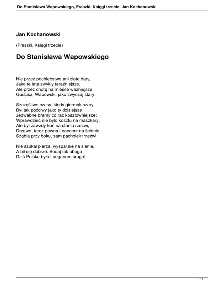 Do Stanisława Wapowskiego, Fraszki, Księgi trzecie, Jan Kochanowski Jan Kochanowski (Fraszki, Księgi trzecie) Do Stanisława Wapowskiego Nie przez pochlebstwo ani złote dary, Jako te lata zwykły teraźniejsze, Ale przez cnotę na mieśce ważniejsze, Godzisz, Wapowski, jako zwyczaj stary. Szczęśliwe czasy, kiedy giermak szary Był tak poćciwy jako ty dzisiejsze Jedwabne bramy co raz kosztowniejsze; Wprawdzieć nie było kosztu na maszkary, Ale był zawżdy koń na staniu rzeźwi, Drzewo, tarcz pewna i pancerz na ścienie, Szabla przy boku, sam pachołek trzeźwi. Nie szukał pierza, wyspał się na sienie, A bił się dobrze. Bodaj tak uboga Dziś Polska była i poganom sroga! 1/1