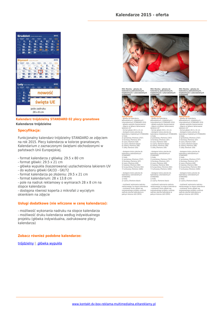 Kalendarze 2015 - oferta Kalendarz trójdzielny STANDARD 02 plecy granatowe Kalendarze trójdzielne Specyfikacja: Funkcjonalny kalendarz trójdzielny STANDARD ze zdjęciem na rok 2015. Plecy kalendarza w kolorze granatowym. Kalendarium z zaznaczonymi świętami obchodzonymi w państwach Unii Europejskiej. - format kalendarza z główką: 29.5 x 80 cm - format główki: 29.5 x 21 cm - główka wypukła (kaszerowana) uszlachetniona lakierem UV - do wyboru główki GK/33 - GK/72 - format kalendarza po złożeniu: 29.5 x 21 cm - format kalendarium: 28 x 13.8 cm - pole na nadruk reklamowy o wymiarach 28 x 8 cm na stopce kalendarza - dostępna również koperta z mikrofali z wyciętym okienkiem na zdjęcie M01 Monika - główka do kalendarzy jednodzielnych, trójdzielnych i czterodzielnych STANDARD M01 Monika - główka do kalendarzy jednodzielnych, trójdzielnych i czterodzielnych STANDARD M01 Monika - główka do kalendarzy jednodzielnych, trójdzielnych i czterodzielnych STANDARD Specyfikacja: - główka do kalendarzy jednodzielnych, trójdzielnych i czterodzielnych STANDARD 2016 - główka wypukła (kaszerowana) - zdjęcie na główce lakierowane lakierem UV - format główki 29.5 x 21 cm - dostępne kolory pleców do kalendarzy trójdzielnych STANDARD: 1/ biały 2/ granatowy (Pantone 2767) 3/ bordowy (Pantone 187) 4/ szary (Pantone 428) 5/ czarny (Pantone black) 6/ zielony (Pantone 348) 7/ żółty (Pantone 109) Specyfikacja: - główka do kalendarzy jednodzielnych, trójdzielnych i czterodzielnych STANDARD 2016 - główka wypukła (kaszerowana) - zdjęcie na główce lakierowane lakierem UV - format główki 29.5 x 21 cm - dostępne kolory pleców do kalendarzy trójdzielnych STANDARD: 1/ biały 2/ granatowy (Pantone 2767) 3/ bordowy (Pantone 187) 4/ szary (Pantone 428) 5/ czarny (Pantone black) 6/ zielony (Pantone 348) 7/ żółty (Pantone 109) Specyfikacja: - główka do kalendarzy jednodzielnych, trójdzielnych i czterodzielnych STANDARD 2016 - główka wypukła (kaszerowana) - zdjęcie na główce lakierowane lakierem UV - format główki 29.5 x 21 cm - dostępne kolory pleców do kalendarzy trójdzielnych STANDARD: 1/ biały 2/ granatowy (Pantone 2767) 3/ bordowy (Pantone 187) 4/ szary (Pantone 428) 5/ czarny (Pantone black) 6/ zielony (Pantone 348) 7/ żółty (Pantone 109) - dostępne kolory pleców do kalendarzy jednodzielnych STANDARD: 1/ biały 2/ granatowy (Pantone 2767) 3/ bordowy (Pantone 187) 4/ szary (Pantone 428) 5/ kawowy (Pantone 480) 6/ burgundowy (Pantone 492) 7/ turkusowy (Pantone 3285) - dostępne kolory pleców do kalendarzy jednodzielnych STANDARD: 1/ biały 2/ granatowy (Pantone 2767) 3/ bordowy (Pantone 187) 4/ szary (Pantone 428) 5/ kawowy (Pantone 480) 6/ burgundowy (Pantone 492) 7/ turkusowy (Pantone 3285) - dostępne kolory pleców do kalendarzy jednodzielnych STANDARD: 1/ biały 2/ granatowy (Pantone 2767) 3/ bordowy (Pantone 187) 4/ szary (Pantone 428) 5/ kawowy (Pantone 480) 6/ burgundowy (Pantone 492) 7/ turkusowy (Pantone 3285) - dostępne kolory pleców do kalendarzy czterodzielnych STANDARD: 1/ biały 2/ czarny (Pantone black) - dostępne kolory pleców do kalendarzy czterodzielnych STANDARD: 1/ biały 2/ czarny (Pantone black) - dostępne kolory pleców do kalendarzy czterodzielnych STANDARD: 1/ biały 2/ czarny (Pantone black) - możliwość wykonania nadruku reklamowego na stopce kalendarza - możliwość druku główki wg indywdualnego projektu oraz/lub zadruku pleców kalendarza w pełnym kolorze (4/0 CMYK) - możliwość wykonania nadruku reklamowego na stopce kalendarza - możliwość druku główki wg indywdualnego projektu oraz/lub zadruku pleców kalendarza w pełnym kolorze (4/0 CMYK) - możliwość wykonania nadruku reklamowego na stopce kalendarza - możliwość druku główki wg indywdualnego projektu oraz/lub zadruku pleców kalendarza w pełnym kolorze (4/0 CMYK) Usługi dodatkowe (nie wliczone w cenę kalendarza): - możliwość wykonania nadruku na stopce kalendarza - możliwość druku kalendarza według indywidualnego projektu (główka indywidualna, zadrukowane plecy kalendarza) Zobacz również podobne kalendarze: trójdzielny | główka wypukła www.kontakt.dv-box-reklama-multimedialna.elitareklamy.pl Kalendarze 2015 - oferta M01 Monika - główka do kalendarzy jednodzielnych, trójdzielnych i czterodzielnych STANDARD M01 Monika - główka do kalendarzy jednodzielnych, trójdzielnych i czterodzielnych STANDARD M01 Monika - główka do kalendarzy jednodzielnych, trójdzielnych i czterodzielnych STANDARD Specyfikacja: - główka do kalendarzy jednodzielnych, trójdzielnych i czterodzielnych STANDARD 2016 - główka wypukła (kaszerowana) - zdjęcie na główce lakierowane lakierem UV - format główki 29.5 x 21 cm - dostępne kolory pleców do kalendarzy trójdzielnych STANDARD: 1/ biały 2/ granatowy (Pantone 2767) 3/ bordowy (Pantone 187) 4/ szary (Pantone 428) 5/ czarny (Pantone black) 6/ zielony (Pantone 348) 7/ żółty (Pantone 109) Specyfikacja: - główka do kalendarzy jednodzielnych, trójdzielnych i czterodzielnych STANDARD 2016 - główka wypukła (kaszerowana) - zdjęcie na główce lakierowane lakierem UV - format główki 29.5 x 21 cm - dostępne kolory pleców do kalendarzy trójdzielnych STANDARD: 1/ biały 2/ granatowy (Pantone 2767) 3/ bordowy (Pantone 187) 4/ szary (Pantone 428) 5/ czarny (Pantone black) 6/ zielony (Pantone 348) 7/ żółty (Pantone 109) Specyfikacja: - główka do kalendarzy jednodzielnych, trójdzielnych i czterodzielnych STANDARD 2016 - główka wypukła (kaszerowana) - zdjęcie na główce lakierowane lakierem UV - format główki 29.5 x 21 cm - dostępne kolory pleców do kalendarzy trójdzielnych STANDARD: 1/ biały 2/ granatowy (Pantone 2767) 3/ bordowy (Pantone 187) 4/ szary (Pantone 428) 5/ czarny (Pantone black) 6/ zielony (Pantone 348) 7/ żółty (Pantone 109) - dostępne kolory pleców do kalendarzy jednodzielnych STANDARD: 1/ biały 2/ granatowy (Pantone 2767) 3/ bordowy (Pantone 1