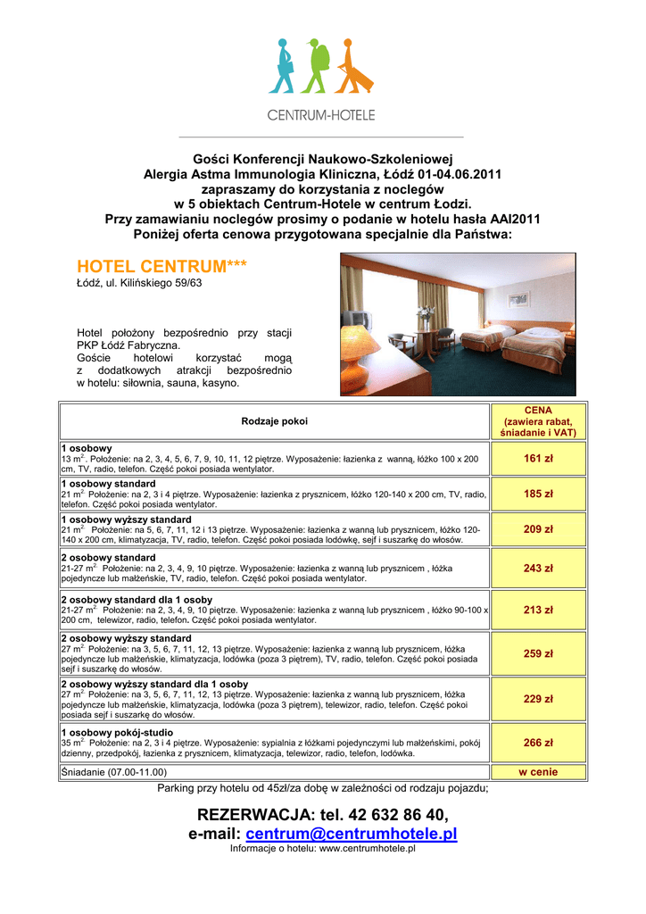 Gości Konferencji Naukowo-Szkoleniowej Alergia Astma Immunologia Kliniczna, Łódź 01-04.06.2011 zapraszamy do korzystania z noclegów w 5 obiektach Centrum-Hotele w centrum Łodzi. Przy zamawianiu noclegów prosimy o podanie w hotelu hasła AAI2011 PoniŜej oferta cenowa przygotowana specjalnie dla Państwa: HOTEL CENTRUM*** Łódź, ul. Kilińskiego 59/63 Hotel połoŜony bezpośrednio przy stacji PKP Łódź Fabryczna. Goście hotelowi korzystać mogą z dodatkowych atrakcji bezpośrednio w hotelu: siłownia, sauna, kasyno. Rodzaje pokoi CENA (zawiera rabat, śniadanie i VAT) 1 osobowy 13 m2.. PołoŜenie: na 2, 3, 4, 5, 6, 7, 9, 10, 11, 12 piętrze. WyposaŜenie: łazienka z wanną, łóŜko 100 x 200 cm, TV, radio, telefon. Część pokoi posiada wentylator. 161 zł 1 osobowy standard 21 m2. PołoŜenie: na 2, 3 i 4 piętrze. WyposaŜenie: łazienka z prysznicem, łóŜko 120-140 x 200 cm, TV, radio, telefon. Część pokoi posiada wentylator. 185 zł 1 osobowy wyŜszy standard 21 m2. PołoŜenie: na 5, 6, 7, 11, 12 i 13 piętrze. WyposaŜenie: łazienka z wanną lub prysznicem, łóŜko 120140 x 200 cm, klimatyzacja, TV, radio, telefon. Część pokoi posiada lodówkę, sejf i suszarkę do włosów. 209 zł 2 osobowy standard 21-27 m2. PołoŜenie: na 2, 3, 4, 9, 10 piętrze. WyposaŜenie: łazienka z wanną lub prysznicem , łóŜka pojedyncze lub małŜeńskie, TV, radio, telefon. Część pokoi posiada wentylator. 243 zł 2 osobowy standard dla 1 osoby 21-27 m2. PołoŜenie: na 2, 3, 4, 9, 10 piętrze. WyposaŜenie: łazienka z wanną lub prysznicem , łóŜko 90-100 x 200 cm, telewizor, radio, telefon. Część pokoi posiada wentylator. 213 zł 2 osobowy wyŜszy standard 27 m2. PołoŜenie: na 3, 5, 6, 7, 11, 12, 13 piętrze. WyposaŜenie: łazienka z wanną lub prysznicem, łóŜka pojedyncze lub małŜeńskie, klimatyzacja, lodówka (poza 3 piętrem), TV, radio, telefon. Część pokoi posiada sejf i suszarkę do włosów. 259 zł 2 osobowy wyŜszy standard dla 1 osoby 27 m2. PołoŜenie: na 3, 5, 6, 7, 11, 12, 13 piętrze. WyposaŜenie: łazienka z wanną lub prysznicem, łóŜka pojedyncze lub małŜeńskie, klimatyzacja, lodówka (poza 3 piętrem), telewizor, radio, telefon. Część pokoi posiada sejf i suszarkę do włosów. 229 zł 1 osobowy pokój-studio 35 m2. PołoŜenie: na 2, 3 i 4 piętrze. WyposaŜenie: sypialnia z łóŜkami pojedynczymi lub małŜeńskimi, pokój dzienny, przedpokój, łazienka z prysznicem, klimatyzacja, telewizor, radio, telefon, lodówka. 266 zł w cenie Śniadanie (07.00-11.00) Parking przy hotelu od 45zł/za dobę w zaleŜności od rodzaju pojazdu; REZERWACJA: tel. 42 632 86 40, e-mail: [email protected] Informacje o hotelu: www.centrumhotele.pl HOTEL ŚWIATOWIT*** Łódź, al. Kościuszki 68 Hotel połoŜony w centrum miasta, tuŜ przy słynnej ul. Piotrkowskiej, na której skupia się Ŝycie kulturalne i rozrywkowe miasta. Rodzaje pokoi CENA (zawiera rabat, śniadanie i VAT) 1 osobowy 15 m². PołoŜenie: na 3 piętrze. WyposaŜenie: łazienka z prysznicem, tv, radio, telefon. 144 zł 1 osobowy standard 15 m2 . PołoŜenie: na 1 i 3 piętrze. WyposaŜenie: pokoje w stylu ludowym lub standardowym, łóŜka 90 x 200 cm, łazienka z prysznicem, tv, radio, telefon. Część pokoi z klimatyzacją. 176 zł 1 osobowy wyŜszy standard 15 m2 . PołoŜenie: na 1, 2, 8, 9, 10, 11 piętrze. WyposaŜenie: łóŜka o szerokości od 120 do 180 x 200 cm, tv, radio telefon, 188 zł 2 osobowy 15 m2 . PołoŜenie: na 4, 5, 7 piętrze. WyposaŜenie: łóŜka pojedyncze lub małŜeńskie, tv, radio, telefon. 223 zł 2 osobowy wyŜszy standard 15 m2 . PołoŜenie: na 6, 11 piętrze. WyposaŜenie: łóŜka pojedyncze lub małŜeńskie, tv, radio, telefon. Modernizacja pokoi 2006 r. Część pokoi posiada klimatyzację 252 zł pokój 2 osobowy dla 1 osoby 15 m2 . PołoŜenie: na 4, 5, 7 piętrze. WyposaŜenie: łóŜka pojedyncze lub małŜeńskie, telewizor, radio, telefon. Część pokoi posiada lodówkę i klimatyzację. śniadanie (pon-pt 06.30-10.30; sob-nie 07.00-11.00) Parking przy hotelu od 35zł/za dobę w zaleŜności od rodzaju pojazdu; REZERWACJA: tel. 42 636 36 37, e-mail: [email protected] Informacje o hotelu: www.centrumhotele.pl 195 zł w cenie HOTEL SAVOY** Łódź, ul. Traugutta 6 Hotel w stylu retro, posiada stylową restaurację i kawiarnię. Goście wjeŜdŜają na piętra zabytkową windą z obsługą. Hotel połoŜony jest doskonale, tuŜ przy sławnej ul. Piotrkowskiej będącej wizytówką Łodzi. W pobliŜu znajdują się: kina, puby i restauracje. Od stacji stacji PKP Łódź Fabryczna jest stąd około 500 m. Rodzaje pokoi 1 osobowy 9 m2 ; połoŜenie - od dziedzińca. WyposaŜenie: łazienka z wanną lub prysznicem, TV, radio, telefon. 1 osobowy 12 m2 , połoŜenie - od dziedzińca. WyposaŜenie: łazienka z prysznicem, TV, radio, telefon 1 osobowy 16 m2 , połoŜenie - od dziedzińca. WyposaŜenie: łazienka z prysznicem, TV, radio, telefon CENA DLA (zawiera rabat, śniadanie i VAT) 104 zł 144 zł 156 zł 1 osobowy wyŜszy standard 18 m2 , połoŜenie - od dziedzińca. Pokoje jedno- lub dwupomieszczeniowe. WyposaŜenie: łazienka z prysznicem, telewizor, radio, telefon. MoŜliwość dostawki. 167 zł 1 osobowy w stylu retro 18 m2 , połoŜenie - od dziedzińca. Stylowe wyposaŜenie: meble w stylu retro, sekretarzyk, łazienka z prysznicem i biczami wodnymi, TV, radio, telefon. 2 osobowy 188 zł 20 m2 , połoŜenie - od dziedzińca lub od frontu. Pokoje składają się z jednego pomieszczenia lub sypialni i pokoju dziennego. WyposaŜenie: łóŜka pojedyncze lub małŜeńskie, TV, radio, telefon 217 zł 2 osobowy w stylu retro 256 zł 20 m2 , połoŜenie – od dziedzińca. WyposaŜenie: meble w stylu retro, sekretarzyk, łóŜko małŜeńskie, TV, radio, telefon. w cenie Śniadanie (07.00-11.00) Parking strzeŜony około 200m od hotelu – od 30zł/za dobę w zaleŜności od rodzaju pojazdu; REZERWACJA: tel. 42 632 93 60 e-mail: