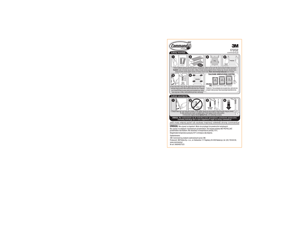 17202 To Apply Łatwy montaż command.pl 2 1 3 4 PRZÓD TYŁ 30 SEKUND 1. Wytrzeć delikatnie wybraną powierzchnię alkoholem izopropylowym, podłoże musi być suche. Nie używać domowych środków czyszczących. Rozdzielić 2 paski. 2. Docisnąć rzepy do siebie, aż klikną. 3. Usunąć czerwony papierek ochronny. Przyłożyć rzep z tyłu ramy i docisnąć mocno. Usunąć pozostałe czerwone papierki ochronne. 4. Przyłożyć ramę do ściany. Ważne: mocno docisnąć każdą część przez 30 sekund. *ZALECANE UMIESZCZENIE RZEPÓW: KLIK!! KLIK!! 5 1 6 2 PRZÓD 3 KLIK!! 30 SEKUND Do 1,8 kg Do 900 g Do 450 g KLIK!! Przykleić paski w 2/3 od góry ZALECA SIĘ 7,6x12,7cm 12,7x17,8cm 13x25cm 5. Chwyć ramę od dołu i rozłącz rzepy. Nie ciągnąć rzepów pod ostrym kątem w swoim kierunku (mogą się zerwać). Mocno dociśnij do ściany każdy rzep w 3 miejscach Poczekać min. 7 dni po pomalowaniu ścian, by powiesić obraz. Jeżeli na tyle ramy przez 30 sekund. 6. Należy poczekać godzinę przed mocowaniem ramy. Dociśnij jest papier to należy go usunąć. Rzepy muszą przylegać bezpośrednio do ramy. mocno rzepy razem, aż klikną. Jeżeli przedmiot nie jest równo, zmień pozycję. Łatwe usunięcie 2 3 PROSTO W DÓŁ POWOLI 1 4 15 cm 1. Chwycić dolne rogi i usuń ramę jak na rysunku. 2. Nie ciągnąć rzepów pod ostrym kątem w swoim kierunku (mogą się zerwać). 3. Lekko nacisnąć górę rzepów i pociągnąć pasek. Powoli ciągnąć do dołu wzdłuż podłoża. 4. Kontynuować ciągnięcie na co najmniej 15 cm, aż do całkowitego usunięcia. UWAGA: Nie zastosowanie się do instrukcji może spowodować uszkodzenie powierzchni. Zachowaj instrukcję lub w razie wątpliwości wejdź na stronę command.pl. Jeśli masz więcej pytań lub szukasz inspiracji odwiedź stronę command.pl UWAGA: Nie używać na tapetach. Może nie przylegać do powierzchni winylowych. Nie używać na antykach i kosztownych przedmiotach. Dla bezpieczeństwa NIE PRZYKLEJAĆ przedmiotów nad łóżkiem. Nie stosować w temperaturze poniżej 10°C. Długotrwała temperatura powyżej 40°C zmniejsza siłę klejenia. Opatentowane. 3M i Command są znakami zastrzeżonymi przez 3M. Producent: 3M Polska Sp. z o.o., al. Katowicka 117 Kajetany 05-830 Nadarzyn, tel. (22) 739 60 00, www.command.pl Nr art. XA004837523