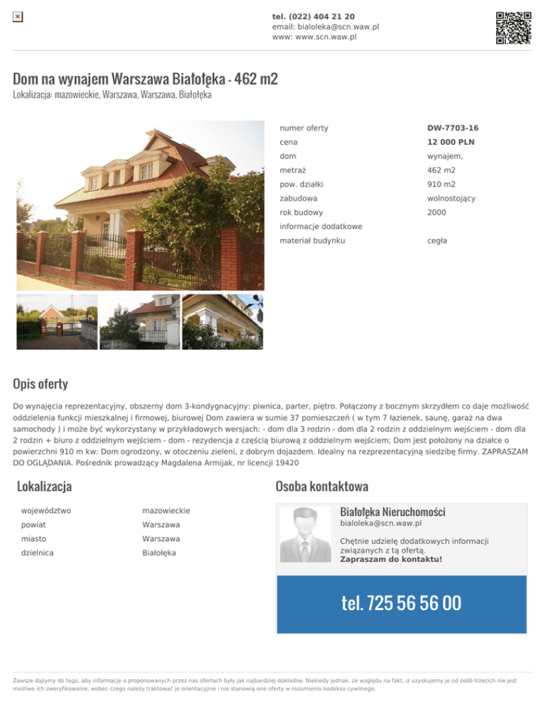 tel. (022) 404 21 20 email: [email protected] www: www.scn.waw.pl Dom na wynajem Warszawa Białołęka - 462 m2 Lokalizacja: mazowieckie, Warszawa, Warszawa, Białołęka numer oferty DW-7703-16 cena 12 000 PLN dom wynajem, metraż 462 m2 pow. działki 910 m2 zabudowa wolnostojący rok budowy 2000 informacje dodatkowe materiał budynku cegła Opis oferty Do wynajęcia reprezentacyjny, obszerny dom 3-kondygnacyjny: piwnica, parter, piętro. Połączony z bocznym skrzydłem co daje możliwość oddzielenia funkcji mieszkalnej i firmowej, biurowej Dom zawiera w sumie 37 pomieszczeń ( w tym 7 łazienek, saunę, garaż na dwa samochody ) i może być wykorzystany w przykładowych wersjach: - dom dla 3 rodzin - dom dla 2 rodzin z oddzielnym wejściem - dom dla 2 rodzin + biuro z oddzielnym wejściem - dom - rezydencja z częścią biurową z oddzielnym wejściem; Dom jest położony na działce o powierzchni 910 m kw: Dom ogrodzony, w otoczeniu zieleni, z dobrym dojazdem. Idealny na rezprezentacyjną siedzibę firmy. ZAPRASZAM DO OGLĄDANIA. Pośrednik prowadzący Magdalena Armijak, nr licencji 19420 Lokalizacja Osoba kontaktowa Białołęka Nieruchomości województwo mazowieckie powiat Warszawa [email protected] miasto Warszawa dzielnica Białołęka Chętnie udzielę dodatkowych informacji związanych z tą ofertą. Zapraszam do kontaktu! tel. 725 56 56 00 Zawsze dążymy do tego, aby informacje o proponowanych przez nas ofertach były jak najbardziej dokładne. Niekiedy jednak, ze względu na fakt, iż uzyskujemy je od osób trzecich nie jest możliwe ich zweryfikowanie, wobec czego należy traktować je orientacyjnie i nie stanowią one oferty w rozumieniu kodeksu cywilnego.