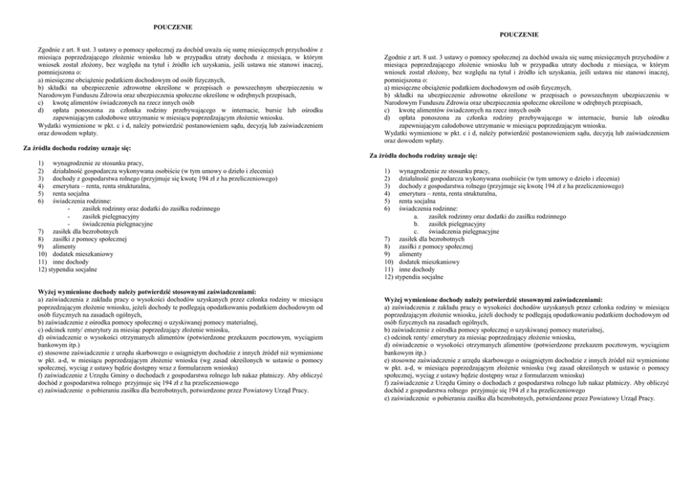 POUCZENIE POUCZENIE Zgodnie z art. 8 ust. 3 ustawy o pomocy społecznej za dochód uwaŜa się sumę miesięcznych przychodów z miesiąca poprzedzającego złoŜenie wniosku lub w przypadku utraty dochodu z miesiąca, w którym wniosek został złoŜony, bez względu na tytuł i źródło ich uzyskania, jeśli ustawa nie stanowi inaczej, pomniejszona o: a) miesięczne obciąŜenie podatkiem dochodowym od osób fizycznych, b) składki na ubezpieczenie zdrowotne określone w przepisach o powszechnym ubezpieczeniu w Narodowym Funduszu Zdrowia oraz ubezpieczenia społeczne określone w odrębnych przepisach, c) kwotę alimentów świadczonych na rzecz innych osób d) opłata ponoszona za członka rodziny przebywającego w internacie, bursie lub ośrodku zapewniającym całodobowe utrzymanie w miesiącu poprzedzającym złoŜenie wniosku. Wydatki wymienione w pkt. c i d, naleŜy potwierdzić postanowieniem sądu, decyzją lub zaświadczeniem oraz dowodem wpłaty. Zgodnie z art. 8 ust. 3 ustawy o pomocy społecznej za dochód uwaŜa się sumę miesięcznych przychodów z miesiąca poprzedzającego złoŜenie wniosku lub w przypadku utraty dochodu z miesiąca, w którym wniosek został złoŜony, bez względu na tytuł i źródło ich uzyskania, jeśli ustawa nie stanowi inaczej, pomniejszona o: a) miesięczne obciąŜenie podatkiem dochodowym od osób fizycznych, b) składki na ubezpieczenie zdrowotne określone w przepisach o powszechnym ubezpieczeniu w Narodowym Funduszu Zdrowia oraz ubezpieczenia społeczne określone w odrębnych przepisach, c) kwotę alimentów świadczonych na rzecz innych osób d) opłata ponoszona za członka rodziny przebywającego w internacie, bursie lub ośrodku zapewniającym całodobowe utrzymanie w miesiącu poprzedzającym wniosku. Wydatki wymienione w pkt. c i d, naleŜy potwierdzić postanowieniem sądu, decyzją lub zaświadczeniem oraz dowodem wpłaty. Za źródła dochodu rodziny uznaje się: Za źródła dochodu rodziny uznaje się: 1) 2) 3) 4) 5) 6) wynagrodzenie ze stosunku pracy, działalność gospodarcza wykonywana osobiście (w tym umowy o dzieło i zlecenia) dochody z gospodarstwa rolnego (przyjmuje się kwotę 194 zł z ha przeliczeniowego) emerytura – renta, renta strukturalna, renta socjalna świadczenia rodzinne: zasiłek rodzinny oraz dodatki do zasiłku rodzinnego zasiłek pielęgnacyjny świadczenia pielęgnacyjne 7) zasiłek dla bezrobotnych 8) zasiłki z pomocy społecznej 9) alimenty 10) dodatek mieszkaniowy 11) inne dochody 12) stypendia socjalne WyŜej wymienione dochody naleŜy potwierdzić stosownymi zaświadczeniami: a) zaświadczenia z zakładu pracy o wysokości dochodów uzyskanych przez członka rodziny w miesiącu poprzedzającym złoŜenie wniosku, jeŜeli dochody te podlegają opodatkowaniu podatkiem dochodowym od osób fizycznych na zasadach ogólnych, b) zaświadczenie z ośrodka pomocy społecznej o uzyskiwanej pomocy materialnej, c) odcinek renty/ emerytury za miesiąc poprzedzający złoŜenie wniosku, d) oświadczenie o wysokości otrzymanych alimentów (potwierdzone przekazem pocztowym, wyciągiem bankowym itp.) e) stosowne zaświadczenie z urzędu skarbowego o osiągniętym dochodzie z innych źródeł niŜ wymienione w pkt. a-d, w miesiącu poprzedzającym złoŜenie wniosku (wg zasad określonych w ustawie o pomocy społecznej, wyciąg z ustawy będzie dostępny wraz z formularzem wniosku) f) zaświadczenie z Urzędu Gminy o dochodach z gospodarstwa rolnego lub nakaz płatniczy. Aby obliczyć dochód z gospodarstwa rolnego przyjmuje się 194 zł z ha przeliczeniowego e) zaświadczenie o pobieraniu zasiłku dla bezrobotnych, potwierdzone przez Powiatowy Urząd Pracy. 1) 2) 3) 4) 5) 6) wynagrodzenie ze stosunku pracy, działalność gospodarcza wykonywana osobiście (w tym umowy o dzieło i zlecenia) dochody z gospodarstwa rolnego (przyjmuje się kwotę 194 zł z ha przeliczeniowego) emerytura – renta, renta strukturalna, renta socjalna świadczenia rodzinne: a. zasiłek rodzinny oraz dodatki do zasiłku rodzinnego b. zasiłek pielęgnacyjny c. świadczenia pielęgnacyjne 7) zasiłek dla bezrobotnych 8) zasiłki z pomocy społecznej 9) alimenty 10) dodatek mieszkaniowy 11) inne dochody 12) stypendia socjalne WyŜej wymienione dochody naleŜy potwierdzić stosownymi zaświadczeniami: a) zaświadczenia z zakładu pracy o wysokości dochodów uzyskanych przez członka rodziny w miesiącu poprzedzającym złoŜenie wniosku, jeŜeli dochody te podlegają opodatkowaniu podatkiem dochodowym od osób fizycznych na zasadach ogólnych, b) zaświadczenie z ośrodka pomocy społecznej o uzyskiwanej pomocy materialnej, c) odcinek renty/ emerytury za miesiąc poprzedzający złoŜenie wniosku, d) oświadczenie o wysokości otrzymanych alimentów (potwierdzone przekazem pocztowym, wyciągiem bankowym itp.) e) stosowne zaświadczenie z urzędu skarbowego o osiągniętym dochodzie z innych źródeł niŜ wymienione w pkt. a-d, w miesiącu poprzedzającym złoŜenie wniosku (wg zasad określonych w ustawie o pomocy społecznej, wyciąg z ustawy będzie dostępny wraz z formularzem wniosku) f) zaświadczenie z Urzędu Gminy o dochodach z gospodarstwa rolnego lub nakaz płatniczy. Aby obliczyć dochód z gospodarstwa rolnego przyjmuje się 194 zł z ha przeliczeniowego e) zaświadczenie o pobieraniu zasiłku dla bezrobotnych, potwierdzone przez Powiatowy Urząd Pracy. ....................................dnia....................... ....................................dnia....................... ................................................... ................................................... /pieczęć nagłówkowa zakładu pracy/ /pieczęć nagłówkowa zakładu pracy/ Zaświadczenie z zakładu pracy o wysokości dochodów Zaświadczenie z zakładu pracy o wysokości dochodów Zaświadcza się, Ŝe Pan (i) ............................................................................................................ Zaświadcza si
