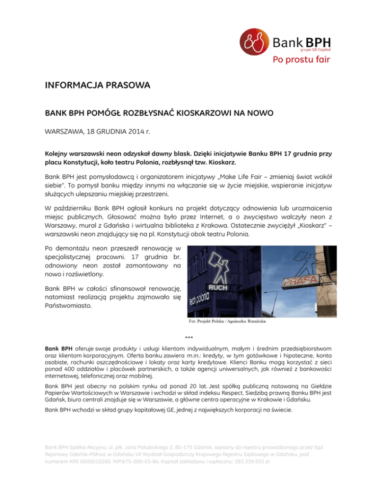 INFORMACJA PRASOWA BANK BPH POMÓGŁ ROZBŁYSNAĆ KIOSKARZOWI NA NOWO WARSZAWA, 18 GRUDNIA 2014 r. Kolejny warszawski neon odzyskał dawny blask. Dzięki inicjatywie Banku BPH 17 grudnia przy placu Konstytucji, koło teatru Polonia, rozbłysnął tzw. Kioskarz. Bank BPH jest pomysłodawcą i organizatorem inicjatywy „Make Life Fair – zmieniaj świat wokół siebie”. To pomysł banku między innymi na włączanie się w życie miejskie, wspieranie inicjatyw służących ulepszaniu miejskiej przestrzeni. W październiku Bank BPH ogłosił konkurs na projekt dotyczący odnowienia lub urozmaicenia miejsc publicznych. Głosować można było przez Internet, a o zwycięstwo walczyły neon z Warszawy, mural z Gdańska i wirtualna biblioteka z Krakowa. Ostatecznie zwyciężył „Kioskarz” – warszawski neon znajdujący się na pl. Konstytucji obok teatru Polonia. Po demontażu neon przeszedł renowację w specjalistycznej pracowni. 17 grudnia br. odnowiony neon został zamontowany na nowo i rozświetlony. Bank BPH w całości sfinansował renowację, natomiast realizacją projektu zajmowało się Państwomiasto. *** Bank BPH oferuje swoje produkty i usługi klientom indywidualnym, małym i średnim przedsiębiorstwom oraz klientom korporacyjnym. Oferta banku zawiera m.in.: kredyty, w tym gotówkowe i hipoteczne, konta osobiste, rachunki oszczędnościowe i lokaty oraz karty kredytowe. Klienci Banku mogą korzystać z sieci ponad 400 oddziałów i placówek partnerskich, a także agencji uniwersalnych, jak również z bankowości internetowej, telefonicznej oraz mobilnej. Bank BPH jest obecny na polskim rynku od ponad 20 lat. Jest spółką publiczną notowaną na Giełdzie Papierów Wartościowych w Warszawie i wchodzi w skład indeksu Respect. Siedzibą prawną Banku BPH jest Gdańsk, biuro centrali znajduje się w Warszawie, a główne centra operacyjne w Krakowie i Gdańsku. Bank BPH wchodzi w skład grupy kapitałowej GE, jednej z największych korporacji na świecie. Bank BPH Spółka Akcyjna, ul. płk. Jana Pałubickiego 2, 80-175 Gdańsk, wpisany do rejestru prowadzonego przez Sąd Rejonowy Gdańsk-Północ w Gdańsku VII Wydział Gospodarczy Krajowego Rejestru Sądowego w Gdańsku, pod numerem KRS 0000010260. NIP:675-000-03-84. Kapitał zakładowy i wpłacony: 383.339.555 zł.