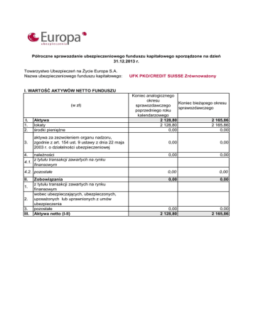Półroczne sprawozdanie ubezpieczeniowego funduszu kapitałowego sporządzone na dzień 31.12.2013 r. Towarzystwo Ubezpieczeń na Życie Europa S.A. Nazwa ubezpieczeniowego funduszu kapitałowego: UFK PKO/CREDIT SUISSE Zrównoważony I. WARTOŚĆ AKTYWÓW NETTO FUNDUSZU (w zł) I. 1. 2. Aktywa lokaty środki pieniężne 3. aktywa za zezwoleniem organu nadzoru, zgodnie z art. 154 ust. 9 ustawy z dnia 22 maja 2003 r. o działalności ubezpieczeniowej Koniec analogicznego okresu Koniec bieżącego okresu sprawozdawczego sprawozdawczego poprzedniego roku kalendarzowego 2 128,80 2 165,86 2 128,80 2 165,86 0,00 0,00 0,00 0,00 4. należności z tytułu transakcji zawartych na rynku 4.1. finansowym 0,00 0,00 4.2. pozostałe 0,00 0,00 II. 0,00 0,00 0,00 2 128,80 0,00 2 165,86 1. 2. 3. III. Zobowiązania z tytułu transakcji zawartych na rynku finansowym wobec ubezpieczających, ubezpieczonych, uposażonych lub uprawnionych z umów ubezpieczenia pozostałe Aktywa netto (I-II) Półroczne sprawozdanie ubezpieczeniowego funduszu kapitałowego sporządzone na dzień 31.12.2013 r. Towarzystwo Ubezpieczeń na Życie Europa S.A. Nazwa ubezpieczeniowego funduszu kapitałowego: UFK PKO/CREDIT SUISSE Zrównoważony II. ZMIANY AKTYWÓW NETTO FUNDUSZU (w zł) A. Aktywa netto funduszu na początek okresu sprawozdawczego B. Stan netto z działalności operacyjnej (I-II) I. 1. 2. 3. II. 1. 2. 3. 4. 5. 6. 7. Zwiększenia funduszu tytułem składek zwiększających wartość funduszu pozostałe przychody pozostałe zwiększenia Zmniejszenia funduszu tytułem wykupu tytułem wypłat pozostałych świadczeń ubezpieczeniowych tytułem opłaty za ryzyko ubezpieczeniowe oraz innych opłat potrącanych z fuduszu tytułem zwrotu składek ubezpieczeniowych tytułem opłat za zarządzanie funduszem oraz innych opłat tytułem administrowania funduszem pozostałe koszty Analogiczny okres sprawozdawczy poprzedniego roku kalendarzowego Bieżący okres sprawozdawczy 1 884,80 2 128,80 -48,11 0,00 -50,49 0,00 0,00 0,00 48,11 0,00 50,49 0,00 0,00 0,00 48,11 50,49 292,10 87,55 2 128,80 2 165,86 pozostałe zmniejszenia C. Wynik netto z działalności inwestycyjnej D. Aktywa netto funduszu na koniec okresu sprawozdawczego Półroczne sprawozdanie ubezpieczeniowego funduszu kapitałowego sporządzone na dzień 31.12.2013 r. Towarzystwo Ubezpieczeń na Życie Europa S.A. Nazwa ubezpieczeniowego funduszu kapitałowego: III I. 1. 2. II. 1. 2. 3. 4. UFK PKO/CREDIT SUISSE Zrównoważ LICZBA I WARTOŚĆ JEDNOSTEK ROZRACHUNKOWYCH Analogiczny okres sprawozdawczy (w zł) poprzedniego roku kalendarzowego Liczba jednostek rozrachunkowych: 18,1773 na początek okresu sprawozdawczego 17,7459 na koniec okresu sprawozdawczego Wartość jednostki rozrachunkowej (w zł): 103,69 na początek okresu sprawozdawczego minimalna wartość jednostki rozrachunkowej w 103,30 okresie sprawozdawczym maksymalna wartość jednostki rozrachunkowej w 120,14 okresie sprawozdawczym 119,96 na koniec okresu sprawozdawczego Bieżący okres sprawozdawczy 17,7459 17,3255 119,96 114,30 128,13 125,01 Półroczne sprawozdanie ubezpieczeniowego funduszu kapitałowego sporządzone na dzień 31.12.2013 r. Towarzystwo Ubezpieczeń na Życie Europa S.A. Nazwa ubezpieczeniowego funduszu kapitałowego: IV ZESTAWIENIE AKTYWÓW NETTO FUNDUSZU (w zł) I. 1. 2. 3. 4. 5. 6. 7. 8. 9. 10. 11. 12. II. III. IV V. VI. 1. 2. 3. UFK PKO/CREDIT SUISSE Zrównoważony Lokaty (suma 1-12) papiery wartościowe emitowane, poręczone lub gwarantowane przez Skarb Państwa lub organizacje międzynarodowe, których członkiem jest Rzeczpospolita Polska obligacje emitowane lub poręczone przez jednostki samorządu terytorialnego lub związki jednostek samorządu terytorialnego Udział w aktywach netto funduszu (w %) 2 165,86 100,00% Wartość bilansowa (w zł) 0,00 0,00% 0,00% Inne dłużne papiery wartościowe o stałej stopie dochodu 0,00 0,00% akcje udziały jednostki uczestnictwa lub certyfikaty inwestycyjne w funduszach inwestycyjnych instrumenty pochodne, o ile służą zmniejszeniu ryzyka związanego z innymi aktywami stanowiącymi pokrycie rezerw techniczno-ubezpieczeniowych inne papiery wartościowe o zmiennej stopie dochodu pożyczki nieruchomości depozyty bankowe pozostałe lokaty Aktywa za zezwoleniem organu nadzoru, zgodnie z art.. 154 ust.9 ustawy z dnia 22 maja 2003 r. o działalności ubezpieczeniowej Środki pieniężne Należności Zobowiązania Aktywa netto (w tym) krajowe zagraniczne - kraje UE zagraniczne - kraje poza UE 0,00 0,00% 0,00% 2 165,86 100,00% 0,00 0,00% 0,00 0,00 0,00% 0,00% 0,00% 0,00% 0,00% 0,00 0,00 0,00 0,00 2 165,86 2 165,86 0,00 0,00 0,00% 0,00% 0,00% 0,00% 100,00% 100,00% 0,00% 0,00% 0,00