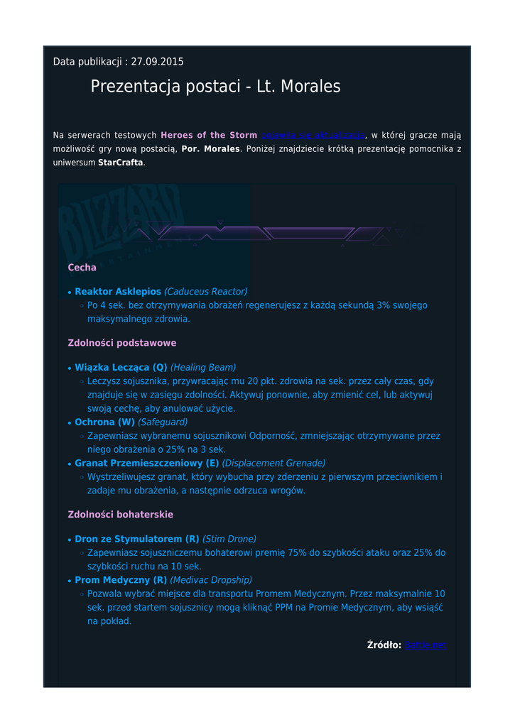Data publikacji : 27.09.2015 Prezentacja postaci - Lt. Morales Na serwerach testowych Heroes of the Storm pojawiła się aktualizacja, w której gracze mają możliwość gry nową postacią, Por. Morales. Poniżej znajdziecie krótką prezentację pomocnika z uniwersum StarCrafta. Cecha ● Reaktor Asklepios (Caduceus Reactor) Po 4 sek. bez otrzymywania obrażeń regenerujesz z każdą sekundą 3% swojego maksymalnego zdrowia. ❍ Zdolności podstawowe ● Wiązka Lecząca (Q) (Healing Beam) Leczysz sojusznika, przywracając mu 20 pkt. zdrowia na sek. przez cały czas, gdy znajduje się w zasięgu zdolności. Aktywuj ponownie, aby zmienić cel, lub aktywuj swoją cechę, aby anulować użycie. Ochrona (W) (Safeguard) Zapewniasz wybranemu sojusznikowi Odporność, zmniejszając otrzymywane przez niego obrażenia o 25% na 3 sek. Granat Przemieszczeniowy (E) (Displacement Grenade) Wystrzeliwujesz granat, który wybucha przy zderzeniu z pierwszym przeciwnikiem i zadaje mu obrażenia, a następnie odrzuca wrogów. ❍ ● ❍ ● ❍ Zdolności bohaterskie ● Dron ze Stymulatorem (R) (Stim Drone) Zapewniasz sojuszniczemu bohaterowi premię 75% do szybkości ataku oraz 25% do szybkości ruchu na 10 sek. Prom Medyczny (R) (Medivac Dropship) Pozwala wybrać miejsce dla transportu Promem Medycznym. Przez maksymalnie 10 sek. przed startem sojusznicy mogą kliknąć PPM na Promie Medycznym, aby wsiąść na pokład. ❍ ● ❍ Źródło: Battle.net Autor: Sigmar Liczba wyświetleń strony: 1123 Data publikacji : 27.09.2015 Tagi: zapowiedź, Por. Morales, Lt. Morales Komentarz (1) dodaj komentarz Cała medyczka to buff Illidana :D Dobry patch też w drodze.~VeR 2015/09/27 15:05 dodaj komentarz Pozostałe nowości DreamHack Open: Valencia 2016 - Nerchio w półfinale - live! DreamHack Valencia to jedno z największych e-sportowych wydarzeń w Europie - dlatego nie mogło zabraknąć na nim StarCrafta II! W czasie rozgrywek 96 graczy będzie konkurować o 50 000 USD oraz 5 000 punktów WCS.Data publikacji: 16.07.20161 Aktualizacja 3.4 – Duże zmiany w rankingu StarCrafta II Na oficjalnym blogu Blizzarda pojawił się nowy wpis dotyczący tym razem zmian w rankingach: Ranking StarCrafta II jest areną dla niezwykle zaciętej rywalizacji. Do walki rusza wielu uczestników, ale tylko nieliczni awansują do ścisłej czołówki.Data publikacji: 03.07.20160 Rozpoczęcie trzeciego sezonu rankingowego 2016 Trzeci sezon tegorocznych rozgrywek ligowych w StarCrafta II uważamy za otwarty! Zresetowano pulę punktów premiowych oraz rankingi i przyznano nagrody za sezon drugi roku 2016.Data publikacji: 26.06.20160 Filmowy „Warcraft” już wkrótce w księgarniach! Powieść „Warcraft”, której wydanie zbiega się z polską premierą filmu „Warcraft. Początek” w reżyserii Duncana Jonesa, do księgarń trafi już 15 czerwca. Na kartach książki czytelnicy wkroczą w nowy wymiar emocji towarzyszących bohaterom fikcyjnych światów Azeroth i Draenor. Za sprawą Christie Golden, pisarki od lat cenionej przez fanów świata Warcraft, konflikt ludzi i orków nabierze jeszcze większej intensywności.Data publikacji: 13.06.20160 Blokada obecnego sezonu i darmowa zmiana nazwy postaci Jak czytamy na oficjalnym blogu Blizzarda: Obecny sezon rankingowy zbliża się ku końcowi i wkrótce zamknięte zostaną wszystkie ligi i dywizje. Kilka dni przed rozpoczęciem nowego sezonu, darmowa zmiana nazwy postaci w StarCraft II zostanie ponownie dodana do wszystkich kont, dla których funkcja ta nie jest obecnie dostępna.Data publikacji: 12.06.20160 Wszystkie nowości