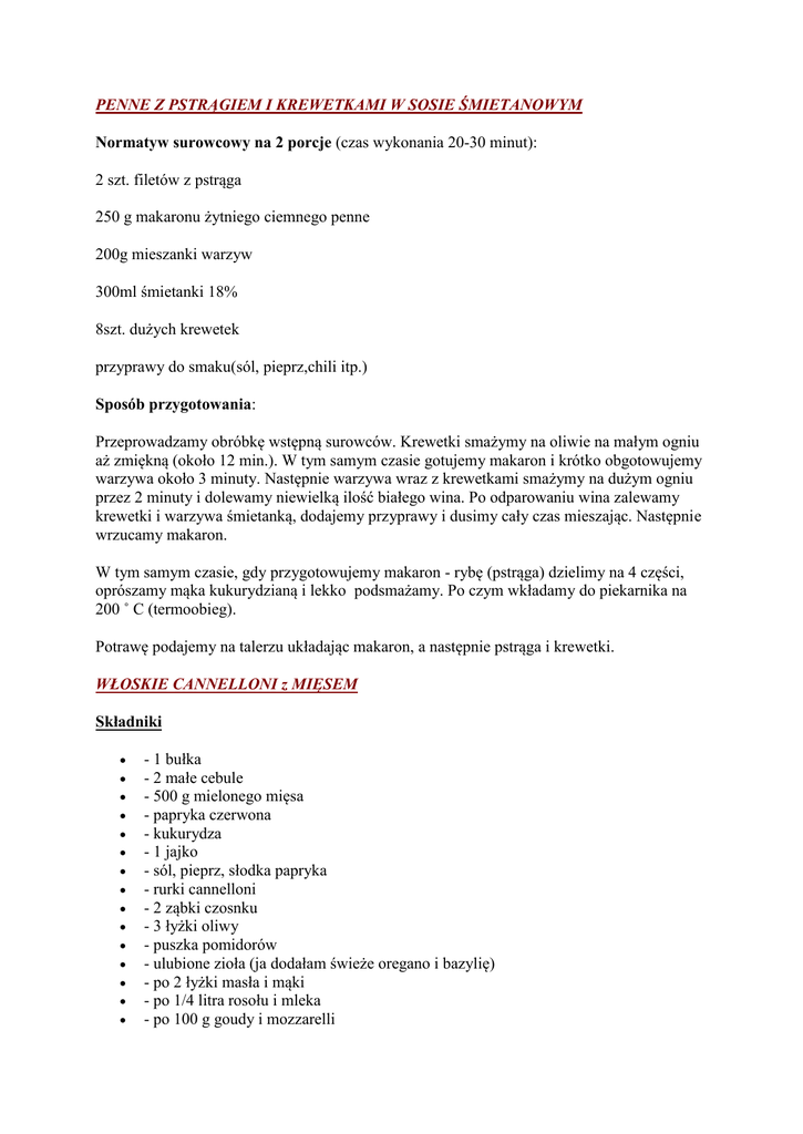 PENNE Z PSTRĄGIEM I KREWETKAMI W SOSIE ŚMIETANOWYM Normatyw surowcowy na 2 porcje (czas wykonania 20-30 minut): 2 szt. filetów z pstrąga 250 g makaronu żytniego ciemnego penne 200g mieszanki warzyw 300ml śmietanki 18% 8szt. dużych krewetek przyprawy do smaku(sól, pieprz,chili itp.) Sposób przygotowania: Przeprowadzamy obróbkę wstępną surowców. Krewetki smażymy na oliwie na małym ogniu aż zmiękną (około 12 min.). W tym samym czasie gotujemy makaron i krótko obgotowujemy warzywa około 3 minuty. Następnie warzywa wraz z krewetkami smażymy na dużym ogniu przez 2 minuty i dolewamy niewielką ilość białego wina. Po odparowaniu wina zalewamy krewetki i warzywa śmietanką, dodajemy przyprawy i dusimy cały czas mieszając. Następnie wrzucamy makaron. W tym samym czasie, gdy przygotowujemy makaron - rybę (pstrąga) dzielimy na 4 części, oprószamy mąka kukurydzianą i lekko podsmażamy. Po czym wkładamy do piekarnika na 200 ˚ C (termoobieg). Potrawę podajemy na talerzu układając makaron, a następnie pstrąga i krewetki. WŁOSKIE CANNELLONI z MIĘSEM Składniki - 1 bułka - 2 małe cebule - 500 g mielonego mięsa - papryka czerwona - kukurydza - 1 jajko - sól, pieprz, słodka papryka - rurki cannelloni - 2 ząbki czosnku - 3 łyżki oliwy - puszka pomidorów - ulubione zioła (ja dodałam świeże oregano i bazylię) - po 2 łyżki masła i mąki - po 1/4 litra rosołu i mleka - po 100 g goudy i mozzarelli Sposób przygotowania 1. Bułkę namoczyć w zimnej wodzie, a po namoczeniu i odciśnięciu przełożyć do mięsa. Dodać jajko, posiekaną 1 cebulę. Przyprawić słodką papryką, solą i pieprzem. Dodać pokrojoną w drobną kostkę paprykę i kukurydzę. Całość wymieszać. Przygotowaną masą wypełnić rurki cannelloni. 2. Drugą cebulkę i czosnek posiekać i zeszklić na oliwie. Dodać pomidory z zalewą, sól, pieprz i ulubione świeże zioła. Gotować ok.10min. Sos pomidorowy i wypełnione cannelloni przełożyć do formy. 3. Masło rozgrzać, posypać mąką, zasmażyć. Wlać przygotowany rosół i mleko, gotować ok.5min cały czas mieszając. Sos przyprawić solą i pieprzem i polać cannelloni. Posypać startą goudą, obłożyć plasterkami mozzarelli. Piec w temp.200st ok.45minut.