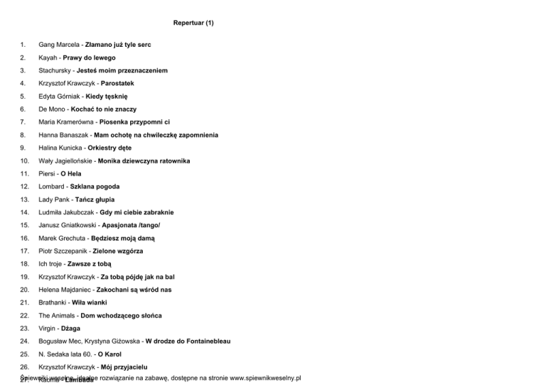 Repertuar (1) 1. Gang Marcela - Złamano już tyle serc 2. Kayah - Prawy do lewego 3. Stachursky - Jesteś moim przeznaczeniem 4. Krzysztof Krawczyk - Parostatek 5. Edyta Górniak - Kiedy tęsknię 6. De Mono - Kochać to nie znaczy 7. Maria Kramerówna - Piosenka przypomni ci 8. Hanna Banaszak - Mam ochotę na chwileczkę zapomnienia 9. Halina Kunicka - Orkiestry dęte 10. Wały Jagiellońskie - Monika dziewczyna ratownika 11. Piersi - O Hela 12. Lombard - Szklana pogoda 13. Lady Pank - Tańcz głupia 14. Ludmiła Jakubczak - Gdy mi ciebie zabraknie 15. Janusz Gniatkowski - Apasjonata /tango/ 16. Marek Grechuta - Będziesz moją damą 17. Piotr Szczepanik - Zielone wzgórza 18. Ich troje - Zawsze z tobą 19. Krzysztof Krawczyk - Za tobą pójdę jak na bal 20. Helena Majdaniec - Zakochani są wśród nas 21. Brathanki - Wiła wianki 22. The Animals - Dom wchodzącego słońca 23. Virgin - Dżaga 24. Bogusław Mec, Krystyna Giżowska - W drodze do Fontainebleau 25. N. Sedaka lata 60. - O Karol 26. Krzysztof Krawczyk - Mój przyjacielu Śpiewniki weselne, idealne rozwiązanie na zabawę, dostępne na stronie www.spiewnikweselny.pl 27. Kaoma - Lambada Repertuar (2) 39. Ryszard Rynkowski - Jedzie pociąg 40. Big Cyc - Facet to świnia 41. Acapulco 42. Bolter - Daj mi tę noc 43. Ivan i Delfin - Jej czarne oczy Śpiewniki weselne, idealne rozwiązanie na zabawę, dostępne na stronie www.spiewnikweselny.pl