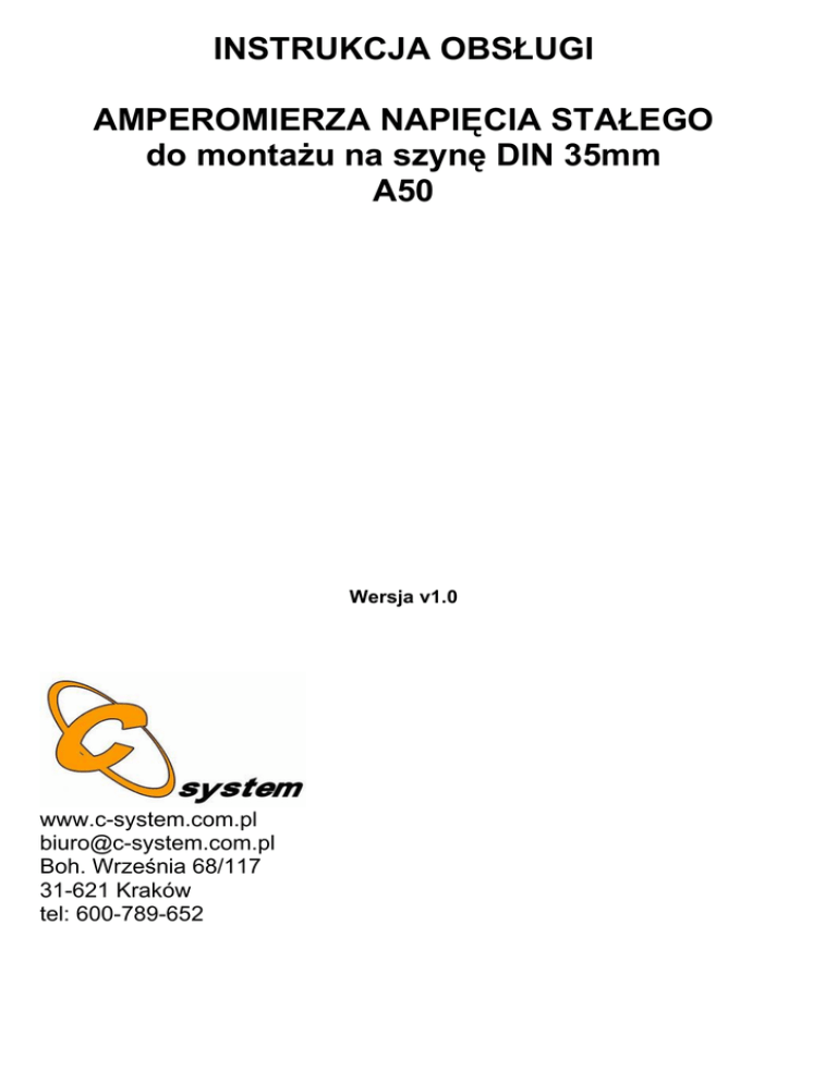 INSTRUKCJA OBSŁUGI AMPEROMIERZA NAPIĘCIA STAŁEGO do montaŜu na szynę DIN 35mm A50 Wersja v1.0 www.c-system.com.pl [email protected] Boh. Września 68/117 31-621 Kraków tel: 600-789-652 Amperomierz A50 Strona 1 1. Informacje ogólne. W instrukcji obsługi zawarto istotne informacje dotyczące prawidłowego instalowania i eksploatacji. Przed podjęciem czynności związanych z instalowaniem, uruchomieniem i uŜytkowaniem naleŜy dokładnie przeczytać niniejszą instrukcję obsługi. Instrukcję naleŜy zachować do przyszłego wglądu. 2. Uwagi i ostrzeŜenia dotyczące bezpieczeństwa. W celu zapewnienia bezpieczeństwa podczas montaŜu i eksploatacji naleŜy: stosować urządzenie zgodnie z przeznaczeniem, uruchamiać układ tylko w warunkach o których mowa w instrukcji obsługi, nie stosować urządzenia w pomieszczeniu od duŜej wilgotności i zapyleniu, nie naraŜać urządzenia na działanie wysokich temperatur, przed przystąpieniem do wykonywania jakichkolwiek prac przy urządzeniu naleŜy odłączyć napięcie zasilającą, nie stosować w strefach zagroŜenia wybuchem lub poŜarem. Po zaobserwowaniu jakichkolwiek oznak nieprawidłowości w pracy urządzania zaprzestać uŜytkowania i natychmiast powiadomić producenta wyrobu. KaŜde uŜycie niezgodne z niniejszą instrukcją obsługi stanowi niedozwolone uŜycie i zwalnia producenta z odpowiedzialności cywilnej. Czyszczenie naleŜy przeprowadzać jedynie suchą szmatką po wyłączeniu napięcia. Zabronione jest uŜywanie środków czyszczących i rozpuszczalników. Nie wolno dopuścić do zmoczenia Ŝadnych części elektrycznych. 3. Dane techniczne. Napięcie zasilania Pobór prądu Zakres pomiaru prądu Rozdzielczość pomiarów Dokładność pomiaru Częstotliwość odświeŜania Wymiary Temperatura pracy Wilgotność pracy 6V - 100V DC 0,03 A max. 0A – 50A DC 0,1A +/- 3% 0,5s Wys. 65 mm Szer. 89 mm Dł. 70 mm 4 moduły DIN 0°C - 40°C 80% max. bez zjawiska kondesacji 4. Przeznaczenie. Amperomierz montowany na standardową szynę DIN 35mm przeznaczony jest do pomiaru prądu stałego. Zasilany jest bezpośrednio ze źródła mierzonego lub z zewnętrznego zasilacza odseparowanego galwanicznie. 5. Sposób podłączenia i montaŜu. Amperomierz zamontować na szynie DIN 35mm lub przykręcić dwoma wkrętami. W tym celu wykręcić dwa oryginalne wkręty i zastosować dłuŜsze w zaleŜności od potrzeb. Amperomierz naleŜy zamknąć w skrzynce elektrycznej, aby podczas normalnej pracy zaciski nie były dostępne dla obsługi. Miejsce montaŜu powinno być suche i przewietrzane. Połączenia wykonać według jednego ze schematów poniŜej zwracając uwagę na poprawną polaryzacje. Rysunek 1 przedstawia schemat połączeń gdzie amperomierz jest zasilany bezpośrednio ze źródła. Natomiast połączenie według Rysunku 2 przedstawia schemat połączeń gdzie amperomierz jest zasilany z zewnętrznego zasilacza. Uwaga! zasilacz musi być odseparowany galwanicznie od źródła. Inne podłączenie niŜ przedstawione w instrukcji obsługi moŜe spowodować uszkodzenie amperomierza. Instalować tylko przy wyłączonym napięciu. Nie przekraczać maksymalnego zakresu pomiarowego i zasilania podanego w danych technicznych. Amperomierz A50 Strona 2 6. Utylizacja zuŜytego sprzętu. Symbol przekreślonego kosza umieszczony na produkcie lub na jego opakowaniu wskazuje na selektywną zbiórkę zuŜytego sprzętu elektrycznego i elektronicznego. Oznacza to, Ŝe produkt ten nie moŜe być wyrzucany razem z innymi odpadami domowymi. Jako końcowy uŜytkownik jesteś zobowiązany przez prawo do zwrotu zuŜytego sprzętu elektronicznego. Utylizacja wraz z odpadami domowymi jest zabroniona! 7. Karta gwarancyjna. C-system udziela gwarancji na sprawne działanie urządzenia na okres 12 miesięcy od daty zakupu. Warunki gwarancji: Nabywca dostarcza wyrób do serwisu: za pośrednictwem punktu sprzedaŜy, osobiście lub za pośrednictwem spedytora (np. poczty polskiej) na własny koszt. Zwrot naprawionego wyrobu realizowany jest na koszt gwaranta. Warunkami przyjęcia do serwisu towaru są: prawidłowo wypełniona karta gwarancyjna (data sprzedaŜy, pieczątka), wypełniony kupon reklamacyjny (dokładny opis usterki, nr telefonu, adres), nienaruszone plomby gwarancyjne. Terminy napraw serwisowych: C-system zobowiązuje się do naprawy wyrobu do 14 dni roboczych liczonych od daty przyjęcia towaru do serwisu. W przypadku naprawy o szczególnym stopniu trudności, termin naprawy ulega przedłuŜeniu do 30 dni roboczych. Utrata gwarancji następuje w przypadku stwierdzenia: zerwania lub uszkodzenia plomb gwarancyjnych, przedstawienia niewypełnionej karty gwarancyjnej, samowolnych napraw przeprowadzanych przez osoby nieuprawnione, uszkodzenia numerów seryjnych, uszkodzeń mechanicznych, chemicznych, termicznych, celowe uszkodzenia wyrobu, uszkodzeń wynikłych na skutek niewłaściwego lub niezgodnego z instrukcją obsługi, instalacji, przechowywania czy konserwacji produktu. Postanowienia końcowe: Koszt napraw nie objętych gwarancją, a takŜe koszty sprawdzenia sprawnego sprzętu obciąŜają Nabywcę. Nabywca jest zobowiązany przy odbiorze wyrobu sprawdzić czy otrzymał kartę gwarancyjną i czy na urządzaniu zostały umieszczone plomby gwarancyjne. Gwarancja nie wyłącza, nie ogranicza ani nie zawiesza uprawnień nabywcy wynikających z niezgodności towaru z umową. Amperomierz A50 Strona 3 A50 Data sprzedaŜy …… - ……. - ……….. (dzień - miesiąc - rok) …………………………………………… podpis i pieczątka punktu sprzedaŜy Kupon reklamacyjny Data zgłoszenia usterki………………………………… Dokładny opis usterki: ………………………………….…………………………………………………………………………….. ………………………………………………………………………………………………………………… ……………