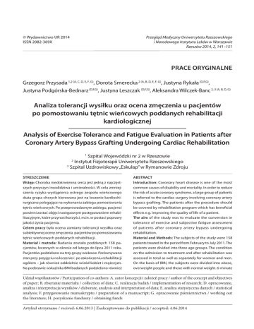 Przysada, Smerecka, Rykała, Podgórska-Bednarz, Leszczak, Wilczek Banc Analiza tolerancji wysiłku oraz ocena zmęczenia u pacjentów… 141 Przegląd Medyczny Uniwersytetu Rzeszowskiego i Narodowego Instytutu Leków w Warszawie Rzeszów 2014, 2, 141–151 © Wydawnictwo UR 2014 ISSN 2082-369X Prace oryginalne Grzegorz Przysada 1,2 (A, C, D, E, F, G), Dorota Smerecka 2 (A, B, D, E, F, G), Justyna Rykała (D,F,G), Justyna Podgórska-Bednarz (D,F,G), Justyna Leszczak (D,F,G), Aleksandra Wilczek-Banc 2, 3 (A, B, D, G) Analiza tolerancji wysiłku oraz ocena zmęczenia u pacjentów po pomostowaniu tętnic wieńcowych poddanych rehabilitacji kardiologicznej Analysis of Exercise Tolerance and Fatigue Evaluation in Patients after Coronary Artery Bypass Grafting Undergoing Cardiac Rehabilitation Szpital Wojewódzki nr 2 w Rzeszowie Instytut Fizjoterapii Uniwersytetu Rzeszowskiego 3 Szpital Uzdrowiskowy „Eskulap” w Rymanowie Zdroju 1 2 Streszczenie Wstęp: Choroba niedokrwienna serca jest jedną z najczęstszych przyczyn inwalidztwa i umieralności. W celu zmniejszenia ryzyka wystąpienia ostrego zespołu wieńcowego duża grupa chorych kierowana jest na leczenie kardiochirurgiczne polegające na wykonaniu zabiegu pomostowania tętnic wieńcowych. Po przeprowadzonym zabiegu, pacjenci powinni zostać objęci następowym postępowaniem rehabilitacyjnym, które przynosi korzyści, m.in. w postaci poprawy jakości życia pacjenta. Celem pracy była ocena zamiany tolerancji wysiłku oraz subiektywnej oceny zmęczenia pacjentów po pomostowaniu tętnic wieńcowych poddanych rehabilitacji. Materiał i metoda: Badaniu zostało poddanych 158 pacjentów, leczonych w okresie od lutego do lipca 2011 roku. Pacjentów podzielono na trzy grupy wiekowe. Porównywano stan przy przyjęciu na leczenie i po zakończeniu rehabilitacji ogółem – jak również oddzielnie wśród kobiet i mężczyzn. Na podstawie wskaźnika BMI badanych podzielono również Abstract Introduction: Coronary heart disease is one of the most common causes of disability and mortality. In order to reduce the risk of acute coronary syndrome, a large group of patients is referred to the cardiac surgery involving coronary artery bypass grafting. The patients after the procedure should be covered by rehabilitation program which has beneficial effects e.g. improving the quality of life of a patient. The aim of the study was to evaluate the conversion in tolerance of exercise and subjective fatigue assessment of patients after coronary artery bypass undergoing rehabilitation. Material and Methods: The subjects of the study were 158 patients treated in the period from February to July 2011. The patients were divided into three age groups. The condition on the admission to treatment and after rehabilitation was assessed in total as well as separately for women and men. On the basis of BMI, the subjects were divided into obese, overweight people and those with normal weight. 6-minute Udział współautorów / Participation of co-authors: A. autor koncepcji i założeń pracy / author of the concept and objectives of paper; B. zbieranie materiału / collection of data; C. realizacja badań / implementation of research; D. opracowanie, analiza i interpretacja wyników / elaborate, analysis and interpretation of data; E. analiza statystyczna danych / statistical analysis; F. przygotowanie manuskryptu / preparation of a manuscript; G. opracowanie piśmiennictwa / working out the literature; H. pozyskanie funduszy / obtaining funds Artykuł otrzymano / recived: 6.06.2013 | Zaakceptowano do publikacji / accepted: 4.06.2014 142 na osoby otyłe, osoby z nadwagą oraz osoby o prawidłowej masie ciała. Do określenia tolerancji zmęczenia zastosowano Test Marszu 6-minutowego, natomiast do subiektywnej oceny zmęczenia – skalę Borga. Wyniki: Analiza wyników badań wskazała, że badani pacjenci uzyskali poprawę wyników w zakresie tolerancji wysiłku oraz subiektywnej oceny zmęczenia po zakończonej rehabilitacji. Poprawę wyników zaobserwowano we wszystkich analizowanych grupach wiekowych. Nie odnotowano znaczących różnic w uzyskanych wynikach w przypadku podziału pacjentów ze względu na płeć oraz wskaźnik BMI. Wnioski: 1. W wyniku przeprowadzonej rehabilitacji kardiologicznej uzyskano istotną statystycznie poprawę tolerancji wysiłku, wyrażoną w przyroście dystansu w teście 6MWT oraz zmniejszeniem średniej liczby punktów w skali Borga. 2. Wiek, płeć oraz wskaźnik BMI nie są czynnikami wpływającymi istotnie na zmianę tolerancji wysiłku, jak również subiektywną ocenę zmęczenia pacjentów. Słowa kluczowe: pomostowanie aortalno-wieńcowe, skala Borga, test marszu 6-minutowego, rehabilitacja kardiologiczna Wstęp Obecnie zauważalny jest znaczny wzrost zapadalności na choroby cywilizacyjne. Dzieje się tak na skutek zmian cywilizacyjnych, które pociągają za sobą niekorzystne dla ustroju człowieka modyfikacje stylu życia. Wśród chorób cywilizacyjnych największe znaczenie mają choroby układu krążenia, głównie: choroba wieńcowa, zawał mięśnia sercowego oraz nadciśnienie tętnicze. W Polsce na chorobę wieńcową cierpi od 1,2 do 1,5 miliona osób. Według polskich danych opublikowanych w Ogólnopolskim Rejestrze Ostrych Zespołów Wieńcowych (PL-ACS) rocznie w polskich szpitalach są rejestrowane 284 382 przypadki OZW. Zwiększona zapadalność na choroby serca, a co z tym związane – zwiększona potrzeba skutecznego leczenia doprowadziła do znacznego rozwoju kardiochirurgii. W Polsce rocznie wykonuje się około 22 tysięcy zabiegów kardiochirurgicznych, z czego połowę stanowią zabiegi pomostowania aortalno-wieńcowego (CABG – Coronary Artery Bypass Graft). Zabieg ten jest bardzo rozległy i obciążający dla pacjenta, ponieważ wiąże się on z przecięciem mostka i stosowaniem krążenia pozaustrojowego, co zwiększa ryzyko wystąpienia powikłań pooperacyjnych [1–3]. Obecnie istniej