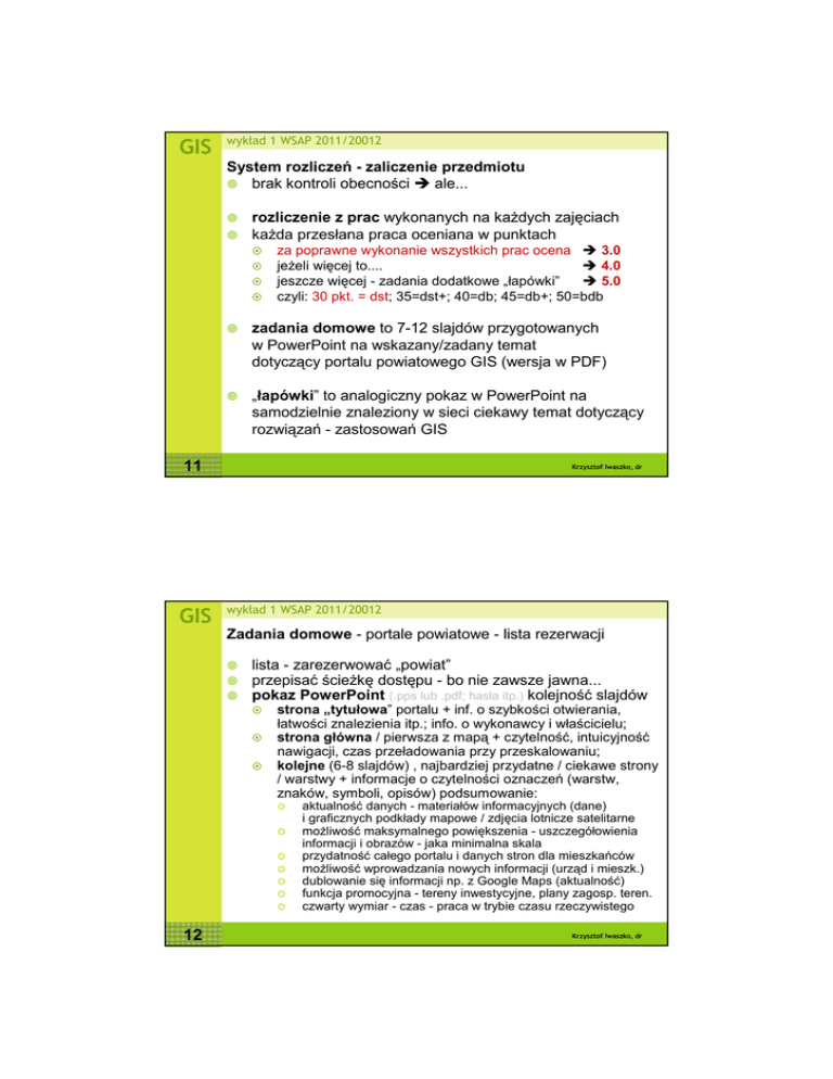 GIS wykład 1 WSAP 2011/20012 System rozliczeń - zaliczenie przedmiotu brak kontroli obecności ale... rozliczenie z prac wykonanych na każdych zajęciach każda przesłana praca oceniana w punktach za poprawne wykonanie wszystkich prac ocena 3.0 jeżeli więcej to.... 4.0 jeszcze więcej - zadania dodatkowe „łapówki” 5.0 czyli: 30 pkt. = dst; 35=dst+; 40=db; 45=db+; 50=bdb zadania domowe to 7-12 slajdów przygotowanych w PowerPoint na wskazany/zadany temat dotyczący portalu powiatowego GIS (wersja w PDF) „łapówki” to analogiczny pokaz w PowerPoint na samodzielnie znaleziony w sieci ciekawy temat dotyczący rozwiązań - zastosowań GIS 11 GIS Krzysztof Iwaszko, dr wykład 1 WSAP 2011/20012 Zadania domowe - portale powiatowe - lista rezerwacji lista - zarezerwować „powiat” przepisać ścieżkę dostępu - bo nie zawsze jawna... pokaz PowerPoint (.pps lub .pdf; hasła itp.) kolejność slajdów strona „tytułowa” portalu + inf. o szybkości otwierania, łatwości znalezienia itp.; info. o wykonawcy i właścicielu; strona główna / pierwsza z mapą + czytelność, intuicyjność nawigacji, czas przeładowania przy przeskalowaniu; kolejne (6-8 slajdów) , najbardziej przydatne / ciekawe strony / warstwy + informacje o czytelności oznaczeń (warstw, znaków, symboli, opisów) podsumowanie: aktualność danych - materiałów informacyjnych (dane) i graficznych podkłady mapowe / zdjęcia lotnicze satelitarne możliwość maksymalnego powiększenia - uszczegółowienia informacji i obrazów - jaka minimalna skala przydatność całego portalu i danych stron dla mieszkańców możliwość wprowadzania nowych informacji (urząd i mieszk.) dublowanie się informacji np. z Google Maps (aktualność) funkcja promocyjna - tereny inwestycyjne, plany zagosp. teren. czwarty wymiar - czas - praca w trybie czasu rzeczywistego 12 Krzysztof Iwaszko, dr GIS wykład 1 WSAP 2011/20012 13 GIS Krzysztof Iwaszko, dr wykład 1 WSAP 2011/20012 kontakt - wymiana informacji - zaliczanie itp. pobieranie danych na zajęcia gotowe prace WSAP K Iwaszko [email protected] schemat nazw przesyłanych zbiorów - plików PDF z (lub d) typ studiów - tu zaoczne 1 (lub kolejne cyfry do 7) numer zajęć - dziś 1 01 (2-cyfrowa liczba) numer osoby na liście studentów kowalski - nazwisko bez znaków diakrytycznych . (kropka) pdf (typ pliku Adobe) bez szyfrowania i hasła! czyli np: z101kowalski.pdf indywidualne konto na Google Mail (bo ostatnie zajęcia) nazwa wg schematu [email protected] gdzie zaoczni 01 numer nazwisko ew. przekierowanie na konto uczelniane WSAP 15 Krzysztof Iwaszko, dr