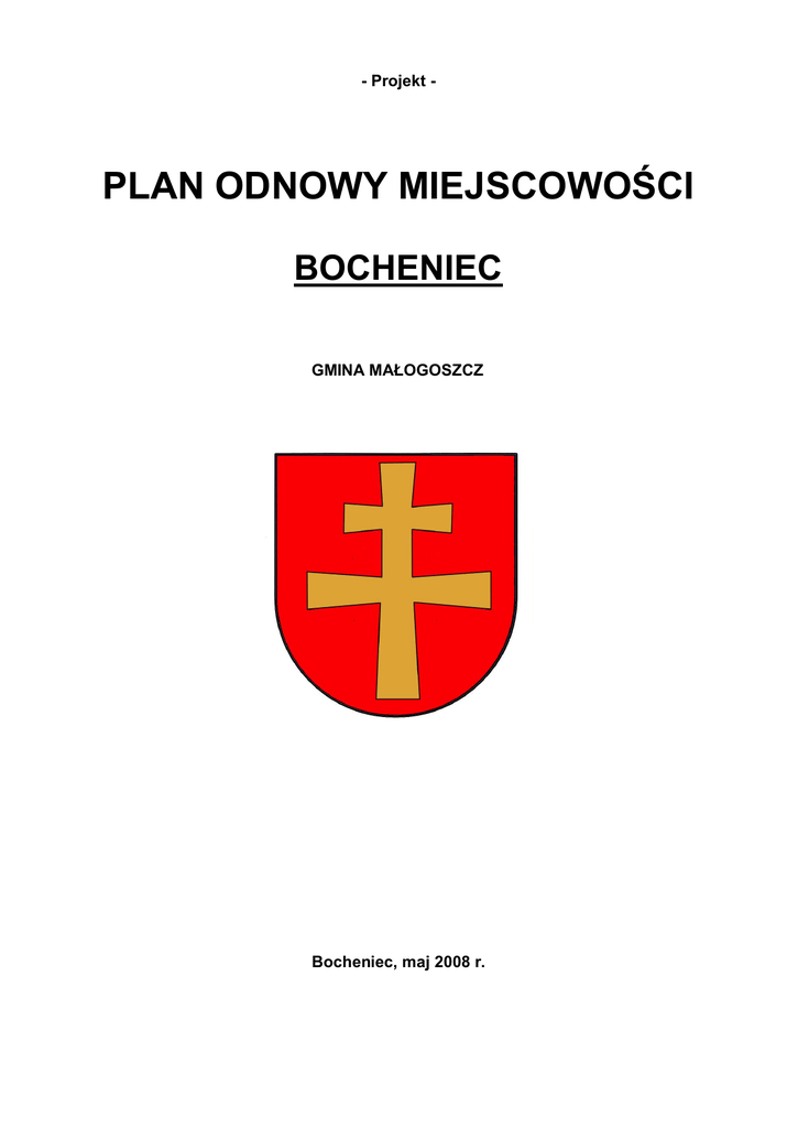 - Projekt - PLAN ODNOWY MIEJSCOWO CI BOCHENIEC GMINA MA OGOSZCZ Bocheniec, maj 2008 r. Plan Odnowy Miejscowo ci Bocheniec zosta przygotowany przez pracowników Urz du Miasta i Gminy w Ma ogoszczu: Justyna G ogowska – podinspektor ds. pozyskiwania rodków pomocowych Przemys aw Spurek – podinspektor ds. promocji i rozwoju gminy przy wspó pracy z: Rad So eck miejscowo ci Bocheniec w sk adzie: Marian Dudek - so tys Dudek Janina Korpus Ewa 2 SPIS TRE CI 1. WPROWADZENIE ...............................................................................................................4 2. AKTUALNA SYTUACJA SPO ECZNO-GOSPODARCZA NA OBSZARZE MIEJSCOWO CI ......................................................................................5 2.1. PODSTAWOWE INFORMACJE NA TEMAT SO ECTWA ..................................5 2.2. HISTORIA MIEJSCOWO CI I DZIEDZICTWO KULTUROWE ............................6 2.2.1. ZESTAWIENIE WARTO CI KULTUROWYCH MIEJSCOWO CI BOCHENIEC ...........................................................................................6 2.3. INWENTARYZACJA ZASOBÓW S CYCH UJ CIU STANU RZECZYWISTEGO ..............................................................................................7 2.3.1. RODOWISKO PRZYRODNICZE I ZASOBY NATURALNE ................7 2.3.2. GOSPODARKA ....................................................................................13 2.3.3. ROLNICTWO ........................................................................................13 2.3.4. KULTURA, SPORT I TURYSTYKA ......................................................13 2.3.5. O WIATA I WYCHOWANIE .................................................................15 2.3.6. OCHRONA ZDROWIA .........................................................................16 2.3.7. STRUKTURA DEMOGRAFICZNA I BEZROBOCIE .............................16 2.3.8. KOMUNIKACJA ....................................................................................23 2.3.9. INFRASTRUKTURA TECHNICZNA .....................................................24 3. ANALIZA SWOT DLA MIEJSCOWO CI ...........................................................................27 3.1. MOCNE I S ABE STRONY ................................................................................27 3.2. SZANSE I ZAGRO ENIA.....................................................................................28 4. PLANOWANE KIERUNKI ROZWOJU ...............................................................................29 5. OPIS PLANOWANYCH DZIA 6. REALIZACJA ZADA .....................................................................................30 WYTYPOWANYCH DO WSPÓ FINANSOWANIA Z DZIA ANIA OSI 3.4 „ODNOWA I ROZWÓJ WSI” ..........................................................33 7. SYSTEM WDRA ANIA PLANU ODNOWY MIEJSCOWO CI .........................................37 8. SPOSOBY MONITOROWANIA, OCENY, AKTUALIZACJI I KOMUNIKACJI SPO ECZNEJ .................................................................................................................38 8.1. SYSTEM MONITOROWANIA, OCENY I AKTUALIZACJI PLANU ODNOWY MIEJSCOWO CI ................................................................................................38 8.2. PUBLIC RELATIONS PLANU ODNOWY MIEJSCOWO CI ..............................38 RÓD A ..........................................................................................................................39 3 1. WPROWADZENIE Plan Odnowy Miejscowo ci (POM) Bocheniec jest dokumentem okre laj cym strategie dzia wsi w sferze spo eczno – gospodarczej w perspektywie lat 2008-2015. Bezpo rednim powodem stworzenia POM-u Bocheniec jest mo liwo ubiegania si o fundusze unijne na rzecz rozwoju miejscowo ci w oparciu o Program Rozwoju Obszarów Wiejskich (PROW) na lata 2007-2013, 3 programu dotycz dzia ania 4 Odnowa i rozwój wsi, gdzie Plan Odnowy Miejscowo ci jest dokumentem wymaganym. POM jest wynikiem oddolnej inicjatywy mieszka ców miejscowo ci Bocheniec oraz wspó pracy Rady So eckiej mieszka ców z miejscowymi w adzami samorz dowymi, które widzia y potrzeb perspektywicznego wyznaczenia kluczowych kierunków rozwoju miejscowo ci. Przedk adany Plan Odnowy Miejscowo ci jest zgodny z dokumentami strategicznymi rozwoju kraju, województwa i powiatu, a tak e wpisuje si w Strategi Rozwoju Gminy Ma ogoszcz. Podstaw opracowania POM-u dla miejscowo ci Bocheniec jest Program Rozwoju Obszarów Wiejskich na lata 2007-2013 (w szczególno ci dzia anie Osi 3.4 Odnowa i rozwój wsi), Plan Rozwoju Lokalnego Miasta i Gminy Ma ogoszcz 20042006 oraz na kolejny okres programowania Unii Europejskiej 2007–2013, Strategia Rozwoju Gminy Ma ogoszcz, Studium Uwarunkowa i Kierunków Zagospodarowania Przestrzennego Miasta i Gminy Ma ogoszcz oraz Miejscowy Plan Zagospodarowania Przestrzennego gminy Ma ogoszcz obejmuj cy po udniowo-wschodni cz gminy Ma ogoszcz. Niniejsze opracowanie zawiera charakterystyk miejscowo ci, pocz wszy od historii, poprzez inwentaryzacj zasobów wsi, czyli analiz sfery spo eczno-gospodarczej s cej identyfikacji problemów miejscowo ci, SWOT – czyli mocne i s abe strony miejscowo ci, planowane kierunki rozwoju, zak adane do realizacji przedsi wzi cia wraz z szacunkowymi kosztami i harmonogramem planowanych dzia . W planie zosta przedstawiony system wdra ania, system monitorowania i oceny realizacji Planu oraz system komunikacji spo ecznej. POM dla miejscowo ci Bocheniec jest ekspertyz prognostyczn - otwart , podlegaj ci ej weryfikacji sytuacji spo eczno-gospodarczej, która w zale no ci od potrzeb i uwarunkowa finansowych b dzie mog a by poddawana aktualizacjom. Zgodnie z okresami programowania przyj tymi w Unii Europejskiej (wieloletni bud et UE 2007-2013), przyjmujemy na potrzeby Planu Odnowy Miejscowo ci lata 2008 – 2015. Dzia ania inwestycyjne zapisane w Planie w tych e latach maj spowodowa wzrost znaczenia i zwi kszenie atrakcyjno ci miejscowo ci Bocheniec na tle ca ej gminy oraz przyczyni si do poprawy jako ci i po