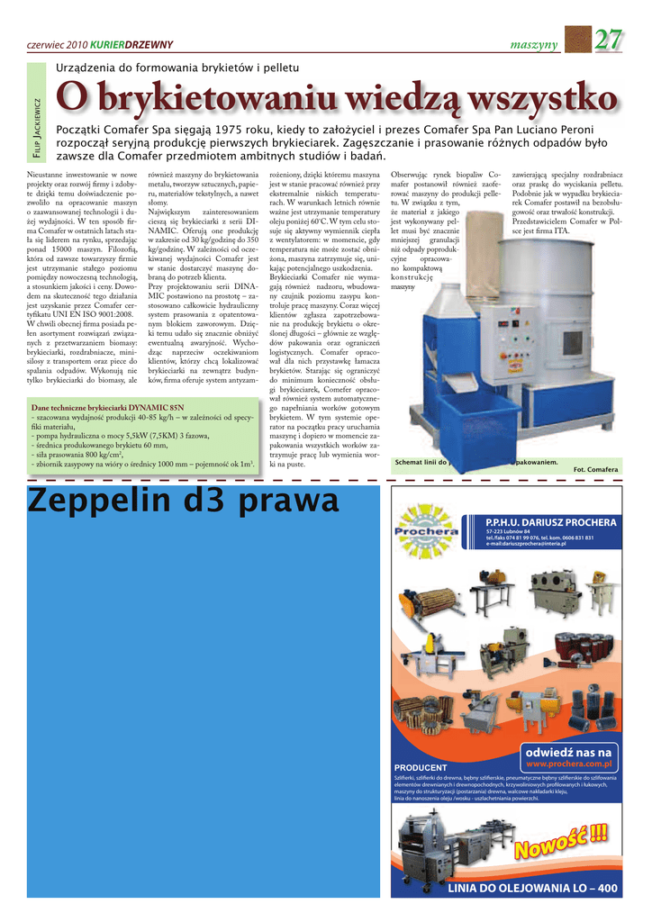 27 maszyny czerwiec 2010 KURIERDRZEWNY !"#"$%&'()"*+"(, !"#$%#&'()*%+*,+"-+.)'()*/"01(&23.*(*4&55&26 O brykietowaniu wiedzą wszystko 7+8#$21(*9+-),&"*:4)*;(<=)>$*?@AB*"+16C*1(&%0*2+*#)D+E08(&5*(*4"&#&;*9+-),&"*:4)*7)'*F68()'+*7&"+'(* "+#4+8#$D*;&"0>'$*4"+%618><*4(&".;#08G*/"01(&8()"&1H*I)=<;#8#)'(&*(*4");+.)'(&*"3E'08G*+%4)%3.*/0D+* #).;#&*%5)*9+-),&"*4"#&%-(+2&-*)-/(2'08G*;26%(3.*(*/)%)JH Nieustanne inwestowanie w nowe projekty oraz rozwój firmy i zdobyte dzięki temu doświadczenie pozwoliło na opracowanie maszyn o zaawansowanej technologii i dużej wydajności. W ten sposób firma Comafer w ostatnich latach stała się liderem na rynku, sprzedając ponad 15000 maszyn. Filozofią, która od zawsze towarzyszy firmie jest utrzymanie stałego poziomu pomiędzy nowoczesną technologią, a stosunkiem jakości i ceny. Dowodem na skuteczność tego działania jest uzyskanie przez Comafer certyfikatu UNI EN ISO 9001:2008. W chwili obecnej firma posiada pełen asortyment rozwiązań związanych z przetwarzaniem biomasy: brykieciarki, rozdrabniacze, minisilosy z transportem oraz piece do spalania odpadów. Wykonują nie tylko brykieciarki do biomasy, ale również maszyny do brykietowania metalu, tworzyw sztucznych, papieru, materiałów tekstylnych, a nawet słomy. Największym zainteresowaniem cieszą się brykieciarki z serii DINAMIC. Oferują one produkcję w zakresie od 30 kg/godzinę do 350 kg/godzinę. W zależności od oczekiwanej wydajności Comafer jest w stanie dostarczyć maszynę dobraną do potrzeb klienta. Przy projektowaniu serii DINAMIC postawiono na prostotę – zastosowano całkowicie hydrauliczny system prasowania z opatentowanym blokiem zaworowym. Dzięki temu udało się znacznie obniżyć ewentualną awaryjność. Wychodząc naprzeciw oczekiwaniom klientów, którzy chcą lokalizować brykieciarki na zewnątrz budynków, firma oferuje system antyzam- Dane techniczne brykieciarki DYNAMIC 85N - szacowana wydajność produkcji 40-85 kg/h – w zależności od specyfiki materiału, - pompa hydrauliczna o mocy 5,5kW (7,5KM) 3 fazowa, - średnica produkowanego brykietu 60 mm, - siła prasowania 800 kg/cm2, - zbiornik zasypowy na wióry o średnicy 1000 mm – pojemność ok 1m3. rożeniony, dzięki któremu maszyna jest w stanie pracować również przy ekstremalnie niskich temperaturach. W warunkach letnich równie ważne jest utrzymanie temperatury oleju poniżej 60˚C. W tym celu stosuje się aktywny wymiennik ciepła z wentylatorem: w momencie, gdy temperatura nie może zostać obniżona, maszyna zatrzymuje się, unikając potencjalnego uszkodzenia. Brykieciarki Comafer nie wymagają również nadzoru, wbudowany czujnik poziomu zasypu kontroluje pracę maszyny. Coraz więcej klientów zgłasza zapotrzebowanie na produkcję brykietu o określonej długości – głównie ze względów pakowania oraz ograniczeń logistycznych. Comafer opracował dla nich przystawkę łamacza brykietów. Starając się ograniczyć do minimum konieczność obsługi brykieciarek, Comefer opracował również system automatycznego napełniania worków gotowym brykietem. W tym systemie operator na początku pracy uruchamia maszynę i dopiero w momencie zapakowania wszystkich worków zatrzymuje pracę lub wymienia worki na puste. Obserwując rynek biopaliw Comafer postanowił również zaoferować maszyny do produkcji pelletu. W związku z tym, że materiał z jakiego jestt wykonywany pellet musi być znacznie ejszej granulacji mniejszej niż odpady poprodukopracowacyjne no kompaktową strukcję konstrukcję zyny maszyny zawierającą specjalny rozdrabniacz oraz praskę do wyciskania pelletu. Podobnie jak w wypadku brykieciarek Comafer postawił na bezobsługowość oraz trwałość konstrukcji. Przedstawicielem Comafer w Pol Polsce jest firma ITA. -./"0+1'$%&%%'(2'#*2(34.5%'6*74%"13'8'#+42,+&%"09' -./"0+1'$%&%%'(2'#*2 '#*2(34. '#*2 (34.5%'6 (34. 5%'6*74% 5%'6 *74%"13' *74% "13'8'#+ "13' 8'#+42,+&%"09' 8'#+ :219';20+<"*+ !"##"$%&'()'#*+,+' P.P.H.U. DARIUSZ PROCHERA 57-223 Lubnów 84 tel./faks 074 81 99 076, tel. kom. 0606 831 831 e-mail:[email protected] odwiedź nas na !"#$%&'() www.prochera.com.pl Szlifierki, szlifierki do drewna, bębny szlifierskie, pneumatyczne bębny szlifierskie do szlifowania elementów drewnianych i drewnopochodnych, krzywoliniowych profilowanych i łukowych, maszyny do strukturyzacji (postarzania) drewna, walcowe nakładarki kleju, linia do nanoszenia oleju /wosku - uszlachetniania powierzchi. LINIA DO OLEJOWANIA LO – 400