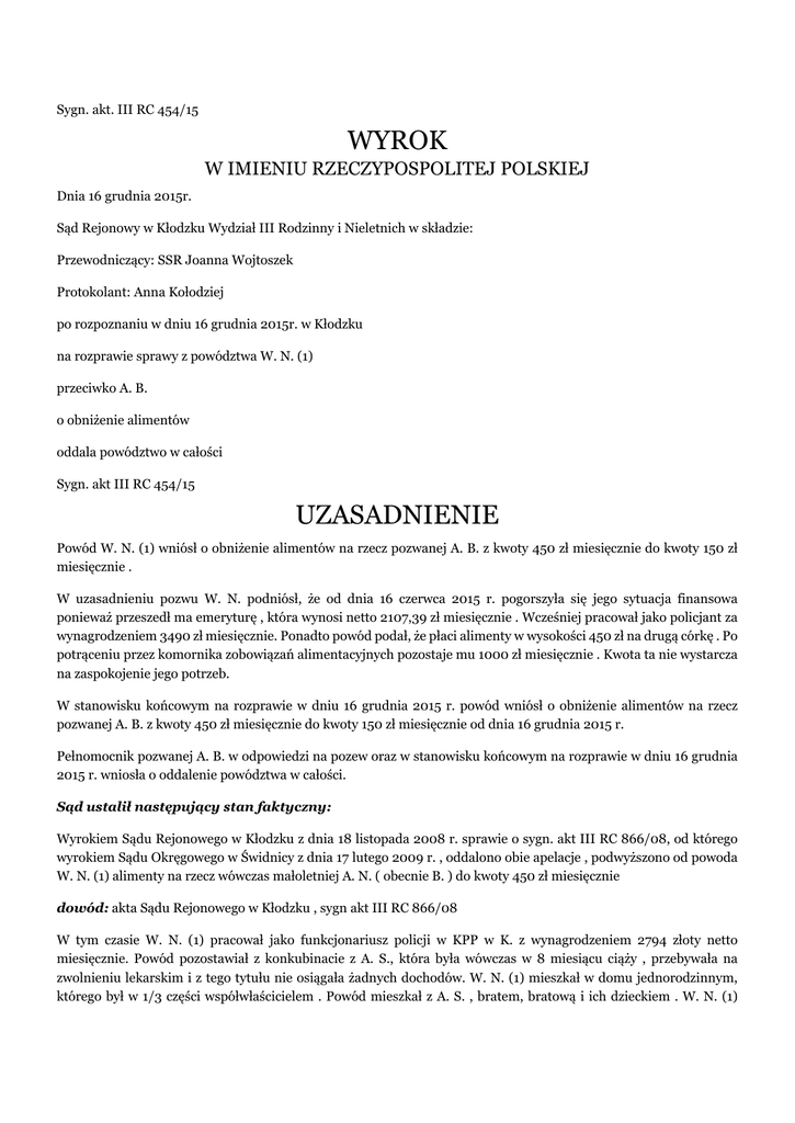 Sygn. akt. III RC 454/15 WYROK W IMIENIU RZECZYPOSPOLITEJ POLSKIEJ Dnia 16 grudnia 2015r. Sąd Rejonowy w Kłodzku Wydział III Rodzinny i Nieletnich w składzie: Przewodniczący: SSR Joanna Wojtoszek Protokolant: Anna Kołodziej po rozpoznaniu w dniu 16 grudnia 2015r. w Kłodzku na rozprawie sprawy z powództwa W. N. (1) przeciwko A. B. o obniżenie alimentów oddala powództwo w całości Sygn. akt III RC 454/15 UZASADNIENIE Powód W. N. (1) wniósł o obniżenie alimentów na rzecz pozwanej A. B. z kwoty 450 zł miesięcznie do kwoty 150 zł miesięcznie . W uzasadnieniu pozwu W. N. podniósł, że od dnia 16 czerwca 2015 r. pogorszyła się jego sytuacja finansowa ponieważ przeszedł ma emeryturę , która wynosi netto 2107,39 zł miesięcznie . Wcześniej pracował jako policjant za wynagrodzeniem 3490 zł miesięcznie. Ponadto powód podał, że płaci alimenty w wysokości 450 zł na drugą córkę . Po potrąceniu przez komornika zobowiązań alimentacyjnych pozostaje mu 1000 zł miesięcznie . Kwota ta nie wystarcza na zaspokojenie jego potrzeb. W stanowisku końcowym na rozprawie w dniu 16 grudnia 2015 r. powód wniósł o obniżenie alimentów na rzecz pozwanej A. B. z kwoty 450 zł miesięcznie do kwoty 150 zł miesięcznie od dnia 16 grudnia 2015 r. Pełnomocnik pozwanej A. B. w odpowiedzi na pozew oraz w stanowisku końcowym na rozprawie w dniu 16 grudnia 2015 r. wniosła o oddalenie powództwa w całości. Sąd ustalił następujący stan faktyczny: Wyrokiem Sądu Rejonowego w Kłodzku z dnia 18 listopada 2008 r. sprawie o sygn. akt III RC 866/08, od którego wyrokiem Sądu Okręgowego w Świdnicy z dnia 17 lutego 2009 r. , oddalono obie apelacje , podwyższono od powoda W. N. (1) alimenty na rzecz wówczas małoletniej A. N. ( obecnie B. ) do kwoty 450 zł miesięcznie dowód: akta Sądu Rejonowego w Kłodzku , sygn akt III RC 866/08 W tym czasie W. N. (1) pracował jako funkcjonariusz policji w KPP w K. z wynagrodzeniem 2794 złoty netto miesięcznie. Powód pozostawiał z konkubinacie z A. S., która była wówczas w 8 miesiącu ciąży , przebywała na zwolnieniu lekarskim i z tego tytułu nie osiągała żadnych dochodów. W. N. (1) mieszkał w domu jednorodzinnym, którego był w 1/3 części współwłaścicielem . Powód mieszkał z A. S. , bratem, bratową i ich dzieckiem . W. N. (1) ponosił wówczas wszystkie opłaty związane z utrzymaniem domu, na które składały się 200 zł energia elektryczna, 150 zł woda, 150-200 zł -gaz w sezonie letnim , 600 zł gaz w sezonie zimowym . Powód w październiku 2008 r. zaciągnął kredyt w wysokości 20 000 złotych, na montaż instalacji gazowej w domu . Rata kredytu wynosiła 630 zł , termin spłaty- wrzesień 2012 r. W. N. (1) posiadał wówczas samochód marki O. (...) rok prok. 1989 r o wartości 500 złotych. Powód łożył alimenty na rzecz córki A. B. , od około dwóch miesięcy nie utrzymywał z nią kontaktu. W. N. (1) kupował drobne prezenty na rzecz córki. dowód: akta Sądu Rejonowego w Kłodzku , sygn akt III RC 866/08 W tym czasie pozwana A. B. miała 11 lat i jej przedstawicielką ustawowa była matka I. B.. Miesięczny koszt wszystkich usprawiedliwionych potrzeb wówczas małoletniej pozwanej wynosił co najmniej 1000 zł .Od maja 2008 r. pozwana leczyła się u alergologa , z tego tytułu jej matka wydawała dodatkowo 150 zł miesięcznie na leki i 70 zł na prywatne wizyty lekarskie. Ponadto u A. B. wykryto wadę stóp-skrzywienie i dlatego matka zakupiła jej dwukrotnie wkładki ortopedyczne , na które wydatkowała kwoty po 70 złotych. I. B. kupowała córce okolicznościowe prezenty z okazji urodzin , dnia dziecka, itp. , za który wydatkowała każdorazowo kwotę ok. 100 zł. dowód: akta Sądu Rejonowego w Kłodzku , sygn III RC 866/08 Wówczas I. B. była zatrudniona w Powiatowym Inspektoracie Nadzoru Budowlanego w K. ze średnim wynagrodzeniem w kwocie 1757,21 zł netto miesięcznie. Ponadto matka pozwanej podejmowała zatrudnienie w Prywatnym Liceum dla Dorosłych,, Omnibus'' w K. za wynagrodzenie uzależnionym od ilości przepracowanych godzin ( we wrześniu 2008 r. - 451,20 zł, w październiku 2008 r. - 496,34 zł) dowód: akta Sądu Rejonowego w Kłodzku , sygn akt III RC 866/08 Obecnie W. N. (1) ma 42 lata, nie ma wyuczonego zawodu, do dnia 15 czerwca 2015 r. był zatrudniony jako funkcjonariusz Policji w KPP w K. , z miesięcznym wynagrodzeniem netto około 3490 złotych. Z dniem 16 czerwca 2015 r. powód . na swój wniosek ( raport powoda o zwolnienie ze służby w Policji z dnia 16 03 2015 r. ) przeszedł na wcześniejsza emeryturę ,po 21 latach pracy. Wysokość jego emerytury wynosi 2107, 39 zł netto miesięcznie. Przechodząc na emeryturę powód otrzymał odprawę emerytalną w wysokości około 18 000 złotych. W 2013 r. W. N. (1) osiągnął dochód , po odliczeniu składek na ubezpieczenie zdrowotne w wysokości 52 633,37 zł, co daje miesięcznie kwotę 4386,11zł W 2014 r. W. N. (1) osiągnął dochód , po odliczeniu składek na ubezpieczenie zdrowotne w wysokości 57 479,22 zł, co daje miesięcznie kwotę 4789,93 zł. W. N. (1) w dniu 12 maja 2015 r. został skierowany do Wojewódzkiej Komisji Lekarskiej we W. . Powód nie wykonał niezbędnych badań i do dnia zamknięcia rozprawy nie wpłynęło do Komendy Powiatowej Policji w K. orzeczenie lekarskie o jego stanie zdrowia. Obecnie W. N. (1) leczy się na nerwice i nadciśnienie. Na leki z tego tytułu powinien wydawać miesięcznie około 200-220 złotych. Powód nie wykupuje tych leków .W. N. (1) nie posiada orzeczenia o niepełnosprawności ani orzeczenia ZUS-u , o tym że jest niezdolny do wykonywania pracy. W. N. (1) jest współwłaścicielem w 1/3 części domu jednorodzinnego , który zamieszkuje razem z bratem M. N. , jego konkubiną i synem .Dom ma powierzchnie 180 m2 . Powód prowadzi sam gospodarstwo domowe. W. N. na wszystkie opłaty związane z utrzymaniem domu przekazuje bratu około 400 złotych