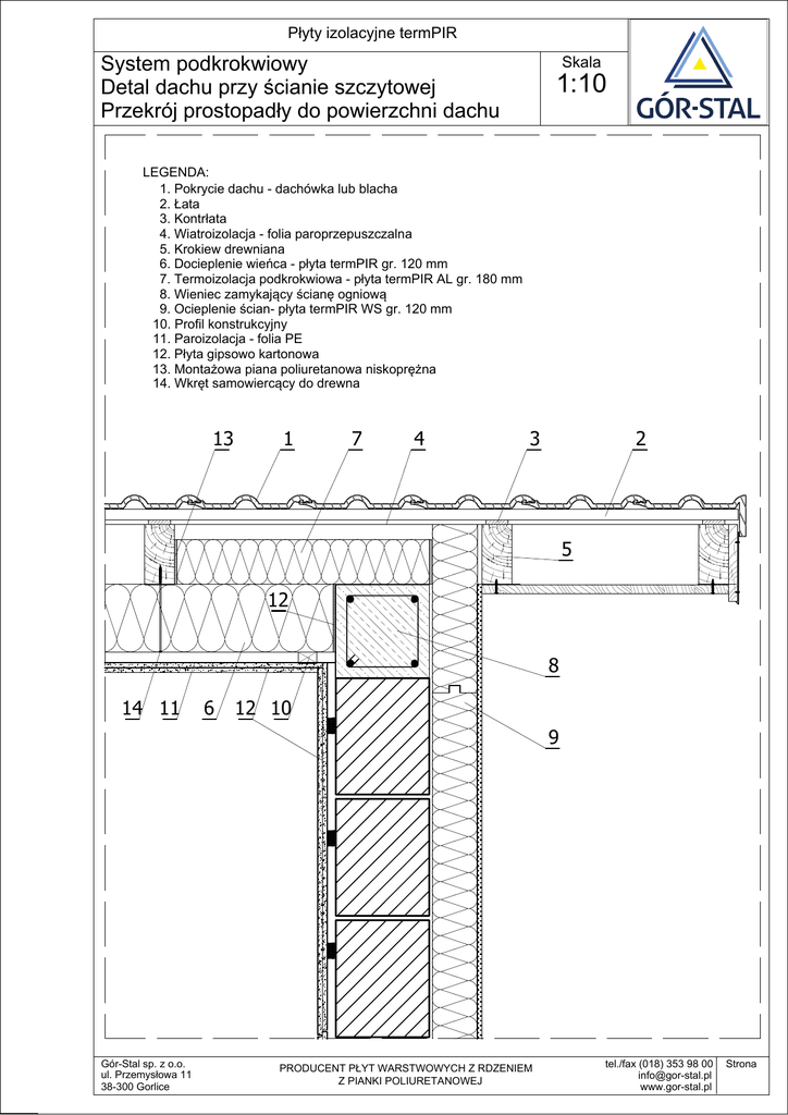 Płyty izolacyjne termPIR System podkrokwiowy Detal dachu przy ścianie szczytowej Przekrój prostopadły do powierzchni dachu Skala 1:10 LEGENDA: 1. Pokrycie dachu - dachówka lub blacha 2. Łata 3. Kontrłata 4. Wiatroizolacja - folia paroprzepuszczalna 5. Krokiew drewniana 6. Docieplenie wieńca - płyta termPIR gr. 120 mm 7. Termoizolacja podkrokwiowa - płyta termPIR AL gr. 180 mm 8. Wieniec zamykający ścianę ogniową 9. Ocieplenie ścian- płyta termPIR WS gr. 120 mm 10. Profil konstrukcyjny 11. Paroizolacja - folia PE 12. Płyta gipsowo kartonowa 13. Montażowa piana poliuretanowa niskoprężna 14. Wkręt samowiercący do drewna 13 1 7 4 3 2 5 12 8 14 11 6 12 10 9 Gór-Stal sp. z o.o. ul. Przemysłowa 11 38-300 Gorlice PRODUCENT PŁYT WARSTWOWYCH Z RDZENIEM Z PIANKI POLIURETANOWEJ tel./fax (018) 353 98 00 [email protected] www.gor-stal.pl Strona