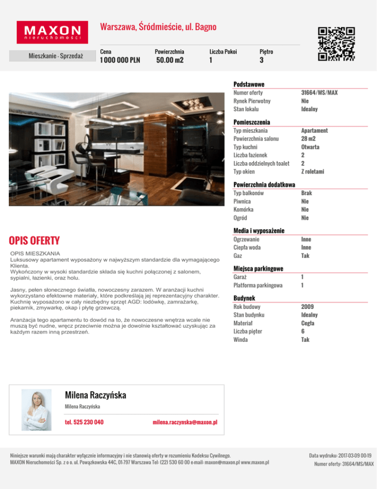 Warszawa, Śródmieście, ul. Bagno Mieszkanie - Sprzedaż Cena 1 000 000 PLN Powierzchnia 50.00 m2 Liczba Pokoi 1 Piętro 3 Podstawowe Numer oferty 31664/MS/MAX Rynek Pierwotny Nie Stan lokalu Idealny Pomieszczenia Typ mieszkania Apartament Powierzchnia salonu 28 m2 Typ kuchni Otwarta Liczba łazienek 2 Liczba oddzielnych toalet 2 Typ okien Z roletami Powierzchnia dodatkowa Typ balkonów Brak Piwnica Nie Komórka Nie Ogród Nie Media i wyposażenie OPIS OFERTY OPIS MIESZKANIA Luksusowy apartament wyposażony w najwyższym standardzie dla wymagającego Klienta. Wykończony w wysoki standardzie składa się kuchni połączonej z salonem, sypialni, łazienki, oraz holu. Jasny, pełen słonecznego światła, nowoczesny zarazem. W aranżacji kuchni wykorzystano efektowne materiały, które podkreślają jej reprezentacyjny charakter. Kuchnię wyposażono w cały niezbędny sprzęt AGD: lodówkę, zamrażarkę, piekarnik, zmywarkę, okap i płytę grzewczą. Aranżacja tego apartamentu to dowód na to, że nowoczesne wnętrza wcale nie muszą być nudne, wręcz przeciwnie można je dowolnie kształtować uzyskując za każdym razem inną przestrzeń. Ogrzewanie Inne Ciepła woda Inne Gaz Tak Miejsca parkingowe Garaż 1 Platforma parkingowa 1 Budynek Rok budowy 2009 Stan budynku Idealny Materiał Cegła Liczba pięter 6 Winda Tak Milena Raczyńska Milena Raczyńska tel. 525 230 040 [email protected] Niniejsze warunki mają charakter wyłącznie informacyjny i nie stanowią oferty w rozumieniu Kodeksu Cywilnego. MAXON Nieruchomości Sp. z o o. ul. Powązkowska 44C, 01-797 Warszawa Tel: (22) 530 60 00 e-mail: [email protected] www.maxon.pl Data wydruku: 2017-03-09 00:19 Numer oferty: 31664/MS/MAX