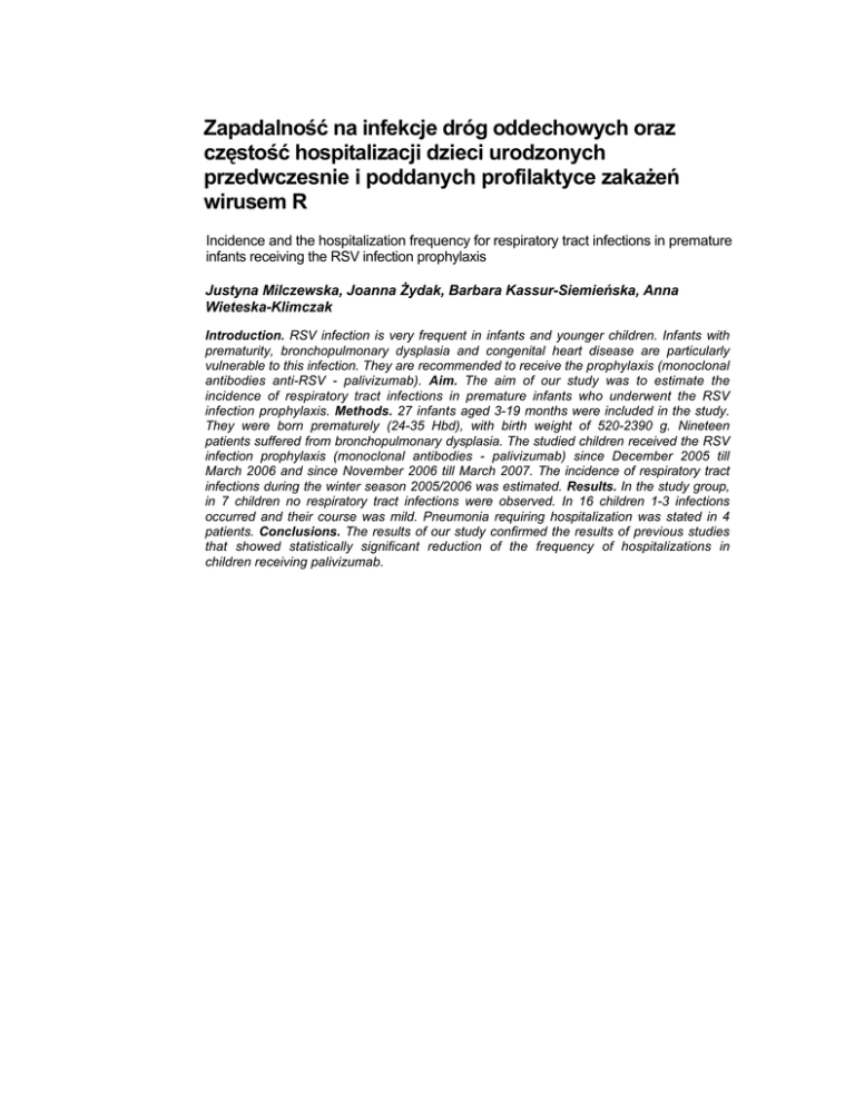 Zapadalność na infekcje dróg oddechowych oraz częstość hospitalizacji dzieci urodzonych przedwczesnie i poddanych profilaktyce zakażeń wirusem R Incidence and the hospitalization frequency for respiratory tract infections in premature infants receiving the RSV infection prophylaxis Justyna Milczewska, Joanna Żydak, Barbara Kassur-Siemieńska, Anna Wieteska-Klimczak Introduction. RSV infection is very frequent in infants and younger children. Infants with prematurity, bronchopulmonary dysplasia and congenital heart disease are particularly vulnerable to this infection. They are recommended to receive the prophylaxis (monoclonal antibodies anti-RSV - palivizumab). Aim. The aim of our study was to estimate the incidence of respiratory tract infections in premature infants who underwent the RSV infection prophylaxis. Methods. 27 infants aged 3-19 months were included in the study. They were born prematurely (24-35 Hbd), with birth weight of 520-2390 g. Nineteen patients suffered from bronchopulmonary dysplasia. The studied children received the RSV infection prophylaxis (monoclonal antibodies - palivizumab) since December 2005 till March 2006 and since November 2006 till March 2007. The incidence of respiratory tract infections during the winter season 2005/2006 was estimated. Results. In the study group, in 7 children no respiratory tract infections were observed. In 16 children 1-3 infections occurred and their course was mild. Pneumonia requiring hospitalization was stated in 4 patients. Conclusions. The results of our study confirmed the results of previous studies that showed statistically significant reduction of the frequency of hospitalizations in children receiving palivizumab.