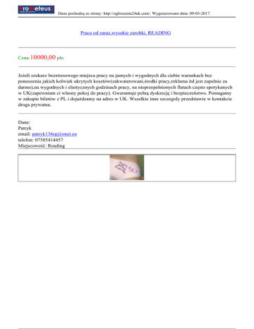 Dane pochodzą ze strony: http://ogloszenia24uk.com/. Wygenerowano dnia: 09-03-2017. Praca od zaraz,wysokie zarobki, READING Cena:10000,00 pln Jeżeli szukasz bezstresowego miejsca pracy na jasnych i wygodnych dla ciebie warunkach bez ponoszenia jakich kolwiek ukrytych kosztów(zakwaterowani,środki pracy,reklama itd jest zupelnie za darmo),na wygodnych i elastycznych godzinach pracy, na nieprzepełnionych flatach często spotykanych w UK(zapewniam ci wlasny pokoj do pracy). Gwarantuje pełną dyskrecję i bezpieczeństwo. Pomagamy w zakupie biletów z PL i dojażdzamy na adres w UK. Wszelkie inne szczegoly przedstawie w kontakcie droga prywatna. Dane: Patryk email: [email protected] telefon: 07585414457 Miejscowość: Reading