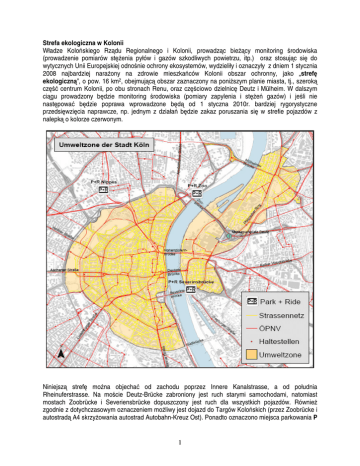 Strefa ekologiczna w Kolonii Władze Kolońskiego Rządu Regionalnego i Kolonii, prowadząc bieŜący monitoring środowiska (prowadzenie pomiarów stęŜenia pyłów i gazów szkodliwych powietrzu, itp.) oraz stosując się do wytycznych Unii Europejskiej odnośnie ochrony ekosystemów, wydzieliły i oznaczyły z dniem 1 stycznia 2008 najbardziej naraŜony na zdrowie mieszkańców Kolonii obszar ochronny, jako „strefę ekologiczną”, o pow. 16 km2, obejmującą obszar zaznaczony na poniŜszym planie miasta, tj., szeroką część centrum Kolonii, po obu stronach Renu, oraz częściowo dzielnicę Deutz i Mülheim. W dalszym ciągu prowadzony będzie monitoring środowiska (pomiary zapylenia i stęŜeń gazów) i jeśli nie następować będzie poprawa wprowadzone będą od 1 styczna 2010r. bardziej rygorystyczne przedsięwzięcia naprawcze, np. jednym z działań będzie zakaz poruszania się w strefie pojazdów z nalepką o kolorze czerwonym. Niniejszą strefę moŜna objechać od zachodu poprzez Innere Kanalstrasse, a od południa Rheinuferstrasse. Na moście Deutz-Brücke zabroniony jest ruch starymi samochodami, natomiast mostach Zoobrücke i Severiensbrücke dopuszczony jest ruch dla wszystkich pojazdów. RównieŜ zgodnie z dotychczasowym oznaczeniem moŜliwy jest dojazd do Targów Kolońskich (przez Zoobrücke i autostradą A4 skrzyŜowania autostrad Autobahn-Kreuz Ost). Ponadto oznaczono miejsca parkowania P 1 + R przed wjazdem do strefy ekologicznej, tj. Severinsbrücke, Zoo, Nippes i parkingi Targów Kolońskich, a takŜe parking kolońskiej hali widowiskowej KölnArena, gdzie istnieje moŜliwość zaparkowania pojazdu i bardzo łatwego dostania się środkami komunikacji miejskiej do strefy ekologicznej. W samej Kolonii zakaz wjazdu do strefy dotyczy ok. 5 do 7% starych samochodów, w tym, co najmniej 15 000 samochodów osobowych i 6 500 samochodów o ładowności do 3,5 t, które to bez dodatkowego wyposaŜenia technicznego (katalizator, filtr) nie otrzymają Ŝadnej z nalepek ekologicznych. Wyjątkowo, tj. na okres przejściowy do 30 lipca 2008 dla pojazdów mieszkańców strefy ekologicznej - bez badań technicznych pojazdów - wydano odpowiednie nalepki ekologiczne. Ponadto Koloński Rząd Regionalny i Rada Miasta Kolonii wprowadziły katalog określonych przejściowo specjalnych pozwoleń, który obejmuje: pojazdy rzemieślników, mieszkańców strefy, dostawców artykułów spoŜywczych, zaopatrzenia aptek, domów opieki społecznej, pojazdy inwalidów, policji, straŜy poŜarnej, oczyszczania miasta, maszyny robocze, rolnicze, motocykle, skutery, samochody pogotowia technicznego, karetki pogotowia, samochody lekarzy rodzinnych, pojazdy transportu cięŜkiego, pojazdy specjalne, itp.. Są one na specjalnych zasadach wyłączone z zakazu poruszania się w strefie ekologicznej. Pozwolenia wyjątkowe wydawane są na okres 1 roku z moŜliwością – po przedłoŜeniu określonych okoliczności - o dalszy rok. Poza tym dopuszczono tzw. dzienne pozwolenia wjazdu do strefy (np. autobusy turystyczne, dojazd zbiorowy na koncert, itp.). Wehikuły zabytkowe (Oldtimer, ponad 30 - letnie) z oznaczeniem „H” i „07” , traktowane są w całych Niemczech na specjalnych zasadach i dopuszczone do ruchu w strefach ekologicznych. Wnioski o pozwolenia specjalne odnośnie poruszania się pojazdem w strefie ekologicznej naleŜy składać na specjalnych formularzach (do pobrania z www.stadt-koeln.de) na adres: Stadt Köln Kfz – Zulassungsstelle Max – Glomsda – Strasie 4 51105 Köln – Poll lub Stadt Köln Amt für öffentliche Ordnung Ottmar – Pohl – Platz 1 51103 Köln, e-mail:[email protected] Opłaty za wydanie pozwoleń specjalnych wahają się w granicach 5 euro (wykorzystanie okresu przejściowego), 15 euro (np. wyjątkowe pozwolenie dla mieszkańców strefy) i 75 euro (np. za pracochłonne badanie sam. cięŜarowego). Opracował: Bronisław Jaworski / WPHI Kolonia 2