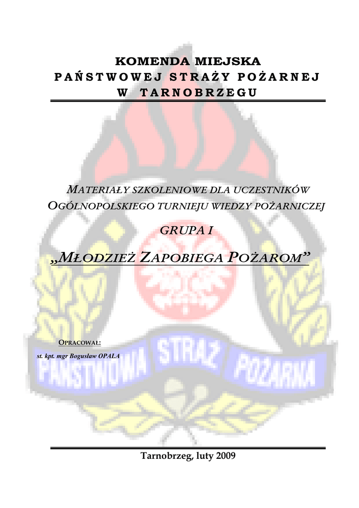KOMENDA MIEJSKA PAŃSTWOWEJ STRAśY POśARNEJ W TARNOBRZEGU MATERIAŁY SZKOLENIOWE DLA UCZESTNIKÓW OGÓLNOPOLSKIEGO TURNIEJU WIEDZY POŻARNICZEJ GRUPA I „MŁODZIEŻ ZAPOBIEGA POŻAROM” OPRACOWAŁ: st. kpt. mgr Bogusław OPALA Tarnobrzeg, luty 2009 MATERIAŁY SZKOLENIOWE DLA UCZESTNIKÓW OTWP „MŁODZIEś ZAPOBIEGA POśAROM” 2 Spis treści 1. Organizacja ochrony przeciwpoŜarowej ................................................................................... 4 2. Organizacja państwowej straŜy poŜarnej ................................................................................. 8 2.1. JEDNOSTKI ORGANIZACYJNE PAŃSTWOWEJ STRAśY POśARNEJ: ................................................................ 8 2.1.1 Korpusy i stopnie w Państwowej Straży Pożarnej .............................................. 9 3. Grupy poŜarów i zastosowanie środków gaśniczych .......................................................... 10 3.1. PODZIAŁ POśARÓW NA GRUPY.................................................................................................................. 10 3.2. PODZIAŁ ŚRODKÓW GAŚNICZYCH ............................................................................................................. 10 3.2.1 Woda i jej roztwory .................................................................................... 10 3.2.2 Piany gaśnicze ........................................................................................... 11 3.2.3 Proszki gaśnicze ......................................................................................... 12 3.2.4 Gazy gaśnicze............................................................................................ 12 4. Jednostki ochrony przeciwpoŜarowej...................................................................................... 13 5. Sprzęt poŜarniczy......................................................................................................................... 13 5.1. DRABINY POśARNICZE ............................................................................................................................. 14 6. Podręczny sprzęt gaśniczy.......................................................................................................... 14 6.1. CHARAKTERYSTYKA PODRĘCZNEGO SPRZĘTU GAŚNICZEGO ..................................................................... 14 6.2. WYMAGANIA W ZAKRESIE WYPOSAśENIA, ROZMIESZCZENIA I KONSERWACJI GAŚNIC W OBIEKTACH ....... 17 6.2.1 Wyposażenie obiektów w gaśnice ................................................................. 17 6.2.2 Rozmieszczenie gaśnic w obiektach .............................................................. 18 6.2.3 Przeglądy techniczne i czynności konserwacyjne gaśnic ................................... 18 7. Zabezpieczenie przeciwpoŜarowe budynków ....................................................................... 19 7.1. PODZIAŁ BUDYNKÓW ORAZ ICH CZĘŚCI Z UWAGI NA PRZEZNACZENIE I SPOSÓB UśYTKOWANIA............... 19 7.1.1 Podział budynków oraz ich części ze względu na katęgorię zagrożenia ludzi ........ 19 7.2. CZYNNOŚCI ZABRONIONE ZE WZGLĘDU NA ZAGROśENIE POśAROWE ........................................................ 19 7.3. PODSTAWOWE OBOWIĄZKI WŁAŚCICIELI, UśYTKOWNIKÓW OBIEKTÓW W ZAKRESIE ZABEZPIECZENIA PRZECIWPOśAROWEGO ............................................................................................................................. 21 7.4. PRZECIWPOśAROWY WYŁĄCZNIK PRĄDU ................................................................................................. 22 7.5. UTRZYMYWANIE PRZEWODÓW KOMINOWYCH ......................................................................................... 22 7.6. UTRZYMYWANIE INSTALACJI ELEKTRYCZNEJ ........................................................................................... 23 7.6.1 Pomiary instalacji elektrycznej ...................................................................... 23 7.6.2 Stan techniczny bezpieczników prądu............................................................ 23 7.6.3 Stan techniczny urządzeń i instalacji elektrycznych .......................................... 23 7.7. UTRZYMYWANIE URZĄDZEŃ PIORUNOCHRONNYCH ................................................................................. 23 7.7.1 Badania okresowe urządzeń piorunochronnych ................................................ 24 7.8. UTRZYMYWANIE INSTALACJI GAZOWEJ .................................................................................................... 24 MATERIAŁY SZKOLENIOWE DLA UCZESTNIKÓW OTWP „MŁODZIEś ZAPOBIEGA POśAROM” 3 7.8.1 Okresowe kontrole stanu technicznej sprawności instalacji gazowej .................. 24 7.9. EKSPLOATACJA BUTLI Z GAZEM PŁYNNYM (PROPAN – BUTAN) ................................................................ 24 7.10. SYSTEM SYGNALIZACJI POśARU ............................................................................................................... 25 7.11. DŹWIĘKOWY SYSTEM OSTRZEGAWCZY .................................................................................................... 26 8. Zabezpieczenie przeciwpoŜarowe zbioru, transportu i składowania palnych płodów rolnych............................................................................................................................................ 27 9. ZAGROśENIE POśAROWE LASU ........................................................................................ 28 9.1. CZYNNIKI KSZTAŁTUJĄCE ZAGROśENIE POśAROWE LASU ......................................................................... 28 9.2. KATEGORIE I STOPNIE ZAGROśENIA POśAROWEGO LASÓW ....................................................................... 29 9.2.1 Kategorie zagrożenia pożarowego lasów ........................................................ 29 9.2.2 Stopnie zagrożenia pożarow