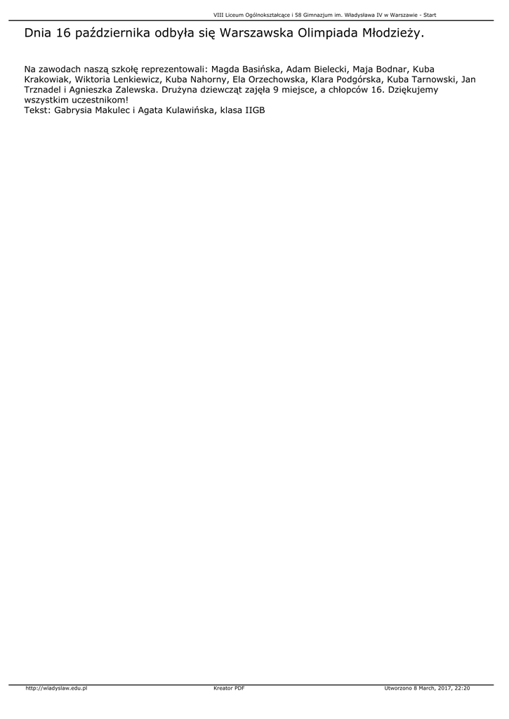 VIII Liceum Ogólnokształcące i 58 Gimnazjum im. Władysława IV w Warszawie - Start Dnia 16 października odbyła się Warszawska Olimpiada Młodzieży. Na zawodach naszą szkołę reprezentowali: Magda Basińska, Adam Bielecki, Maja Bodnar, Kuba Krakowiak, Wiktoria Lenkiewicz, Kuba Nahorny, Ela Orzechowska, Klara Podgórska, Kuba Tarnowski, Jan Trznadel i Agnieszka Zalewska. Drużyna dziewcząt zajęła 9 miejsce, a chłopców 16. Dziękujemy wszystkim uczestnikom! Tekst: Gabrysia Makulec i Agata Kulawińska, klasa IIGB http://wladyslaw.edu.pl Kreator PDF Utworzono 8 March, 2017, 22:20