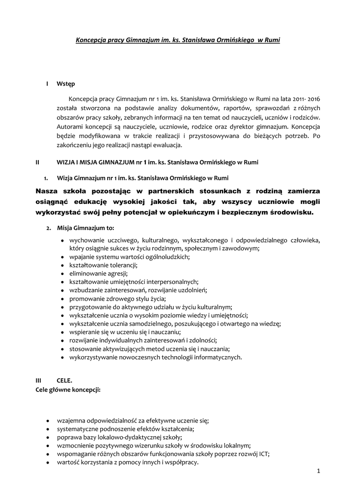 Koncepcja pracy Gimnazjum im. ks. Stanisława Ormioskiego w Rumi I Wstęp Koncepcja pracy Gimnazjum nr 1 im. ks. Stanisława Ormińskiego w Rumi na lata 2011- 2016 została stworzona na podstawie analizy dokumentów, raportów, sprawozdań z różnych obszarów pracy szkoły, zebranych informacji na ten temat od nauczycieli, uczniów i rodziców. Autorami koncepcji są nauczyciele, uczniowie, rodzice oraz dyrektor gimnazjum. Koncepcja będzie modyfikowana w trakcie realizacji i przystosowywana do bieżących potrzeb. Po zakończeniu jego realizacji nastąpi ewaluacja. WIZJA I MISJA GIMNAZJUM nr 1 im. ks. Stanisława Ormińskiego w Rumi II 1. Wizja Gimnazjum nr 1 im. ks. Stanisława Ormińskiego w Rumi Nasza szkoła pozostając w partnerskich stosunkach z rodziną zamierza osiągnąć edukację wysokiej jakości tak, aby wszyscy uczniowie mogli wykorzystać swój pełny potencjał w opiekuńczym i bezpiecznym środowisku. 2. Misja Gimnazjum to: wychowanie uczciwego, kulturalnego, wykształconego i odpowiedzialnego człowieka, który osiągnie sukces w życiu rodzinnym, społecznym i zawodowym; wpajanie systemu wartości ogólnoludzkich; kształtowanie tolerancji; eliminowanie agresji; kształtowanie umiejętności interpersonalnych; wzbudzanie zainteresowań, rozwijanie uzdolnień; promowanie zdrowego stylu życia; przygotowanie do aktywnego udziału w życiu kulturalnym; wykształcenie ucznia o wysokim poziomie wiedzy i umiejętności; wykształcenie ucznia samodzielnego, poszukującego i otwartego na wiedzę; wspieranie się w uczeniu się i nauczaniu; rozwijanie indywidualnych zainteresowań i zdolności; stosowanie aktywizujących metod uczenia się i nauczania; wykorzystywanie nowoczesnych technologii informatycznych. III CELE. Cele główne koncepcji: wzajemna odpowiedzialność za efektywne uczenie się; systematyczne podnoszenie efektów kształcenia; poprawa bazy lokalowo-dydaktycznej szkoły; wzmocnienie pozytywnego wizerunku szkoły w środowisku lokalnym; wspomaganie różnych obszarów funkcjonowania szkoły poprzez rozwój ICT; wartość korzystania z pomocy innych i współpracy. 1 Obszar I. Dydaktyka Działania szkoły Aktualizowanie, korygowanie szkolnych i modyfikowanie szkolnego zestawu programów nauczania, by zapewnid uczniom opanowanie umiejętności pracy z arkuszem egzaminacyjnym oraz określonym rodzajem i typem zadao. Analiza arkuszy egzaminacyjnych w zespołach w odniesieniu do celów kształcenia i treści przedmiotowych nauczania zawartych w podstawie programowej. Analiza wyników uzyskanych przez szkołę, poszczególne oddziały i poszczególnych uczniów (absolwentów). Odpowiednie interpretowanie wyników szkoły w kontekście rozkładu wyników okręgu i kraju. Porównanie wyników uczniów uzyskane na wejściu (oceny ze świadectwa ukooczenia szkoły podstawowej i wyniki sprawdzianu kl. VI) do potencjału edukacyjnego absolwentów, przyrostu umiejętności i wiedzy, którego wskaźnikiem jest między innymi wynik uzyskany na egzaminie gimnazjalnym. Udział w ogólnopolskich badaniach wyników nauczania (np. projekt „Lepsza szkoła”). Przeprowadzanie próbnych egzaminów gimnazjalnych. Przygotowywanie uczniów do konkursów przedmiotowych i tematycznych. Promowanie uczniów osiągających różnorodne sukcesy szkolne. Udział we współzawodnictwie sportowym. Dostosowywanie treści programowych do potrzeb ucznia i zaleceo PPP. Organizowanie systemu zindywidualizowanej pomocy uczniom o specjalnych potrzebach edukacyjnych., organizowanie zajęd terapii pedagogicznej, socjoterapii. Dostosowywanie tematyki dodatkowych zajęd edukacyjnych do potrzeb 2 uczniów (np. koło PCK, koło fotograficzne, teatralne…). Prowadzenie zajęd rozwijających zdolności oraz zajęd wyrównawczych. Wykorzystywanie technik multimedialnych w procesie dydaktycznym. II. Wychowanie Analizowanie sytuacji wychowawczej uczniów przez pedagoga oraz psychologa szkolnego na posiedzeniach zespołów wychowawczych. Udział uczniów w programach profilaktycznych prezentowanych przez różne instytucje (np. Poradnia Psych.-Pedagogiczna, Policja, przedstawienia teatralne). Uczestnictwo młodzieży w kulturze: oglądanie spektakli teatralnych, wystaw, seansów filmowych (np. zajęcia Akademii Filmowej). Egzekwowanie realizacji obowiązku szkolnego przez uczniów gimnazjum. Organizowanie zajęd doradztwa zawodowego dla uczniów Współpraca z Policją, Sądem Rodzinnym, ośrodkiem „Nasz dom”, Powiatowym Centrum Pomocy Rodzinie, Miejskim Ośrodkiem Pomocy. Angażowanie rodziców do działania na rzecz szkoły. Kultywowanie tradycji szkolnych. Przestrzeganie ustaleo zawartych w Statucie Szkoły i WSO. Kreowanie pozytywnego wizerunku szkoły w środowisku. Organizowanie imprez dla środowiska (Gimnazjalista przedszkolakowi, Rajd Rumia i okolice, konkursy miejskie). Kontynuacja wymiany młodzieży ze szkołą w Hulsfred (Szwecja), nawiązanie współpracy z młodzieżą niemiecką w Hannover. III. Zarządzanie Aktualizowanie dokumentów szkolnych zgodnie z obowiązującym i organizacja pracy prawem. szkoły Budowanie właściwej atmosfery pracy. Doskonalenie systemu motywacyjnego. Stwarzanie warunków dla rozwoju zawodowego nauczycieli. Zapewnianie uczniom pierwszej pomocy przedmedycznej w nagłych wypadkach. Diagnozowanie stanu bezpieczeostwa na terenie szkoły: - ankietowanie uczniów, rodziców i nauczycieli. 3 - szkolenia dla uczniów, nauczycieli, rodziców, - przeprowadzanie próbnych alarmów, - modyfikowanie monitoringu szkolnego. Komputeryzacja pracy szkoły - Korzystanie z pakietu Opitivum (zastępstwa za nieobecnych nauczycieli, świadectwa szkolne Optivum i Uczniowie Optivum) - Korzystanie z programów firmy Vulcan: do układania planu lekcji, MOL do biblioteki oraz arkusz organizacyjny - E – wywiadówka - Wdrożenie e – dziennika Sukcesywna wymiana sprzętu szkolnego na nowszy (pomoce dydaktyczne, sprzęt sportowy, komputery i oprogramowanie, stoliki i krzesła uczniowskie