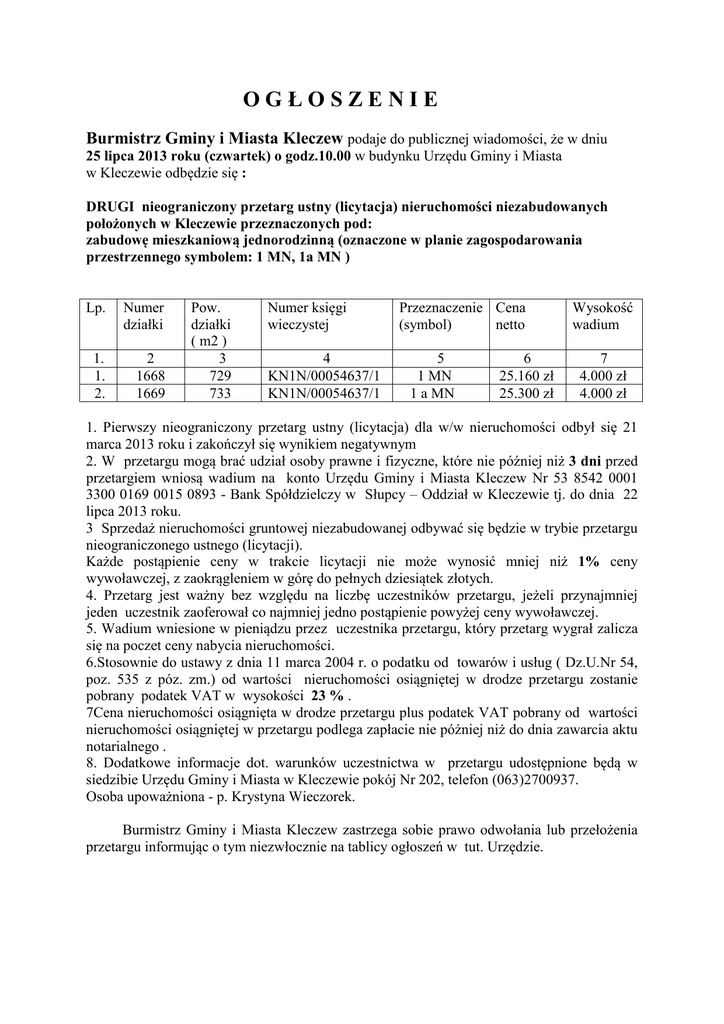 OGŁOSZENIE Burmistrz Gminy i Miasta Kleczew podaje do publicznej wiadomości, że w dniu 25 lipca 2013 roku (czwartek) o godz.10.00 w budynku Urzędu Gminy i Miasta w Kleczewie odbędzie się : DRUGI nieograniczony przetarg ustny (licytacja) nieruchomości niezabudowanych położonych w Kleczewie przeznaczonych pod: zabudowę mieszkaniową jednorodzinną (oznaczone w planie zagospodarowania przestrzennego symbolem: 1 MN, 1a MN ) Lp. Numer działki 1. 1. 2. 2 1668 1669 Pow. działki ( m2 ) 3 729 733 Numer księgi wieczystej 4 KN1N/00054637/1 KN1N/00054637/1 Przeznaczenie Cena (symbol) netto 5 1 MN 1 a MN 6 25.160 zł 25.300 zł Wysokość wadium 7 4.000 zł 4.000 zł 1. Pierwszy nieograniczony przetarg ustny (licytacja) dla w/w nieruchomości odbył się 21 marca 2013 roku i zakończył się wynikiem negatywnym 2. W przetargu mogą brać udział osoby prawne i fizyczne, które nie później niż 3 dni przed przetargiem wniosą wadium na konto Urzędu Gminy i Miasta Kleczew Nr 53 8542 0001 3300 0169 0015 0893 - Bank Spółdzielczy w Słupcy – Oddział w Kleczewie tj. do dnia 22 lipca 2013 roku. 3 Sprzedaż nieruchomości gruntowej niezabudowanej odbywać się będzie w trybie przetargu nieograniczonego ustnego (licytacji). Każde postąpienie ceny w trakcie licytacji nie może wynosić mniej niż 1% ceny wywoławczej, z zaokrągleniem w górę do pełnych dziesiątek złotych. 4. Przetarg jest ważny bez względu na liczbę uczestników przetargu, jeżeli przynajmniej jeden uczestnik zaoferował co najmniej jedno postąpienie powyżej ceny wywoławczej. 5. Wadium wniesione w pieniądzu przez uczestnika przetargu, który przetarg wygrał zalicza się na poczet ceny nabycia nieruchomości. 6.Stosownie do ustawy z dnia 11 marca 2004 r. o podatku od towarów i usług ( Dz.U.Nr 54, poz. 535 z póz. zm.) od wartości nieruchomości osiągniętej w drodze przetargu zostanie pobrany podatek VAT w wysokości 23 % . 7Cena nieruchomości osiągnięta w drodze przetargu plus podatek VAT pobrany od wartości nieruchomości osiągniętej w przetargu podlega zapłacie nie później niż do dnia zawarcia aktu notarialnego . 8. Dodatkowe informacje dot. warunków uczestnictwa w przetargu udostępnione będą w siedzibie Urzędu Gminy i Miasta w Kleczewie pokój Nr 202, telefon (063)2700937. Osoba upoważniona - p. Krystyna Wieczorek. Burmistrz Gminy i Miasta Kleczew zastrzega sobie prawo odwołania lub przełożenia przetargu informując o tym niezwłocznie na tablicy ogłoszeń w tut. Urzędzie.