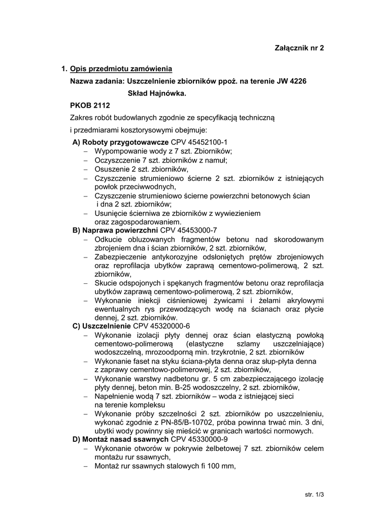 Załącznik nr 2 1. Opis przedmiotu zamówienia Nazwa zadania: Uszczelnienie zbiorników ppoż. na terenie JW 4226 Skład Hajnówka. PKOB 2112 Zakres robót budowlanych zgodnie ze specyfikacją techniczną i przedmiarami kosztorysowymi obejmuje: A) Roboty przygotowawcze CPV 45452100-1 Wypompowanie wody z 7 szt. Zbiorników; Oczyszczenie 7 szt. zbiorników z namuł; Osuszenie 2 szt. zbiorników, Czyszczenie strumieniowo ścierne 2 szt. zbiorników z istniejących powłok przeciwwodnych, Czyszczenie strumieniowo ścierne powierzchni betonowych ścian i dna 2 szt. zbiorników; Usunięcie ścierniwa ze zbiorników z wywiezieniem oraz zagospodarowaniem. B) Naprawa powierzchni CPV 45453000-7 Odkucie obluzowanych fragmentów betonu nad skorodowanym zbrojeniem dna i ścian zbiorników, 2 szt. zbiorników, Zabezpieczenie antykorozyjne odsłoniętych prętów zbrojeniowych oraz reprofilacja ubytków zaprawą cementowo-polimerową, 2 szt. zbiorników, Skucie odspojonych i spękanych fragmentów betonu oraz reprofilacja ubytków zaprawą cementowo-polimerową, 2 szt. zbiorników, Wykonanie iniekcji ciśnieniowej żywicami i żelami akrylowymi ewentualnych rys przewodzących wodę na ścianach oraz płycie dennej, 2 szt. zbiorników. C) Uszczelnienie CPV 45320000-6 Wykonanie izolacji płyty dennej oraz ścian elastyczną powłoką cementowo-polimerową (elastyczne szlamy uszczelniające) wodoszczelną, mrozoodporną min. trzykrotnie, 2 szt. zbiorników Wykonanie faset na styku ściana-płyta denna oraz słup-płyta denna z zaprawy cementowo-polimerowej, 2 szt. zbiorników, Wykonanie warstwy nadbetonu gr. 5 cm zabezpieczającego izolację płyty dennej, beton min. B-25 wodoszczelny, 2 szt. zbiorników, Napełnienie wodą 7 szt. zbiorników – woda z istniejącej sieci na terenie kompleksu Wykonanie próby szczelności 2 szt. zbiorników po uszczelnieniu, wykonać zgodnie z PN-85/B-10702, próba powinna trwać min. 3 dni, ubytki wody powinny się mieścić w granicach wartości normowych. D) Montaż nasad ssawnych CPV 45330000-9 Wykonanie otworów w pokrywie żelbetowej 7 szt. zbiorników celem montażu rur ssawnych, Montaż rur ssawnych stalowych fi 100 mm, str. 1/3 Montaż nasad ssawnych węży pożarniczych 110 z gwintem wewnętrznym na końcach rur, Montaż koszów ssawnych prostych 110 z polietylenu z gwintem zewnętrznym, Wypełnienie zaprawą szczelin między rurą a krawędziami otworów oraz zaizolowanie lepikiem asfaltowym na zimno, Uzupełnienie ubytków w betonie. UWAGA: szczegółowy zakres robót do realizacji określa niniejszy opis przedmiotu zamówienia, specyfikacja techniczna wykonania i odbioru robót oraz przedmiar robót. Przyjęte w opisach technologie i materiały podające producentów określają wymagania techniczne i dopuszcza się stosowanie zamienników materiałowych, które nie obniżą wartości użytkowej i jakościowej wykonanych elementów zamówienia. 1. 2. 3. 4. 5. 6. 7. 8. Warunki realizacji robót: Roboty będą wykonywane w czynnym zakładzie w dni powszednie od poniedziałku do czwartku w godzinach 730 do 1500, w piątek w godzinach 730 do 1230 praca w innych godzinach oraz w dni wolne od pracy, tylko po pisemnym zaakceptowaniu przez Użytkownika. Obowiązkiem Wykonawcy przed rozpoczęciem robót jest dostarczenie listy pracowników i wykaz sprzętu uczestniczących w zadaniu oraz fotografii osób uczestniczących w wykonaniu zadania celem wykonania przepustek tymczasowych przez służby ochrony. Wykonawca robót (kierownik budowy) w pełni odpowiada za bezpieczeństwo i higienę pracy w miejscu realizacji robót oraz za zachowanie bezpieczeństwa pożarowego. Roboty należy prowadzić zgodnie z Rozporządzeniem Ministra Infrastruktury z dnia 06.02.2003 r. (Dz. U. 2003 Nr 47 poz. 401) w sprawie bezpieczeństwa i higieny pracy podczas wykonywania robót budowlanych. Wykonawca zobowiązany jest pokryć koszty zużycia energii elektrycznej, wody oraz odprowadzania ścieków związane z potrzebami wynikającymi w trakcie realizacji zadania. Wykonawca jest zobowiązany wykonywać roboty budowlane zgodnie z przepisami prawa budowlanego, zgłaszać do odbioru roboty zanikające i ulegające zakryciu. Wykonawca powinien przygotować zadanie do przekazania, wykonać do dnia odbioru i przedstawić Zamawiającemu komplet dokumentów budowy wymagany przepisami prawa budowlanego. Wykonawca powinien wstępnie posegregować materiały pochodzące z rozbiórki według rodzaju i grupy. Materiały, które są surowcami wtórnymi (złom) Wykonawca powinien przekazać do magazynu Sekcji Obsługi Infrastruktury Hajnówka. str. 2/3 Powstałe w wyniku prac budowalnych nieczystości płynne (zlewki, popłuczyny itp.) wykonawca gromadzi w szczelnych pojemnikach i wywozi na własny koszt poza teren Jednostki. 9. Materiały nie nadające się do powtórnego użycia lub wbudowania mają zostać zabezpieczone zgodnie z ustawą o odpadach, a następnie wywiezione z terenu budowy. Koszty składowania i wywozu odpadów poniesie Wykonawca. 10. Przed rozpoczęciem robót wszyscy pracownicy winni okazać aktualne szkolenie w zakresie informacji niejawnych zgodnie z Ustawą z dn. 5 sierpnia 2010r. o ochronie informacji niejawnych (Dz.U. z 2010r. nr 182 poz. 1228). W przypadku braku szkolenia z zakresu informacji niejawnych zostanie ono przeprowadzone przez pełnomocnika ochrony informacji niejawnych lub osobę przez niego upoważnioną. 11. Wykonawca/Podwykonawca zatrudniający obcokrajowców, przed rozpoczęciem przez nich prac, ma obowiązek zgłoszenia ich do Służby Kontrwywiadu Wojskowego zgodnie z Decyzją Nr 21/MON Ministra Obrony Narodowej z dnia 10.02.2012 roku w sprawie planowania i realizowania przedsięwzięć współpracy międzynarodowej w resorcie obrony narodowej (Dz. Urz. MON poz. 33). Po uzyskaniu stosownego zezwolenia wydanego przez Służbę Kontrwywiadu Wojskowego, Wykonawca/Podwykonawca ma obowiązek przedstawić niezwłocznie dokument Zamawiającemu. str. 3/3